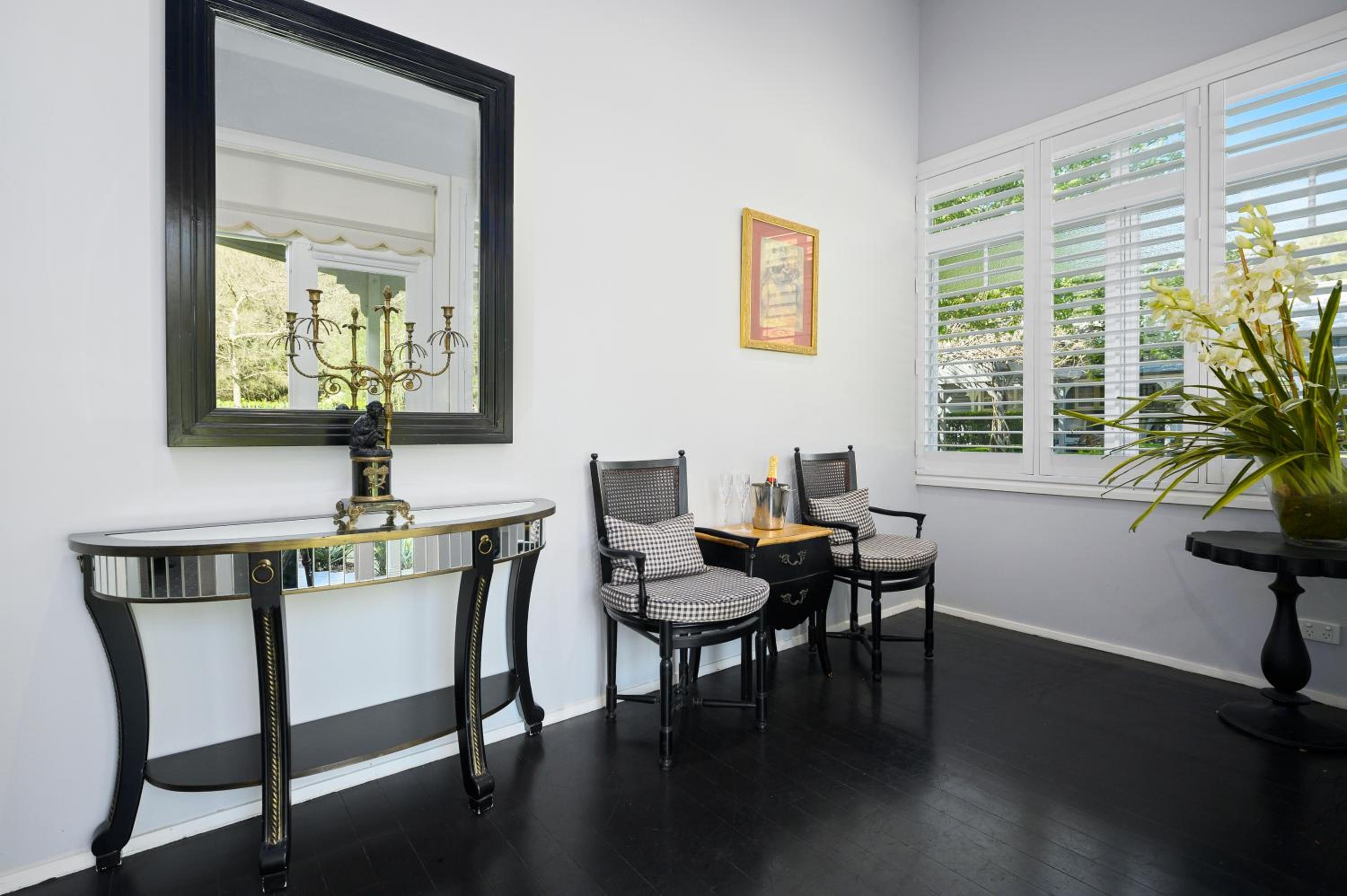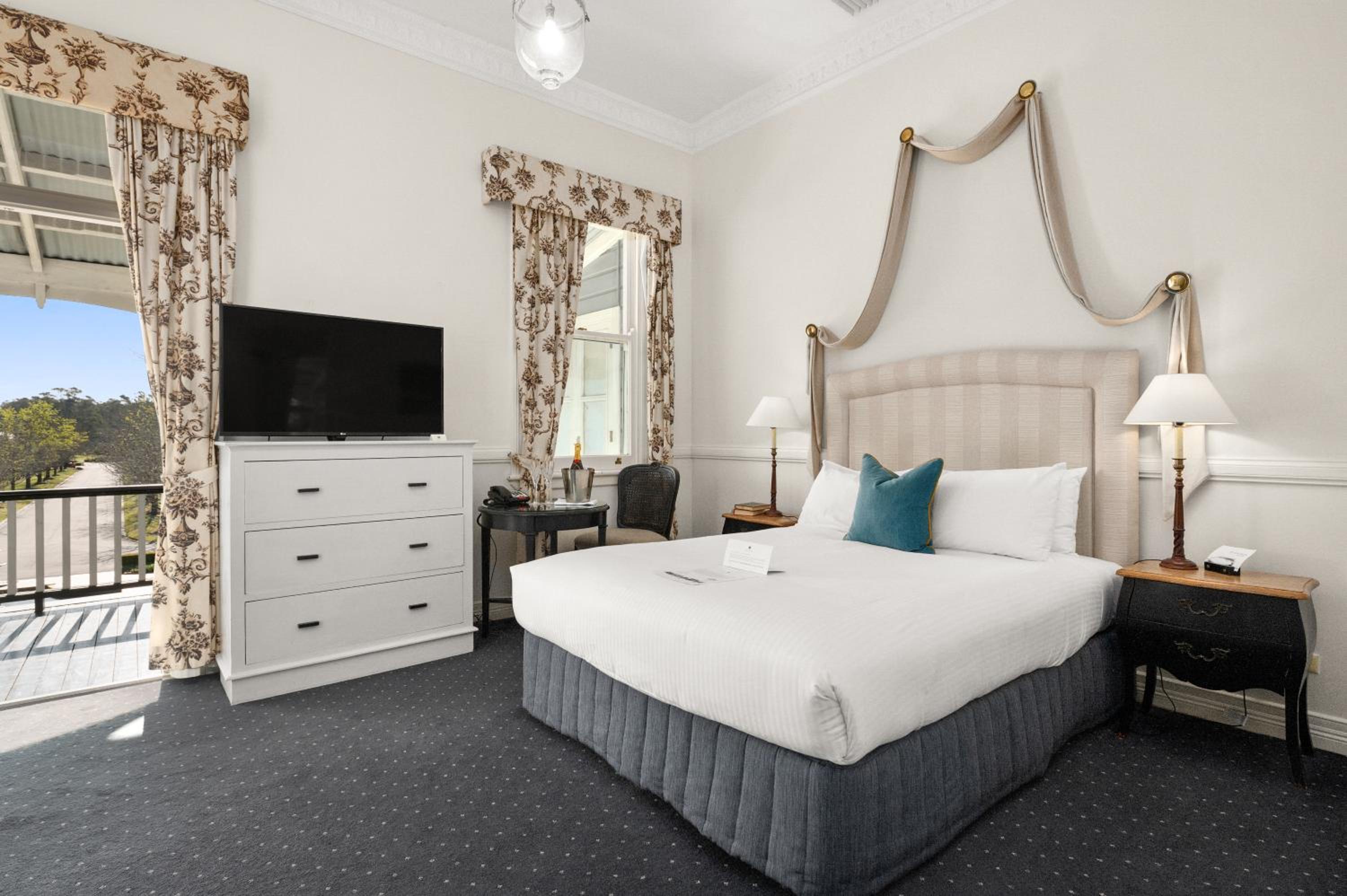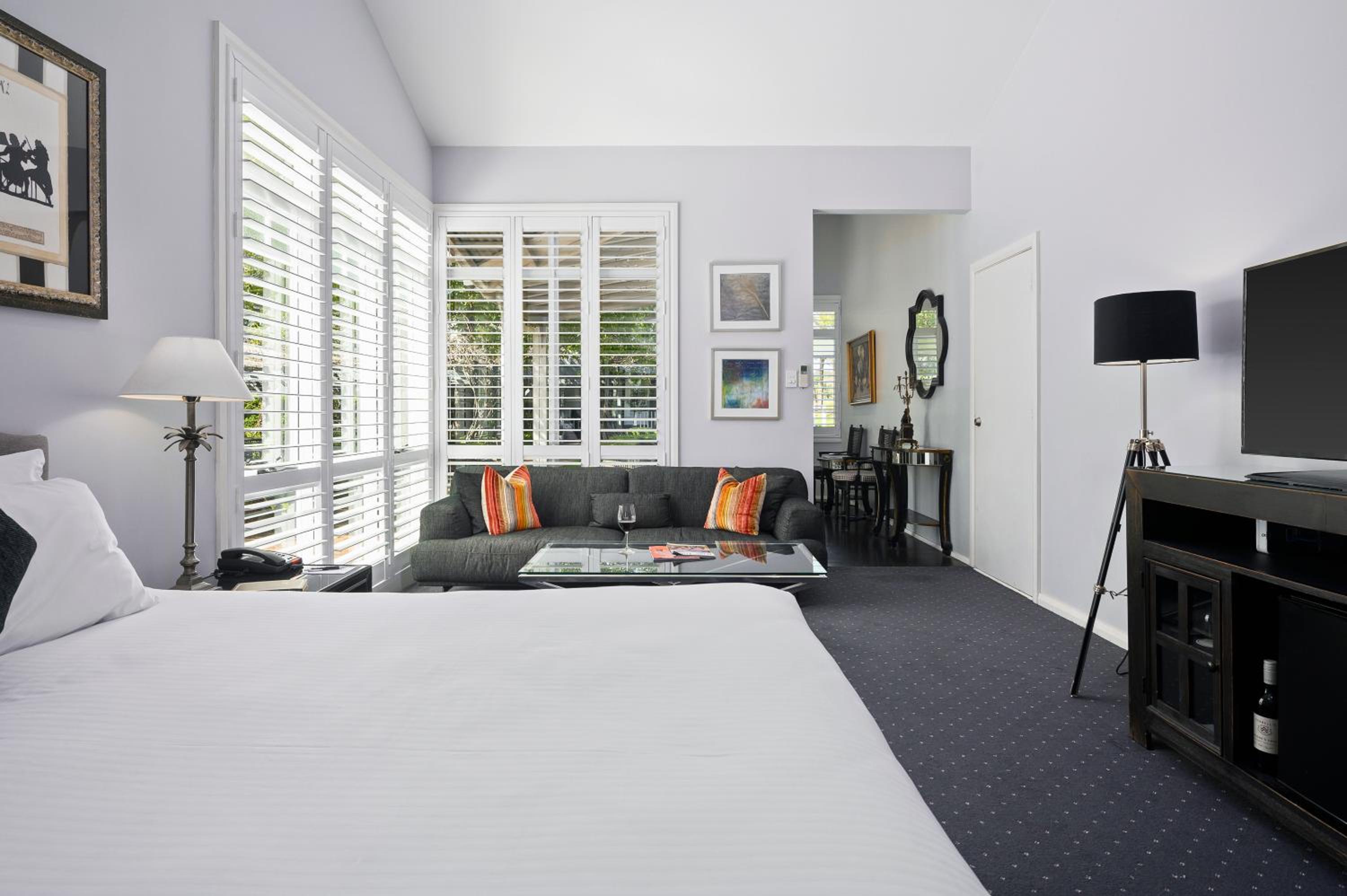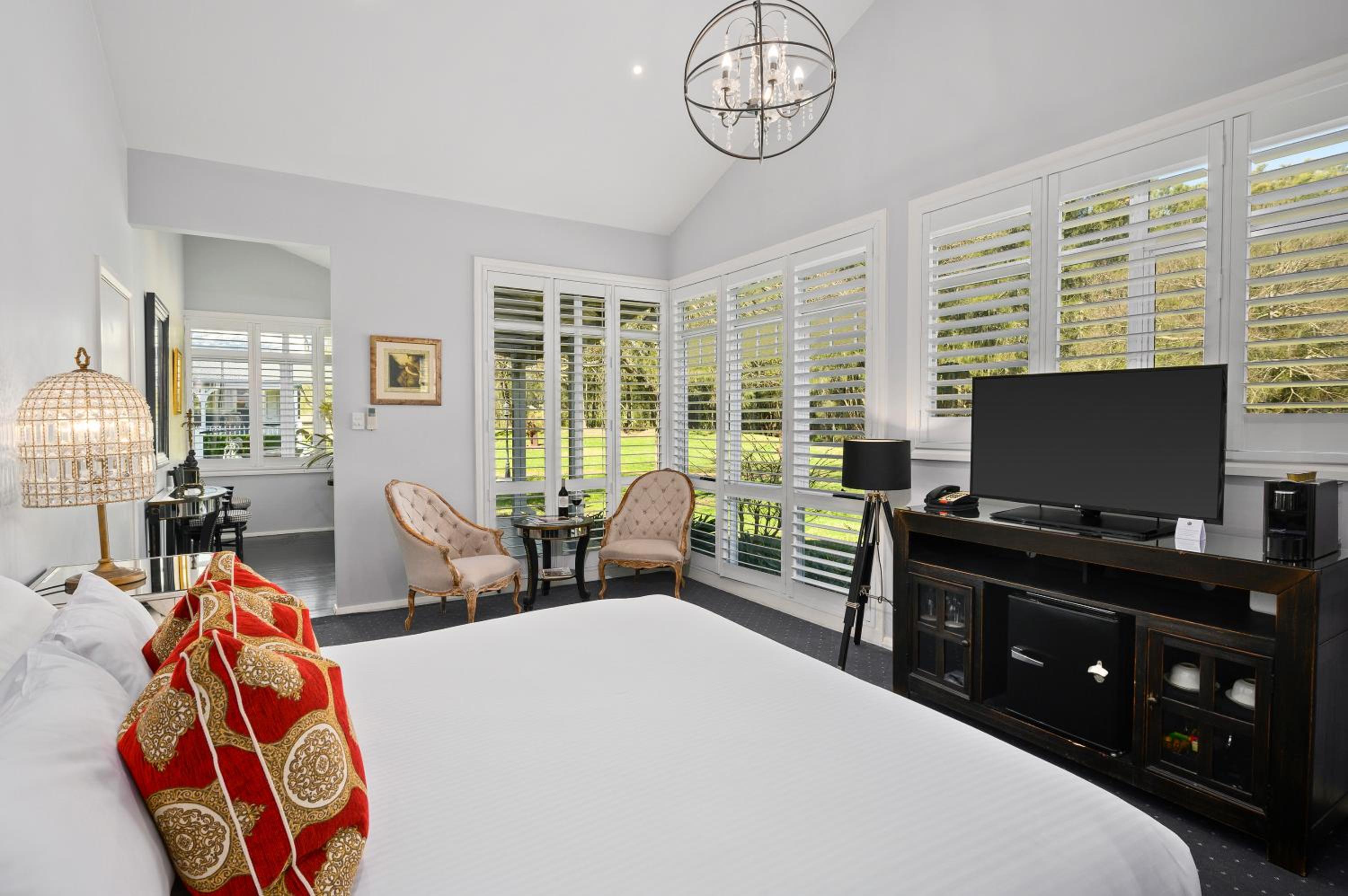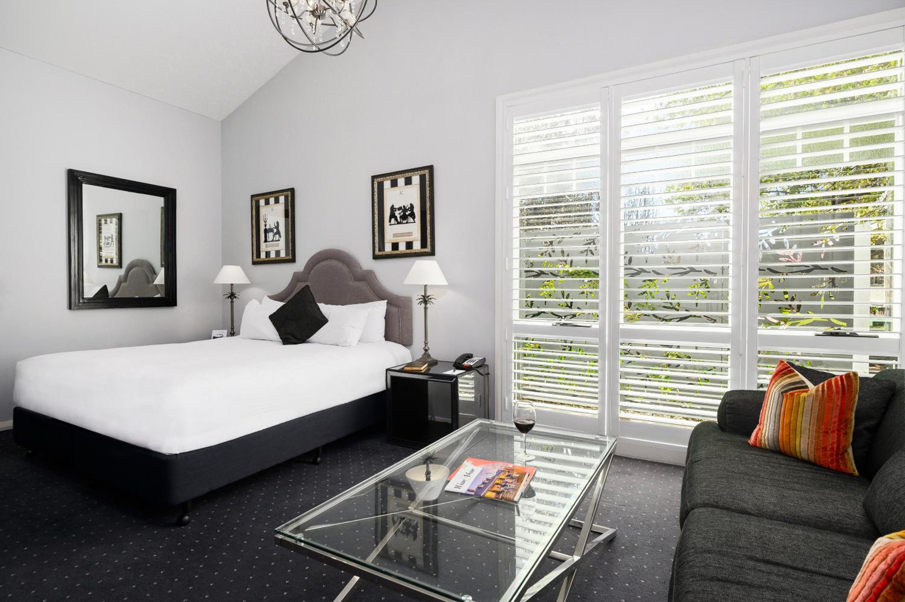 The Convent Hunter Valley Resort offers beautifully refurbished rooms with French doors and verandas overlooking lush gardens and vineyards. Each room is elegantly furnished, featuring modern amenities like LCD TVs, comfortable double beds, and unique decor pieces. The en suite bathrooms are equipped with luxurious grooming essentials, ensuring a pampering stay.