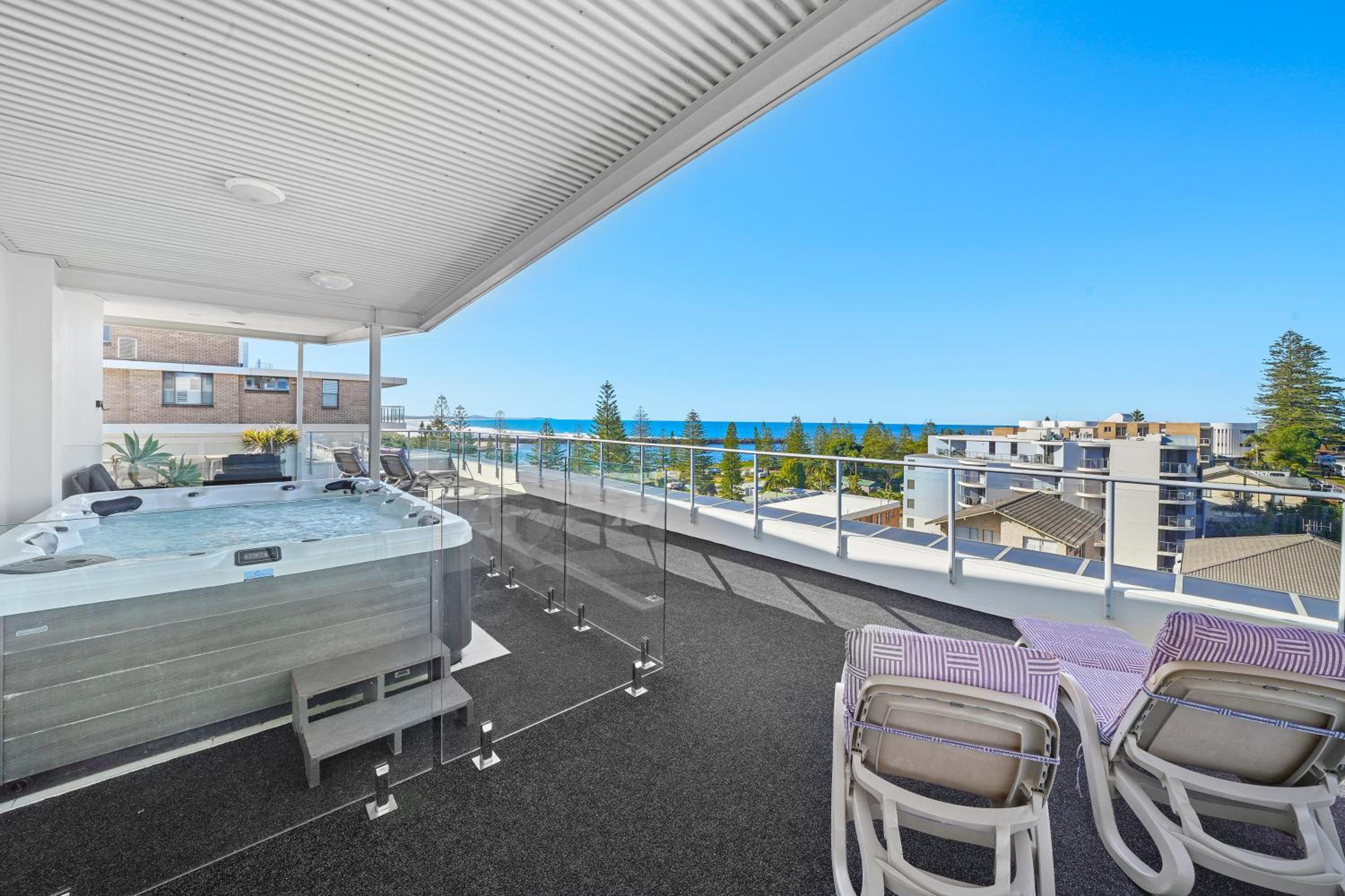 Experience luxury at Macquarie Waters Boutique Apartment Hotel with a rooftop hot tub offering stunning ocean views. Relax and unwind in style while enjoying the picturesque scenery.