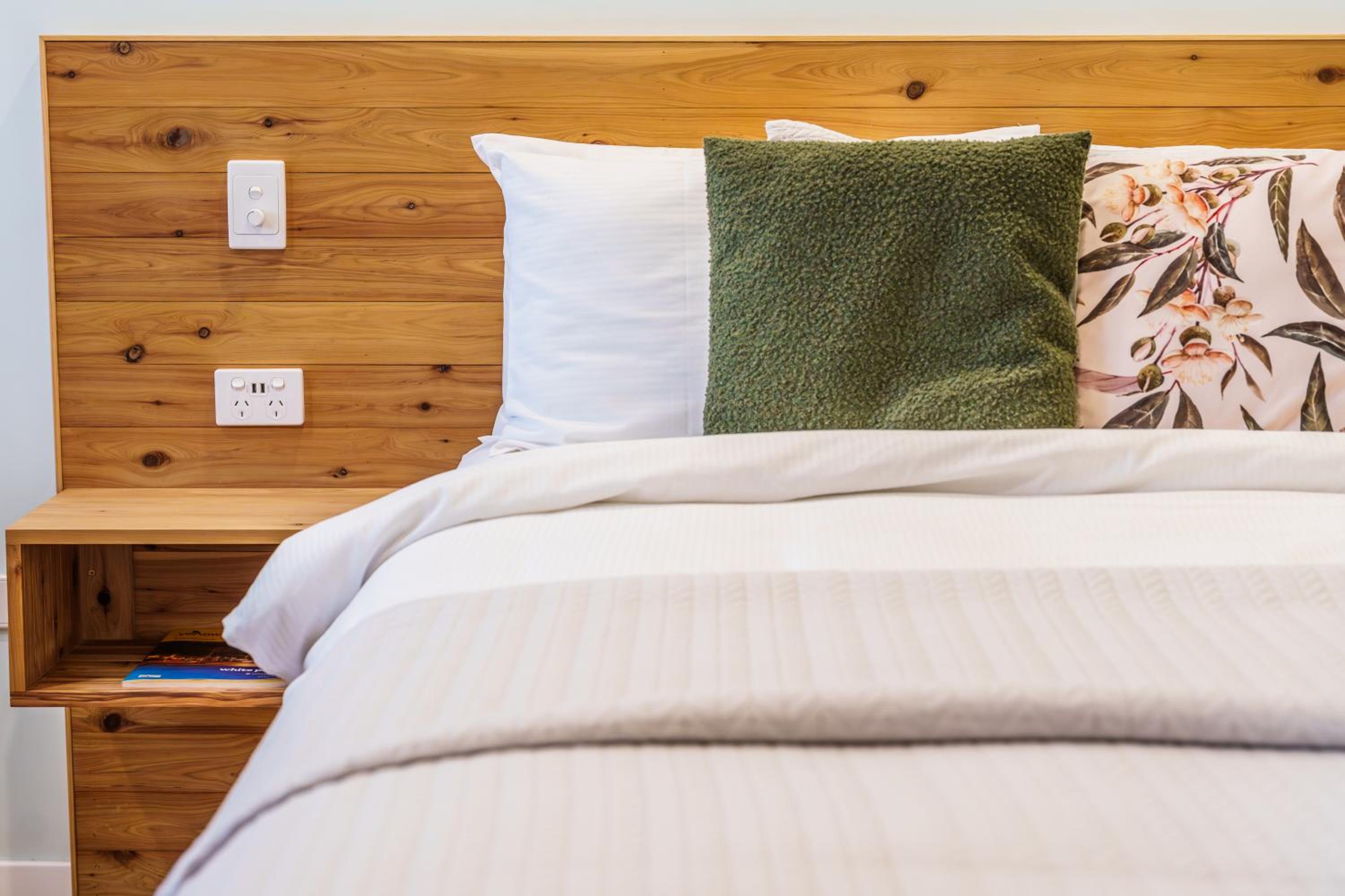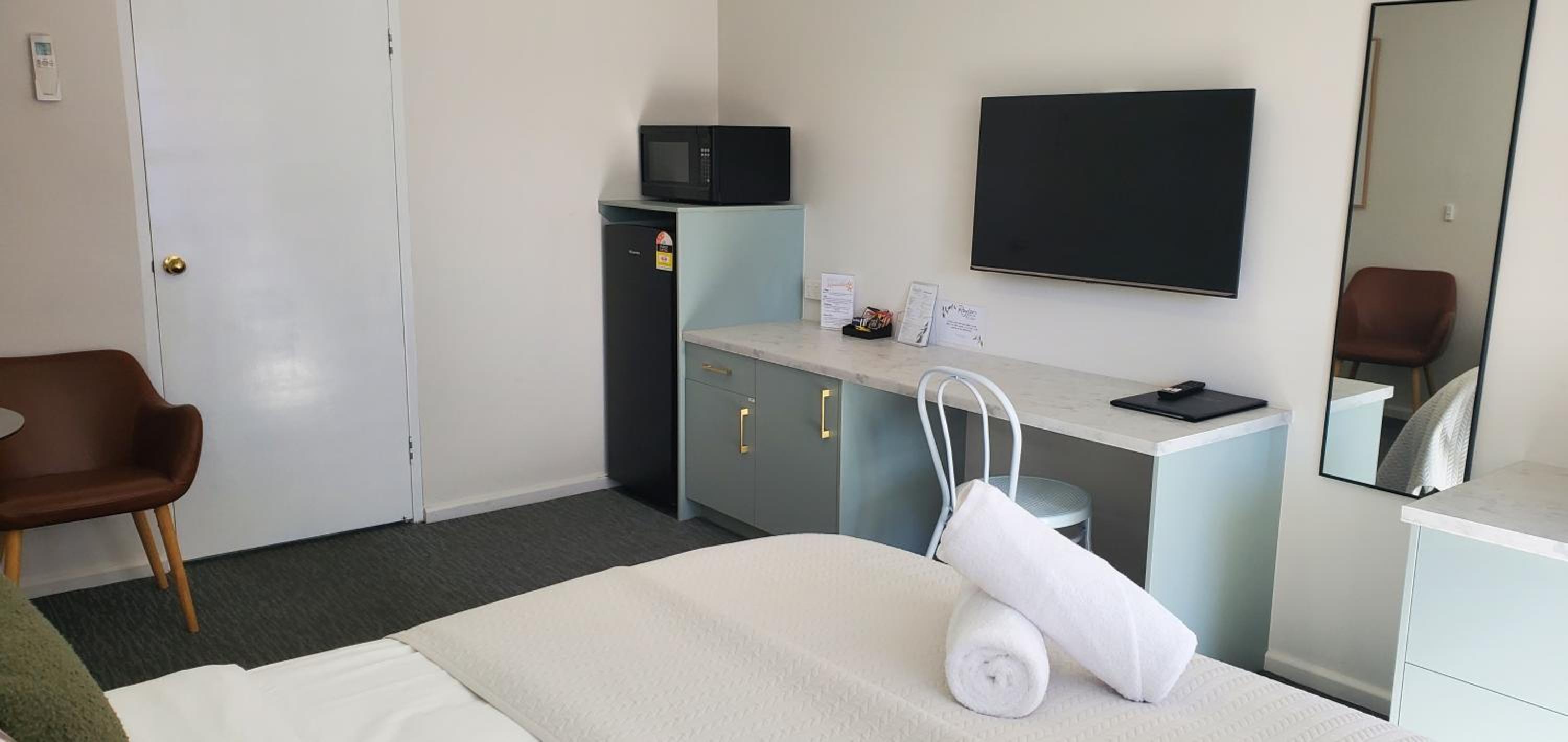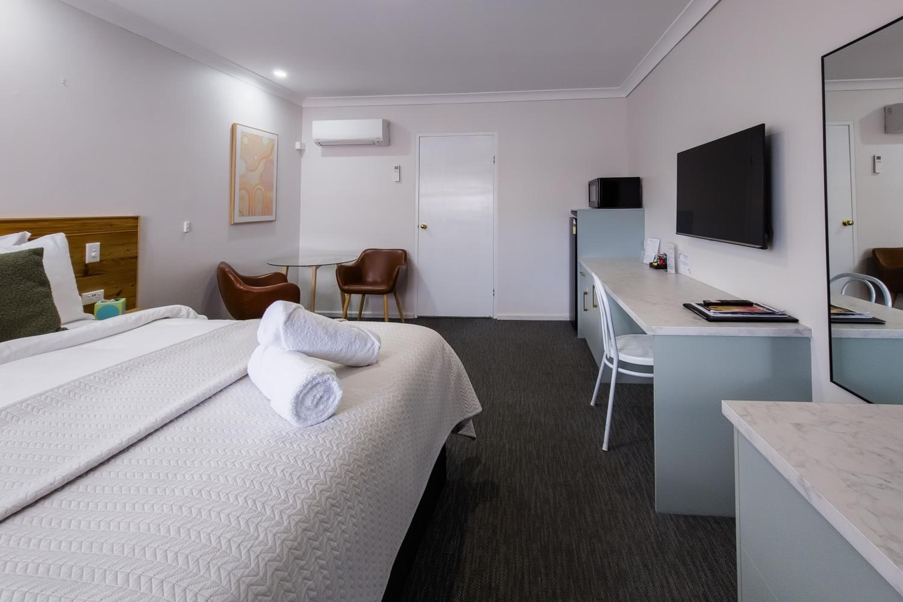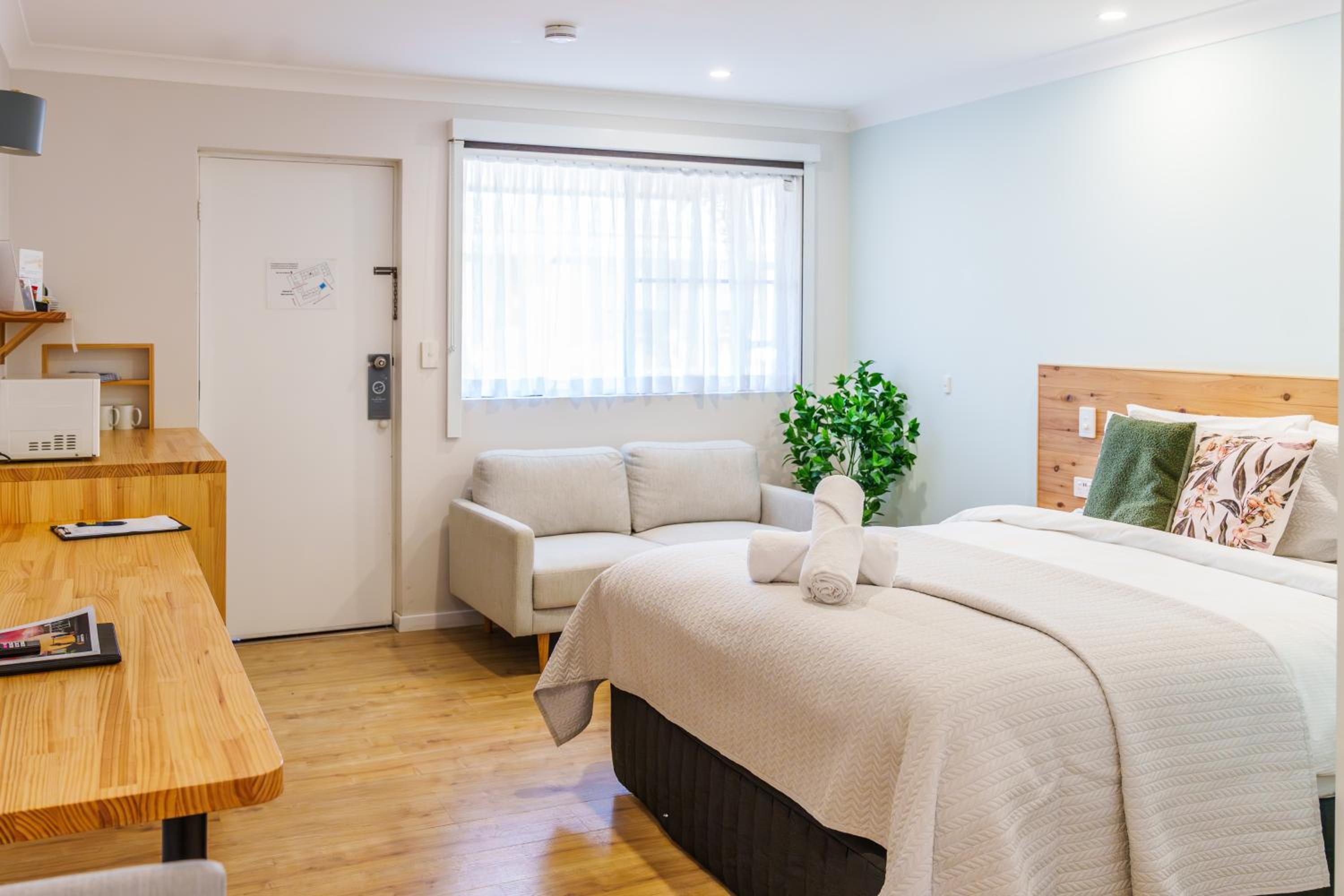 The decor/colour of the room was lovely (very calm & relaxing).. The timber floor covering was great, no smelly strong carpet cleaner smells to tolerate (we were grateful that our room was dog friendly). The basic kitchenette facilities were great, as was the outdoor/undercover barbecue area close to our room. They even give you a barbecue tray which was fabulous. Comfy beds, great shower. Very quiet room despite being close to the highway. Staff provided excellwnt service. Pool was great. Overall a great place to stay.