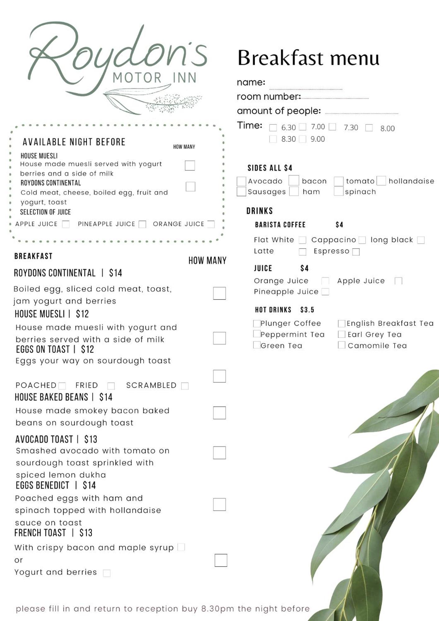 Start your day right with our daily breakfast offering a variety of options including à la carte, continental, or Full English/Irish. Don't miss out on the chance to experience true comfort and convenience at Roydons Motor Inn.