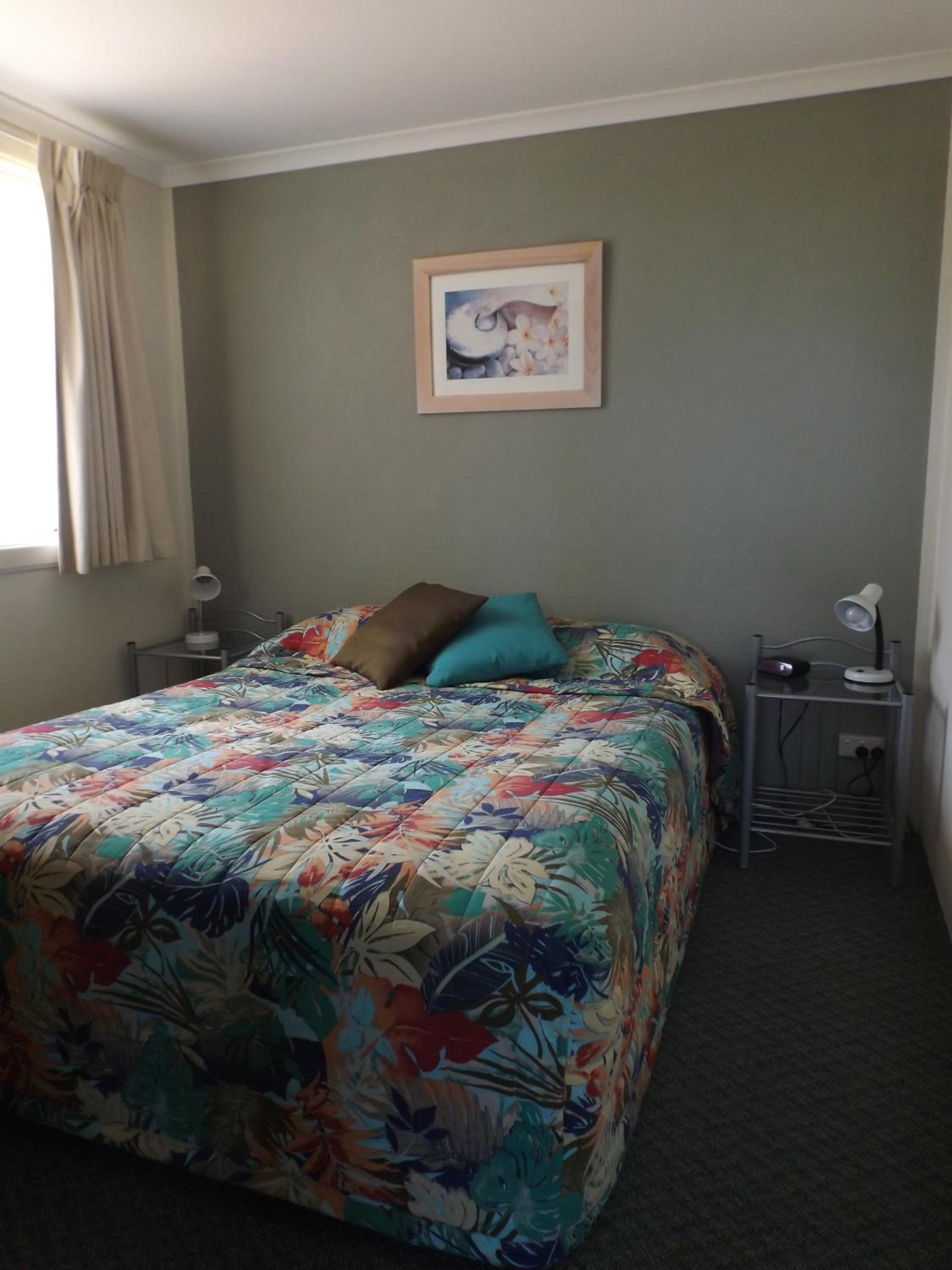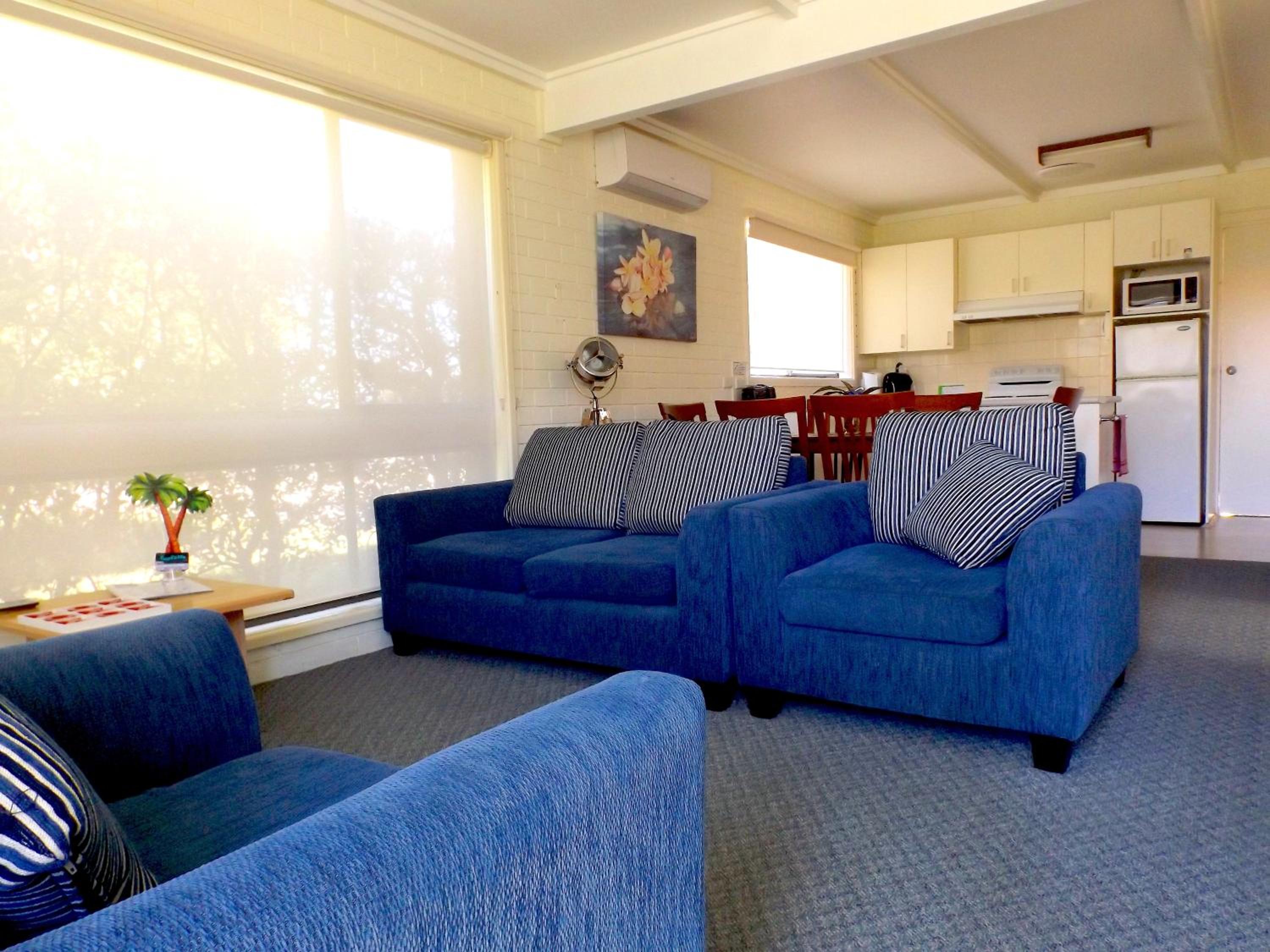 Each self-contained apartment features reverse cycle air-conditioning, a spacious living room, flat-screen TV, DVD player, and a fully equipped kitchen.