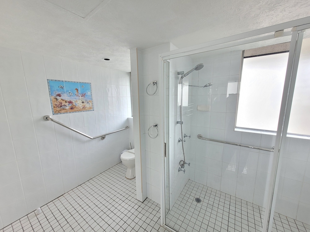 Perfect location opposite beach. Pool area open (not crowded in a small space), full sun with lovely grassed area.