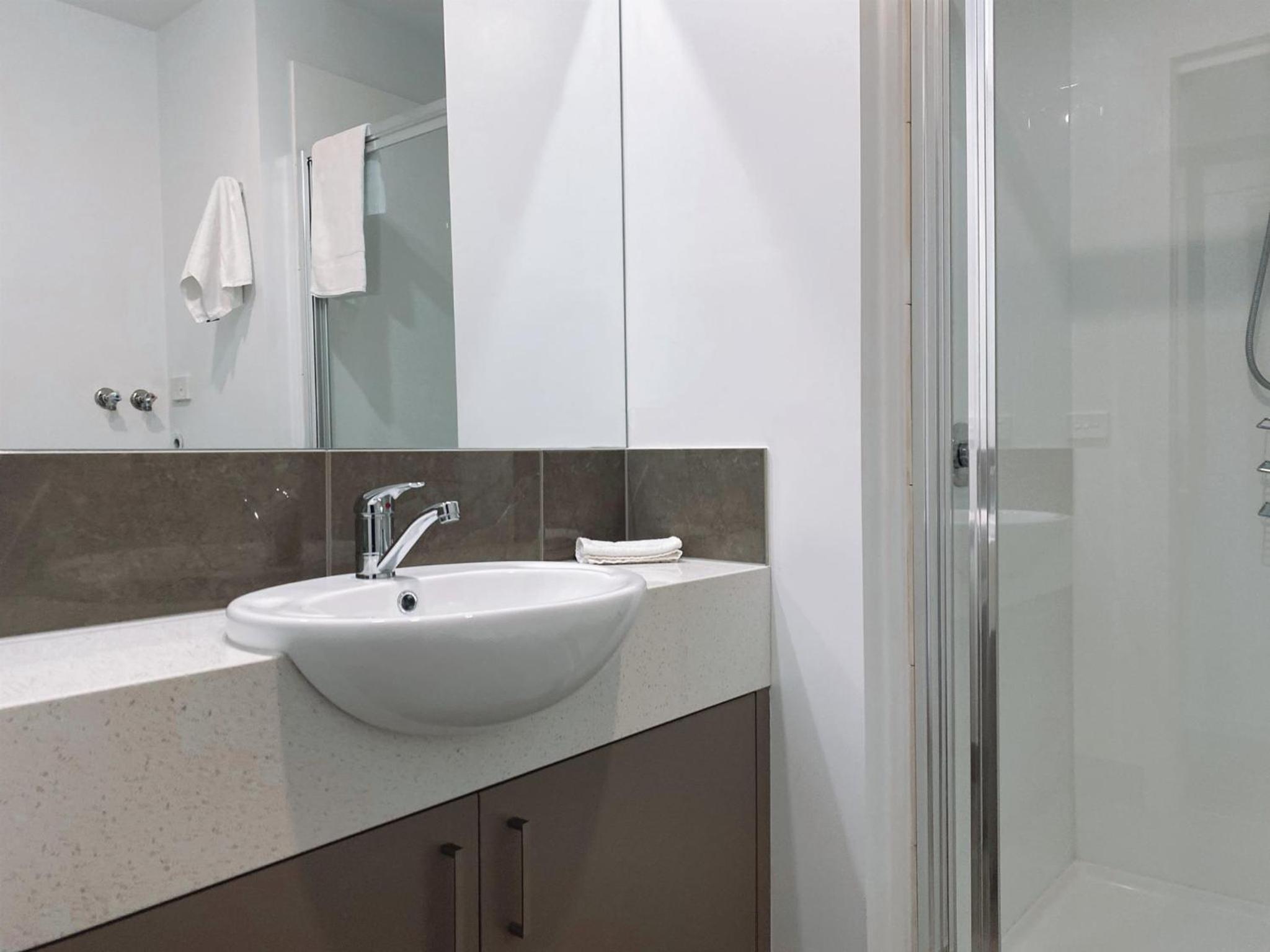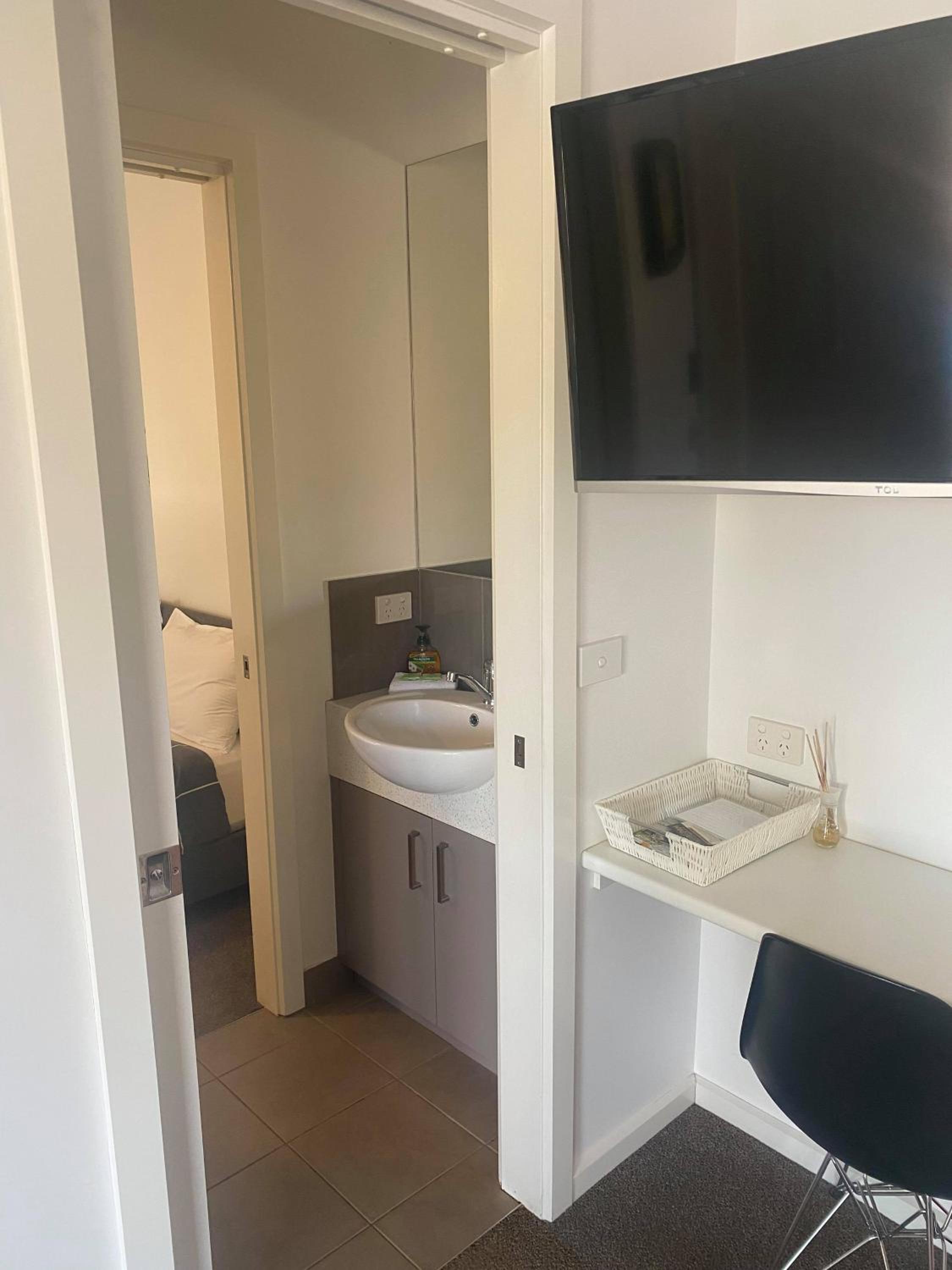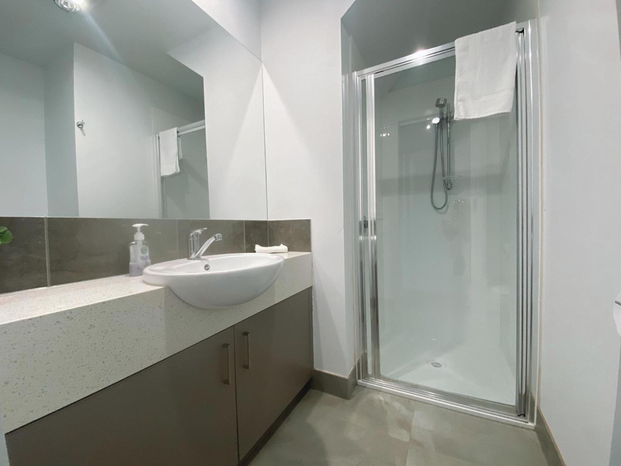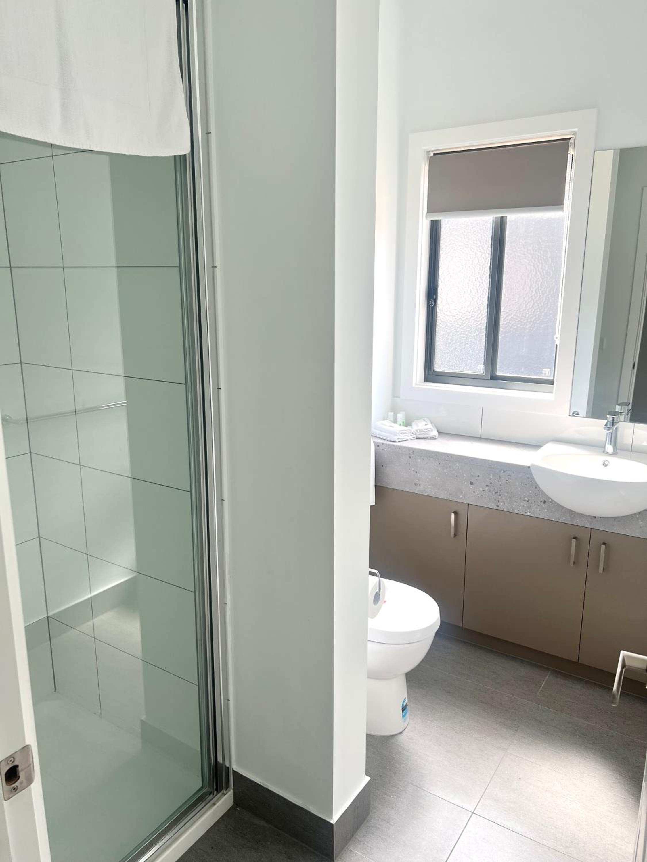 No towel rack or bench space in ensuite.