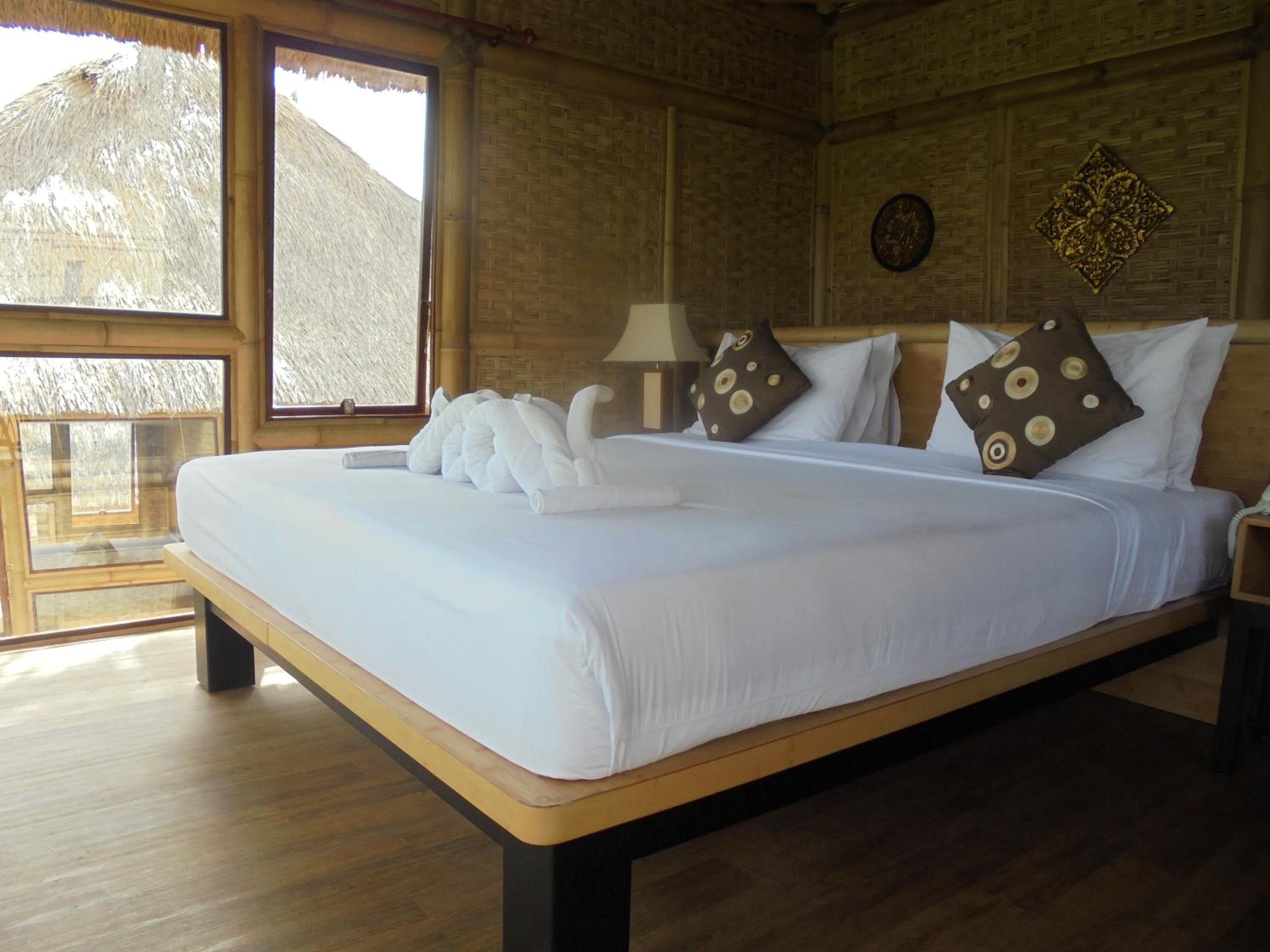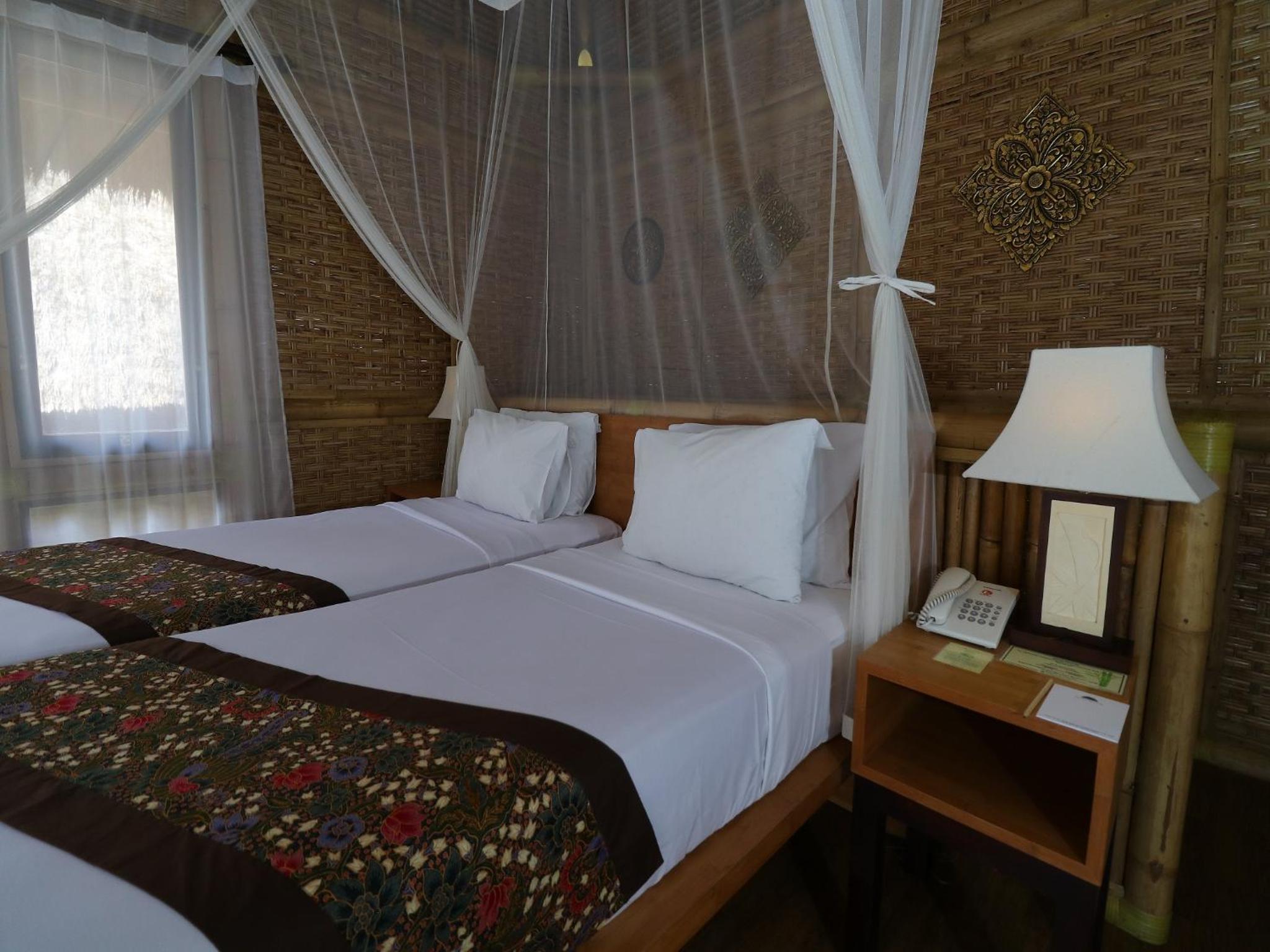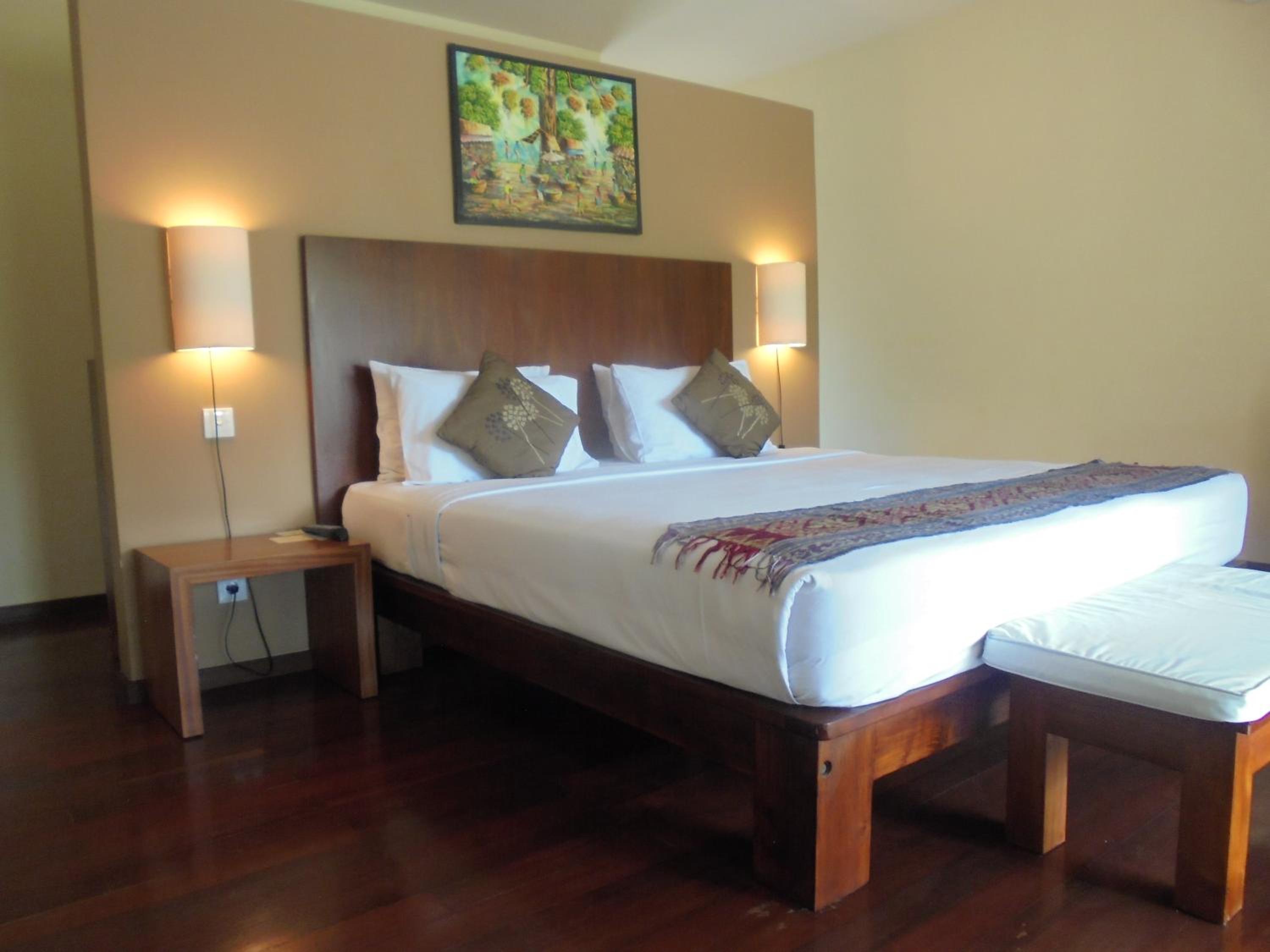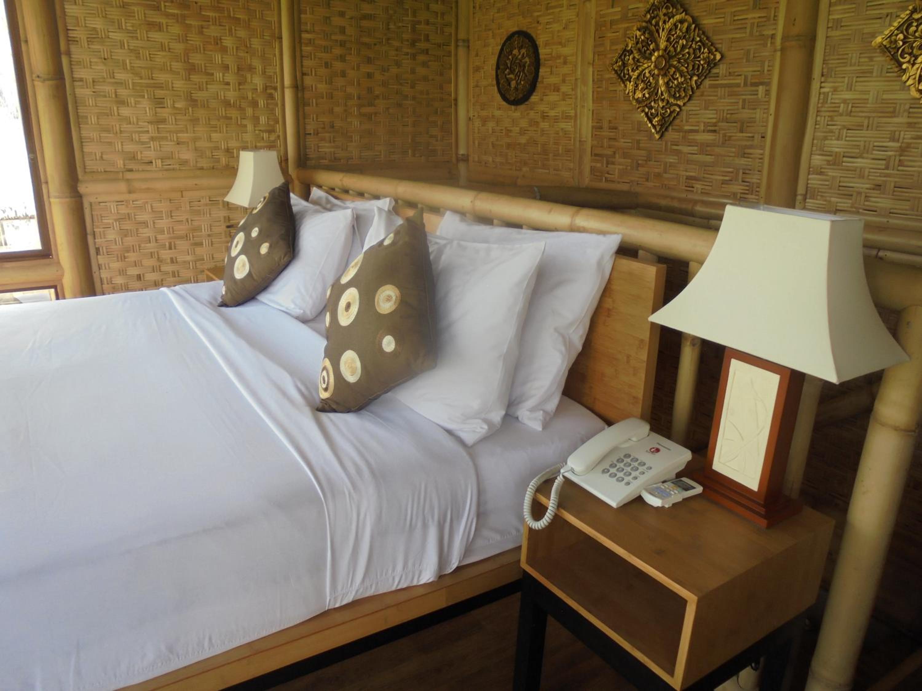 A coté de champs de riz et du centre ville,, moustiquaire sur le lit, air conditionné suffisant malgré les trous d'une cabane en bambou, bouilloire avec thé café. bon petit déjeuner , 3 piscines ! amabilité du personnel en toutes circonstances , proche du centre ville et du supermarché.