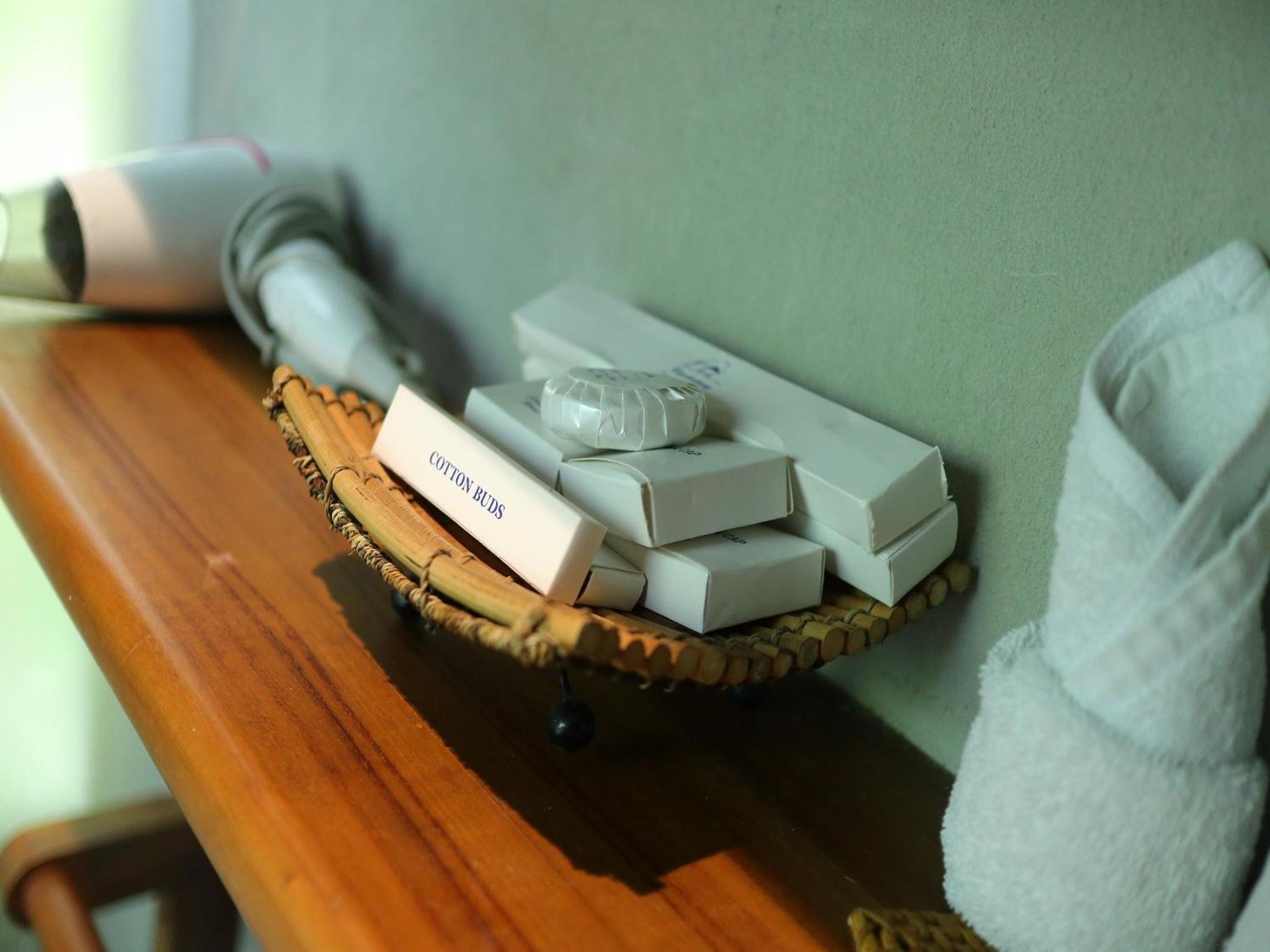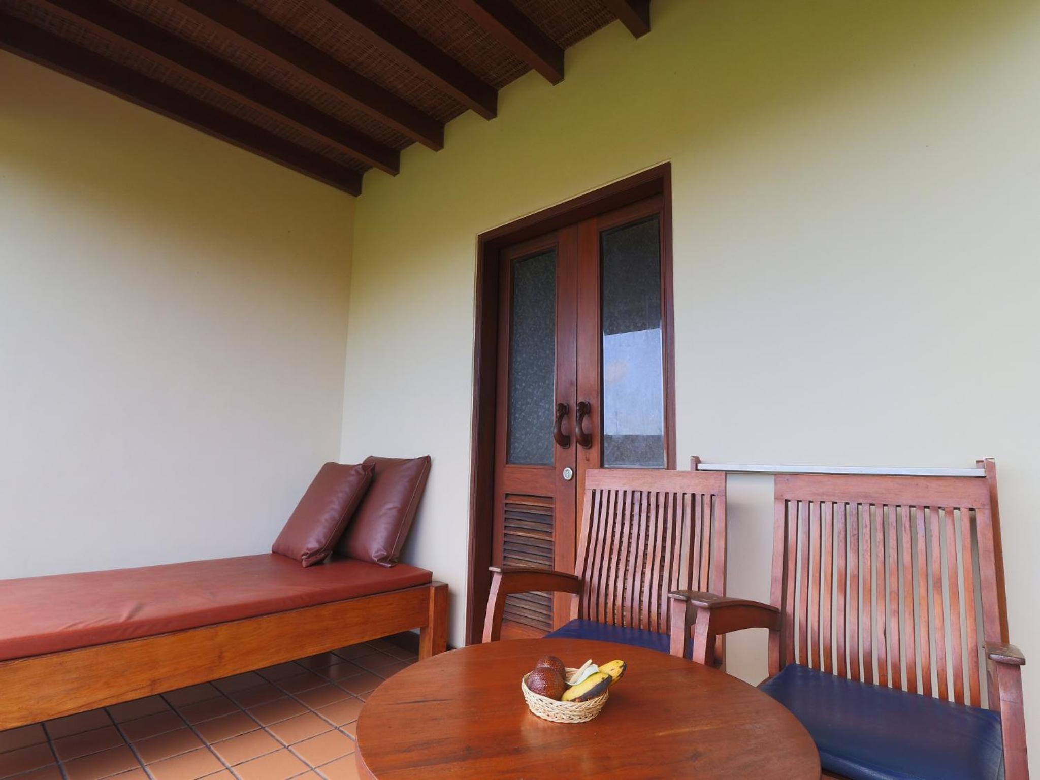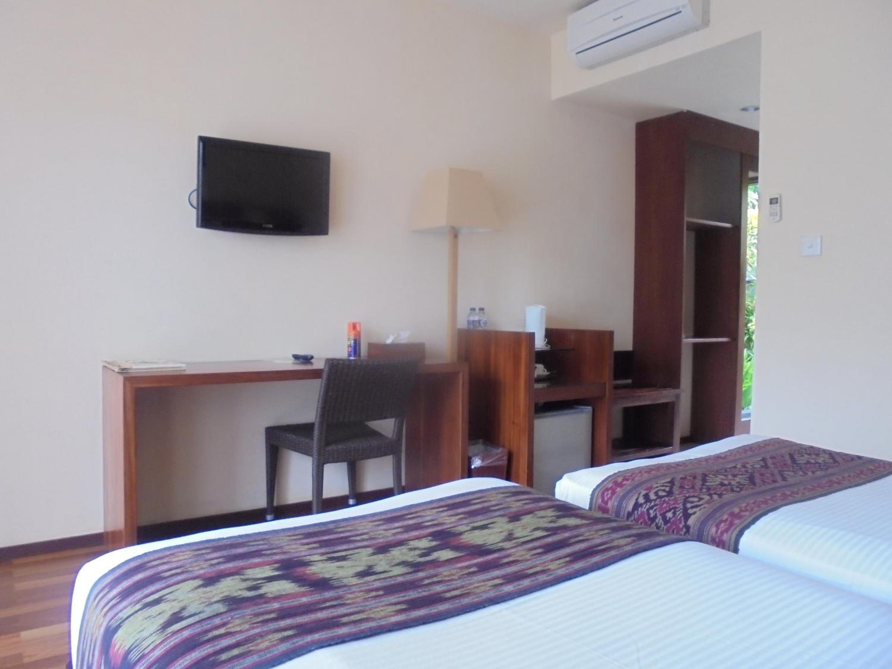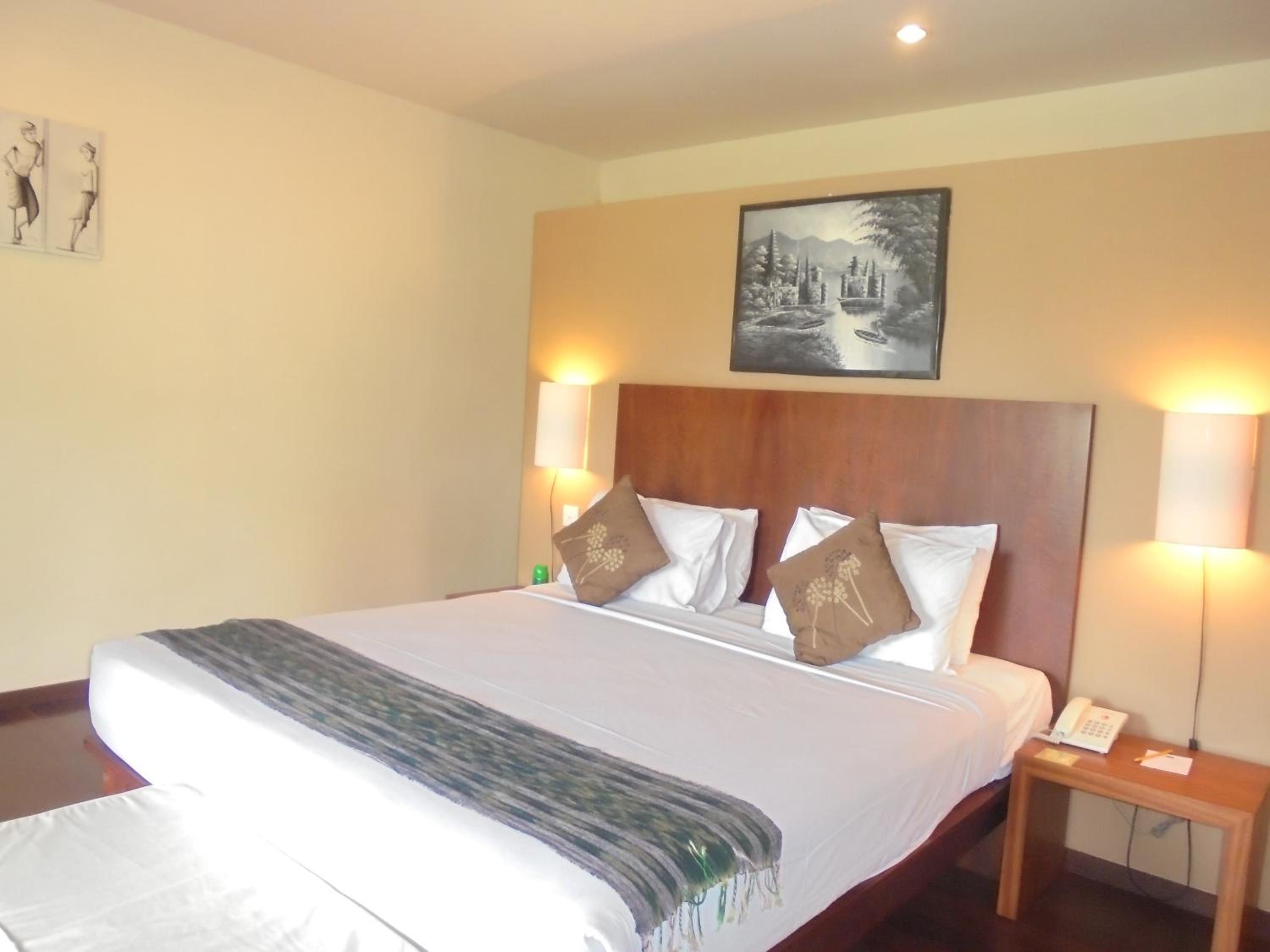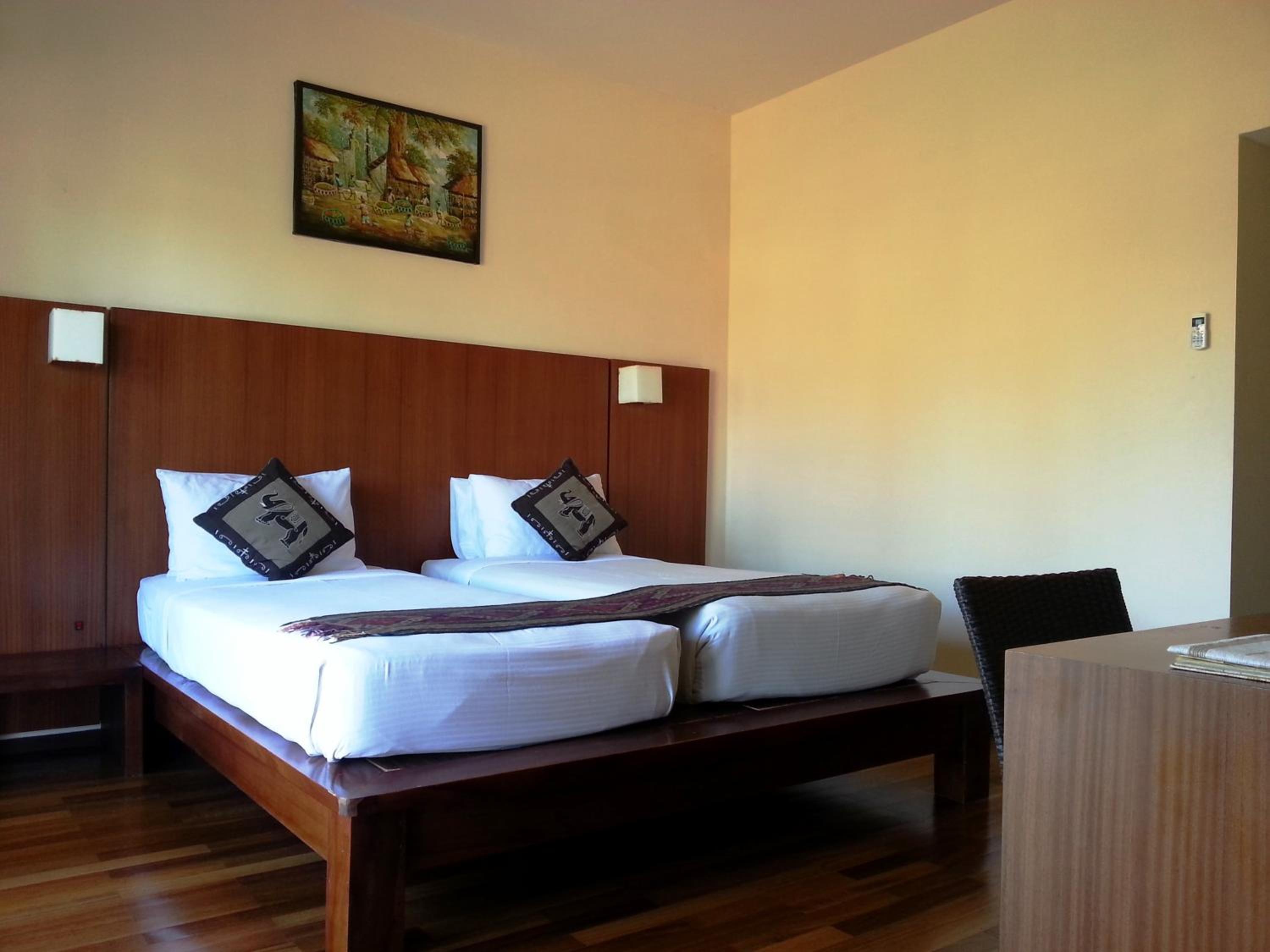 A coté de champs de riz et du centre ville,, moustiquaire sur le lit, air conditionné suffisant malgré les trous d'une cabane en bambou, bouilloire avec thé café. bon petit déjeuner , 3 piscines ! amabilité du personnel en toutes circonstances , proche du centre ville et du supermarché.