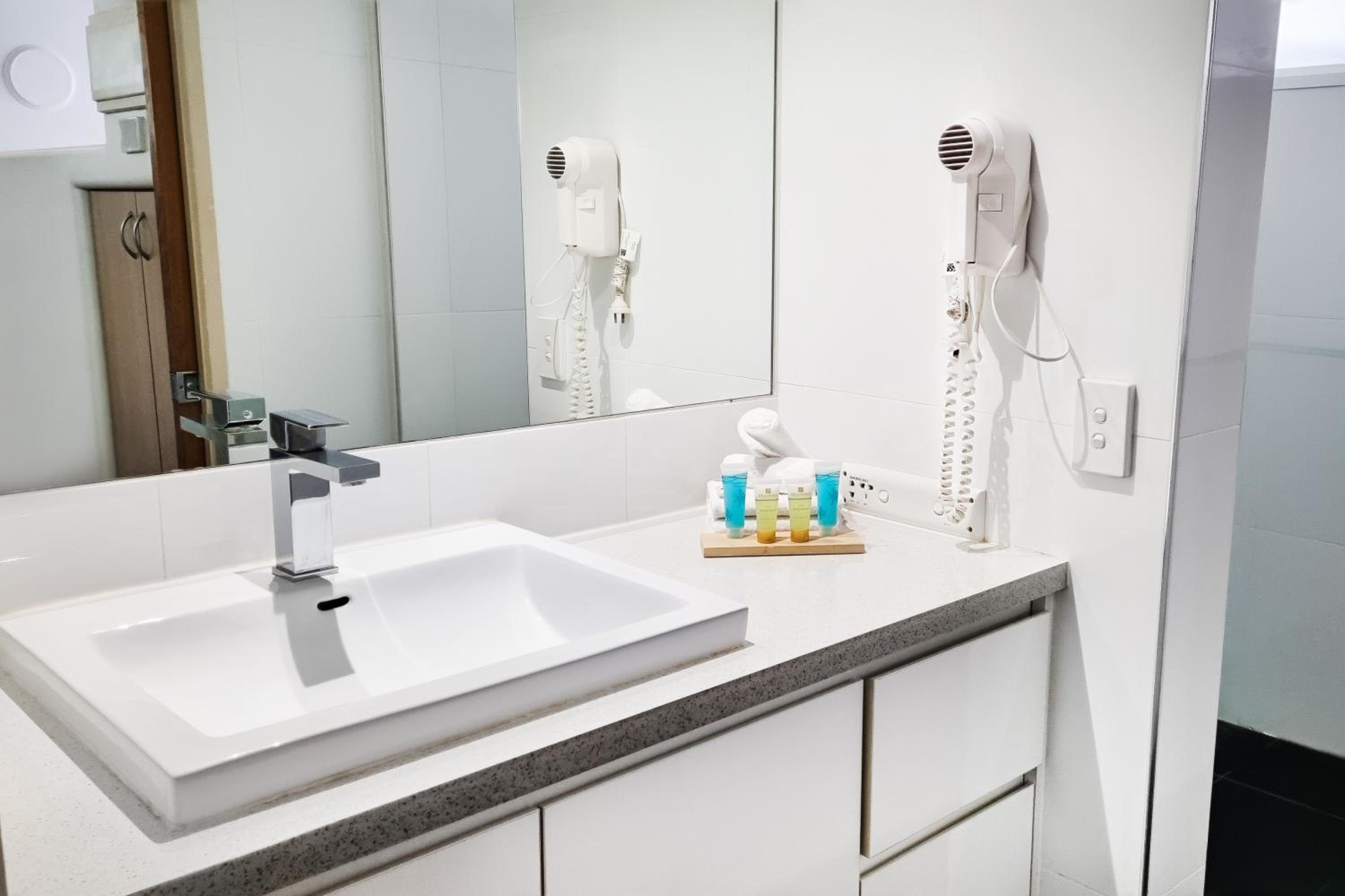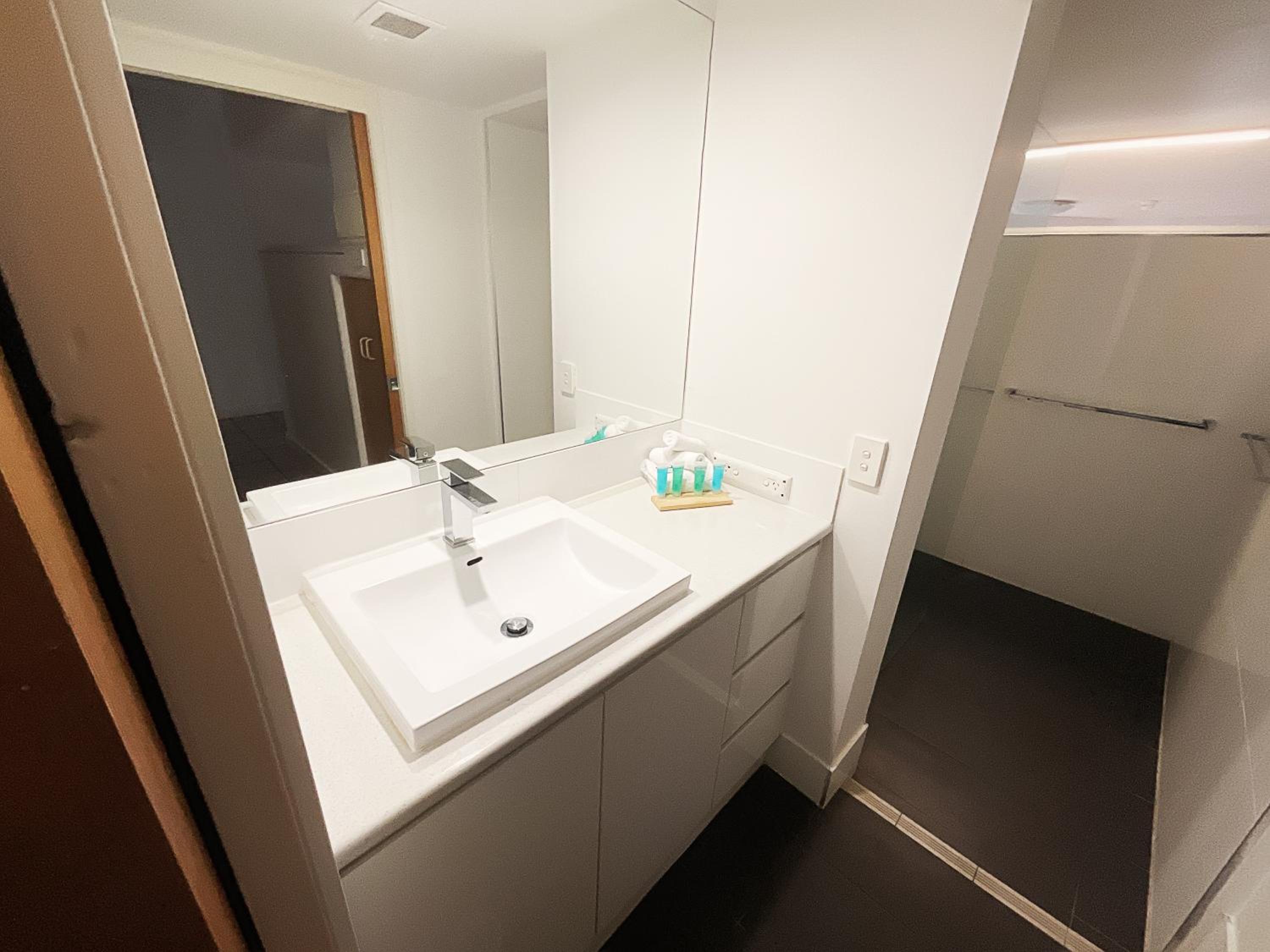 The furniture is old and creaky and mismatched. The bathroom is surprisingly new compared to the rest of the room with good sized vanity but very poor lighting and only one power point. The shower head was awful with terrible water pressure. You have to stand up against the wall to get wet. And the tiles were mouldy. The pool area looked like it used to be great once upon a time. Now it’s old and tired with cones over broken tiles. No pool towels in the room either.