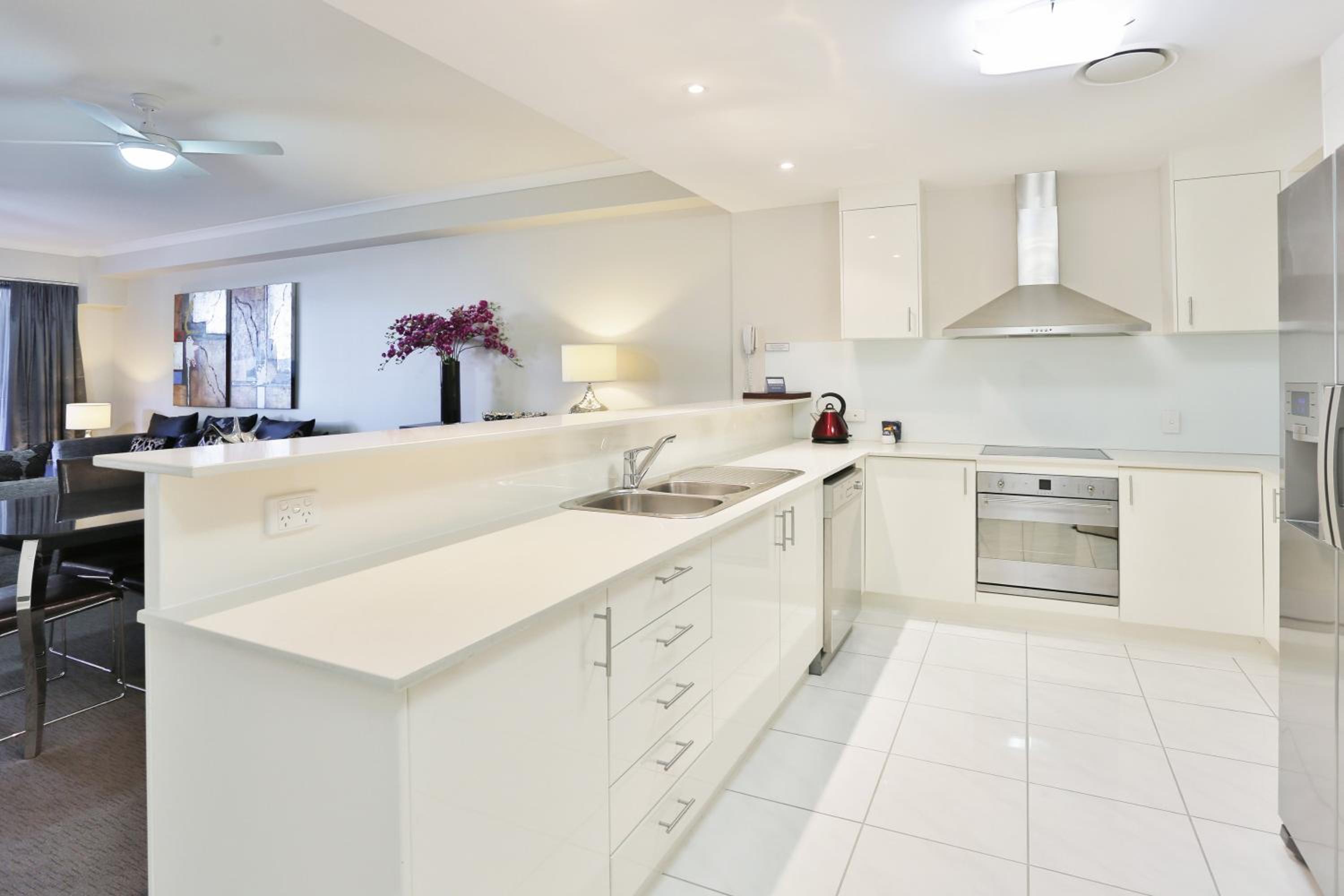 Love the apartment we had on 4th floor. Very spacious, well appointed. Kitchen had everything we could ever need. Great sized fridge/freezer and ceramic cooktop with oven, dishwasher, microwave and Nespresso coffee machine. Location was fabulous. Walk across the road to the beach and short walk to restaurants, takeaways and Beach Hotel nearby too. Pool, spa and kiddies pool amazing!! Parking garage had plenty of space .l Manager couple were friendly and efficient and Tuxedo is just gorgeous!!