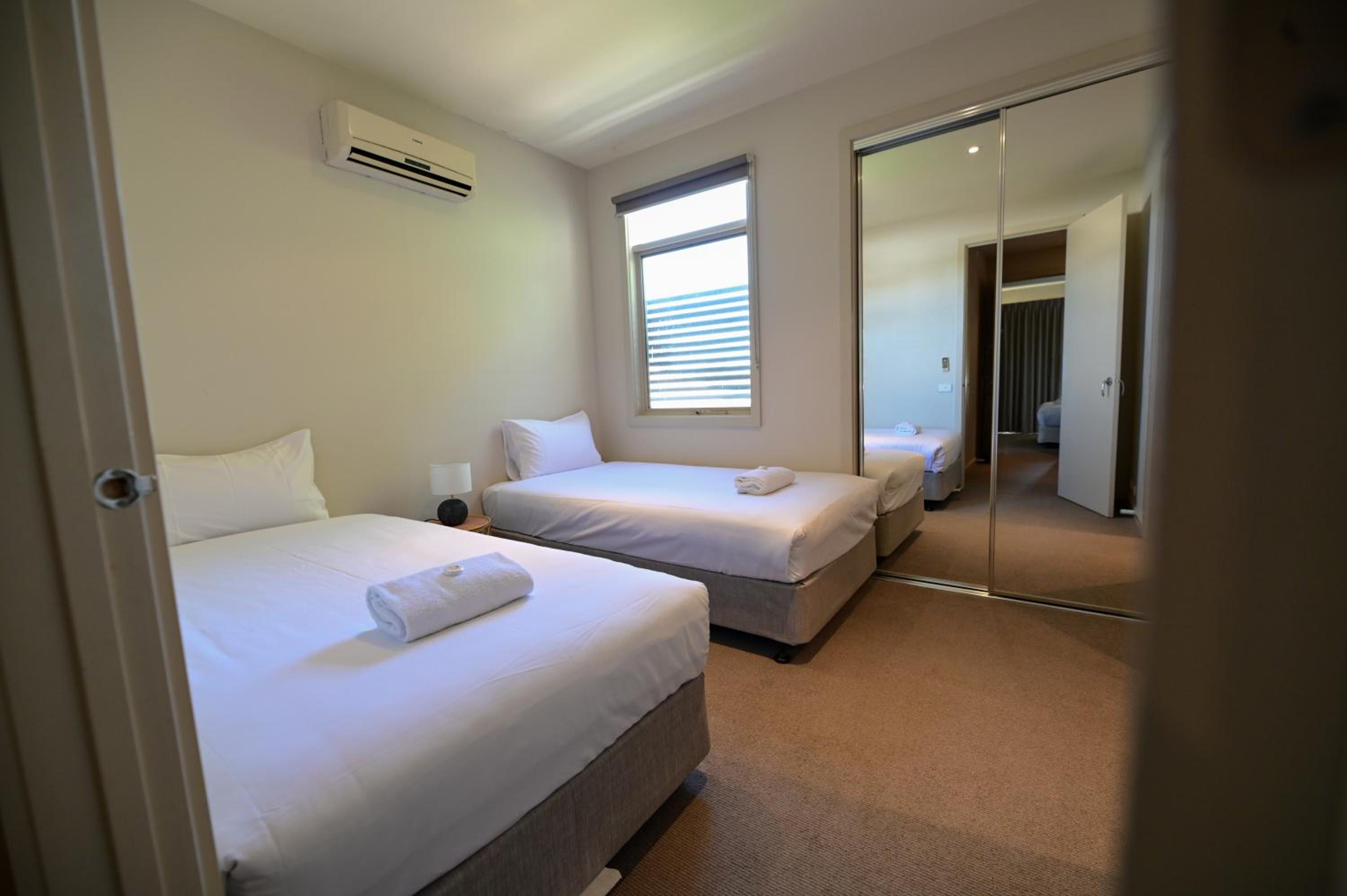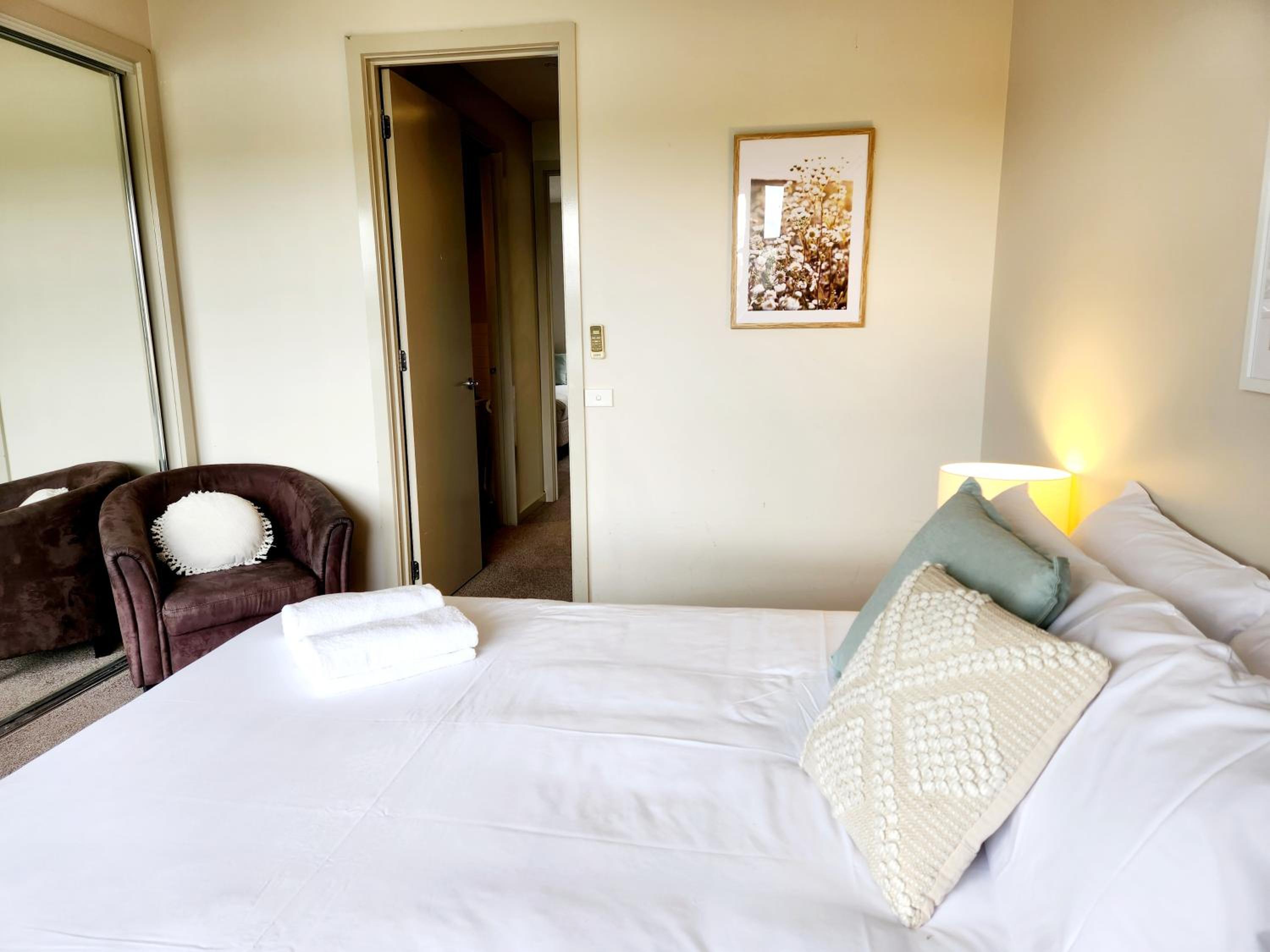 Was a little bit dirty, dust/dirt/fluff in corners. One of the beds were not made up for sleeping in, only one working split system remote between two rooms, empty cardboard boxes and plastic left in the wardrobe of the second bedroom. the downstairs split system needs looking at as it is very noisy. We only had 2 towels for 4 people, the management of the property however were very prompt in arranging additional towels but they did not turn up until the afternoon of the next day (from the cleaning contractors). The apartment needs work to fix scratches etc on the walls and in the second bedroom there is a big stain on the roof
