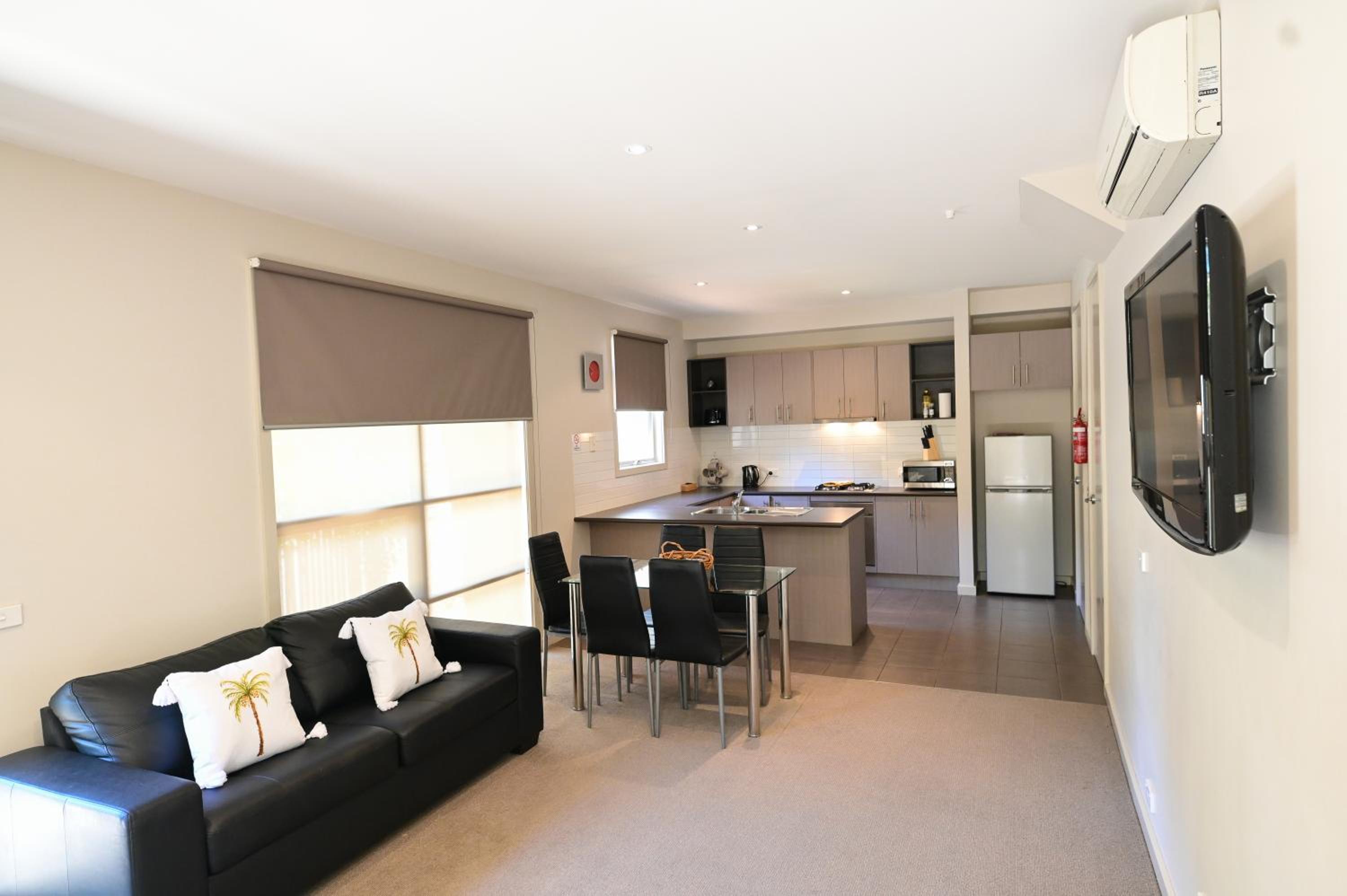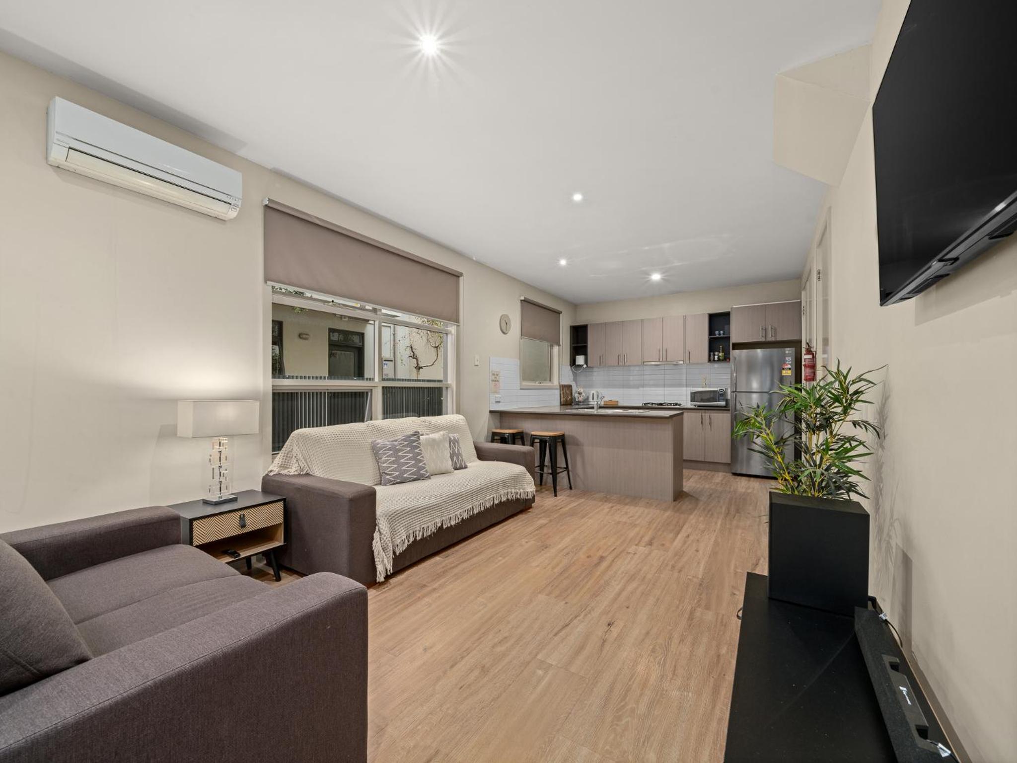 Indulge in the fully equipped kitchen and unwind in the spa bath available in select apartments. Enjoy the spacious living area with entertainment options like a flat-screen TV and DVD player.
