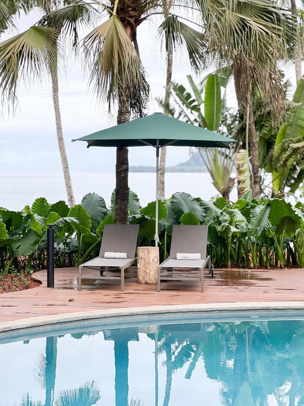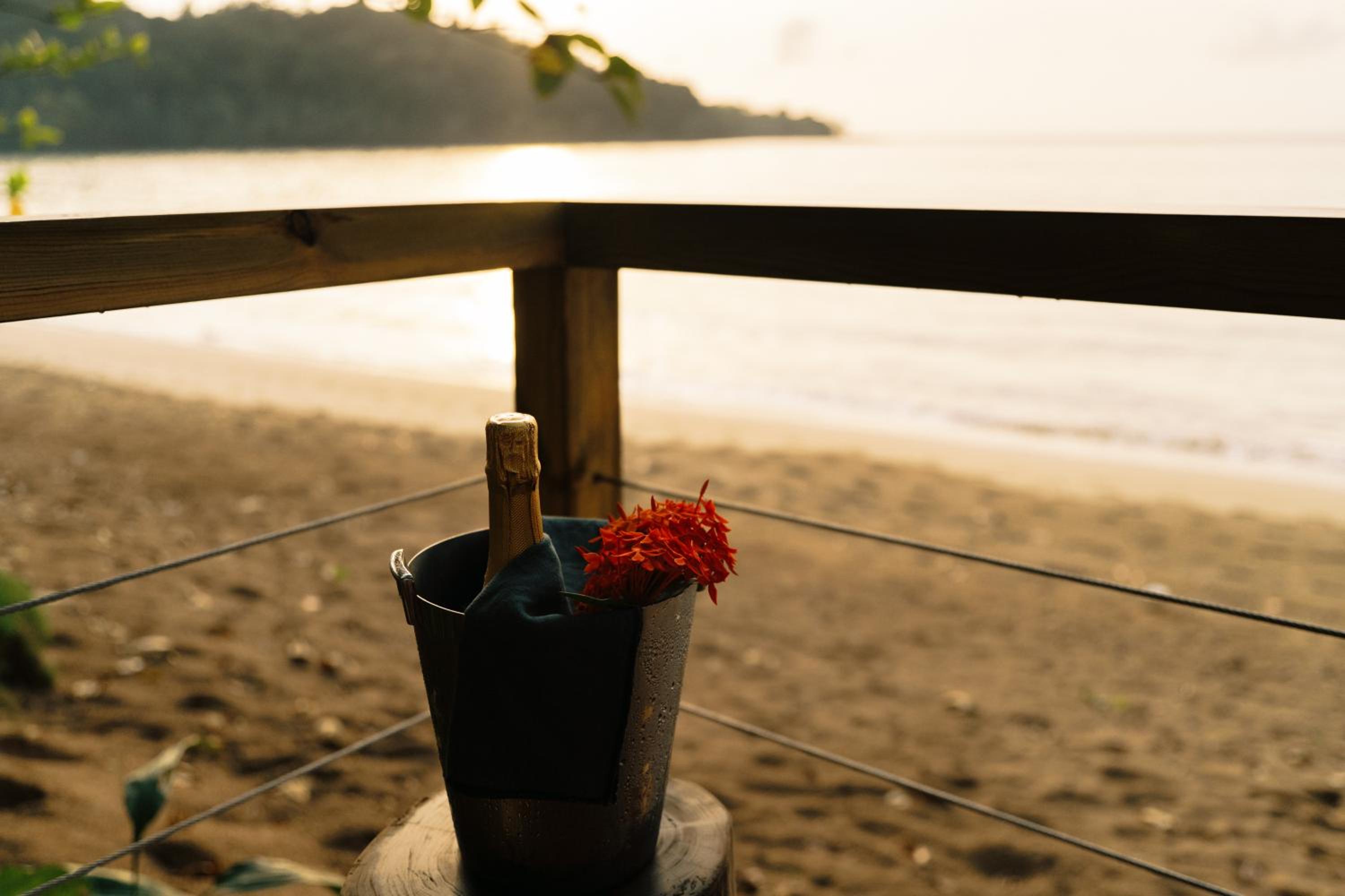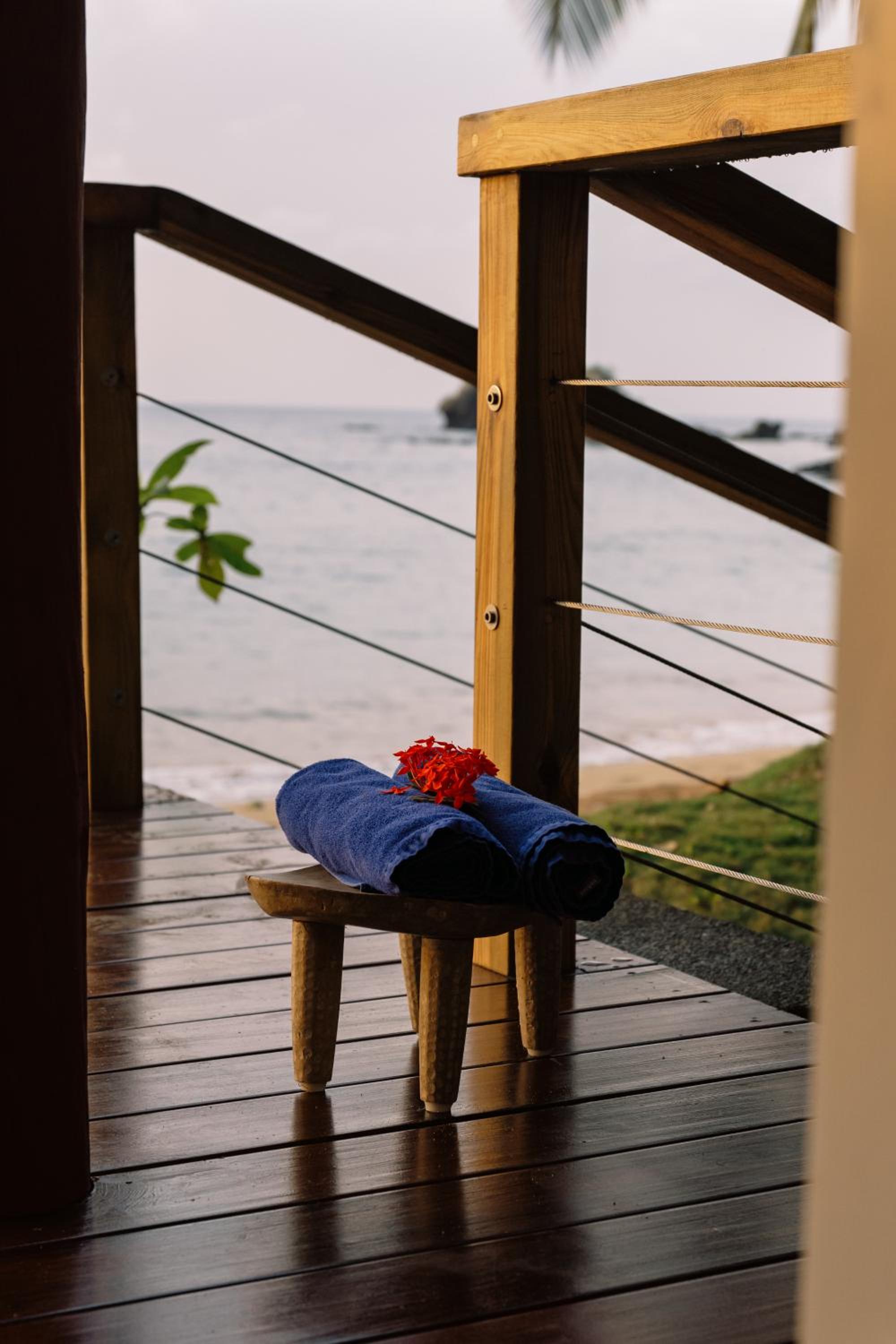 Beachfront Relaxation: Enjoy the serene beach just steps away from your wooden bungalow. Lounge by the outdoor pool or try your hand at fishing on-site.