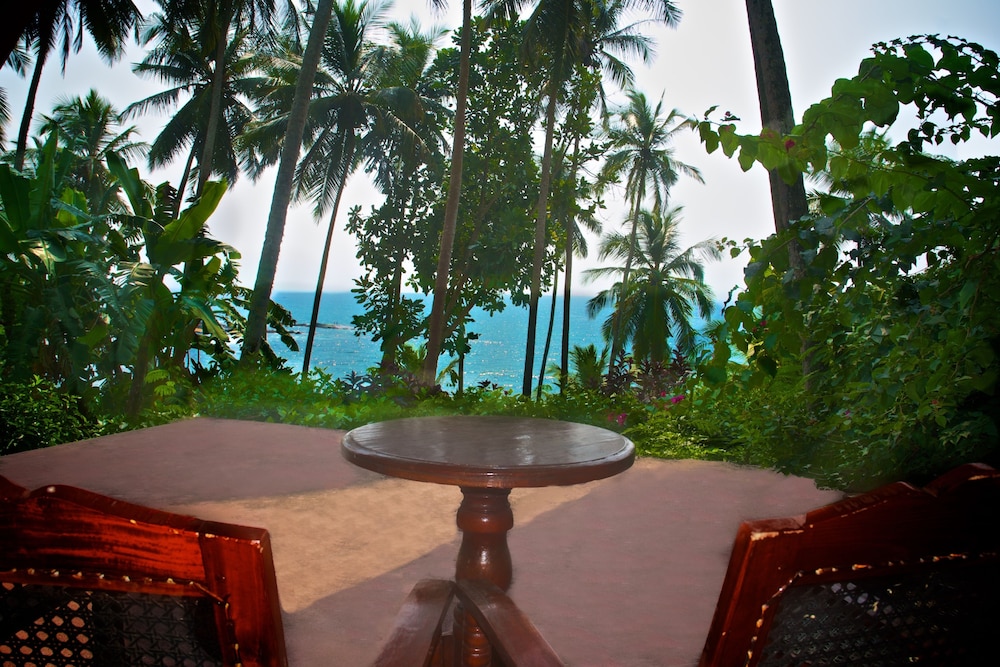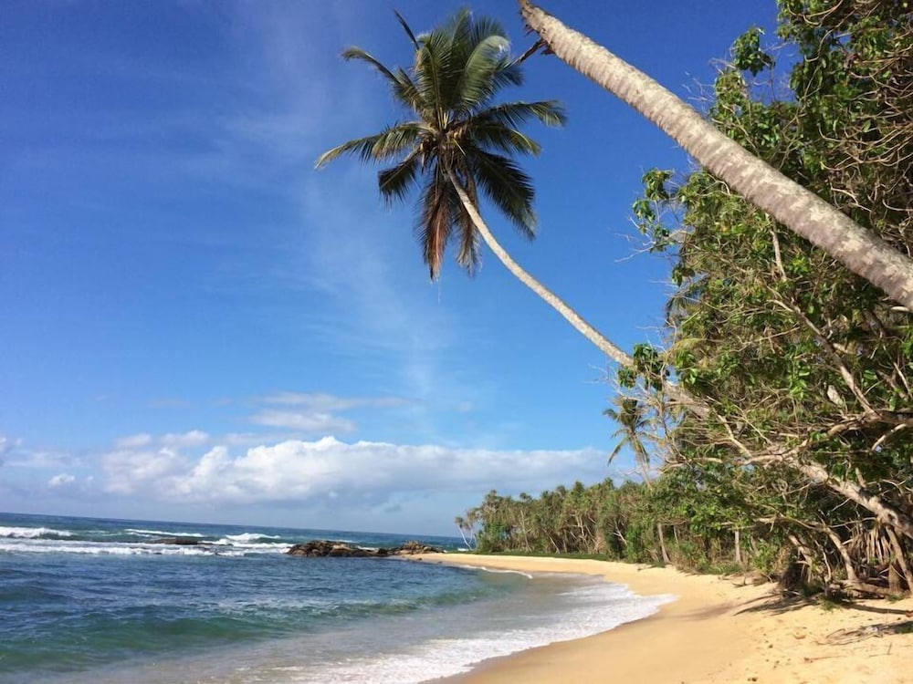 Eva Lanka is a great Hotel. We stayed here for 3 days and had a wonderful time. The hotel is located on a hill, entrance gate on top, the beach on the other side, a huge garden in between. Free peacocks (which fly on top of the king palm trees at night to sleep) live here, amongst beautiful flowers.