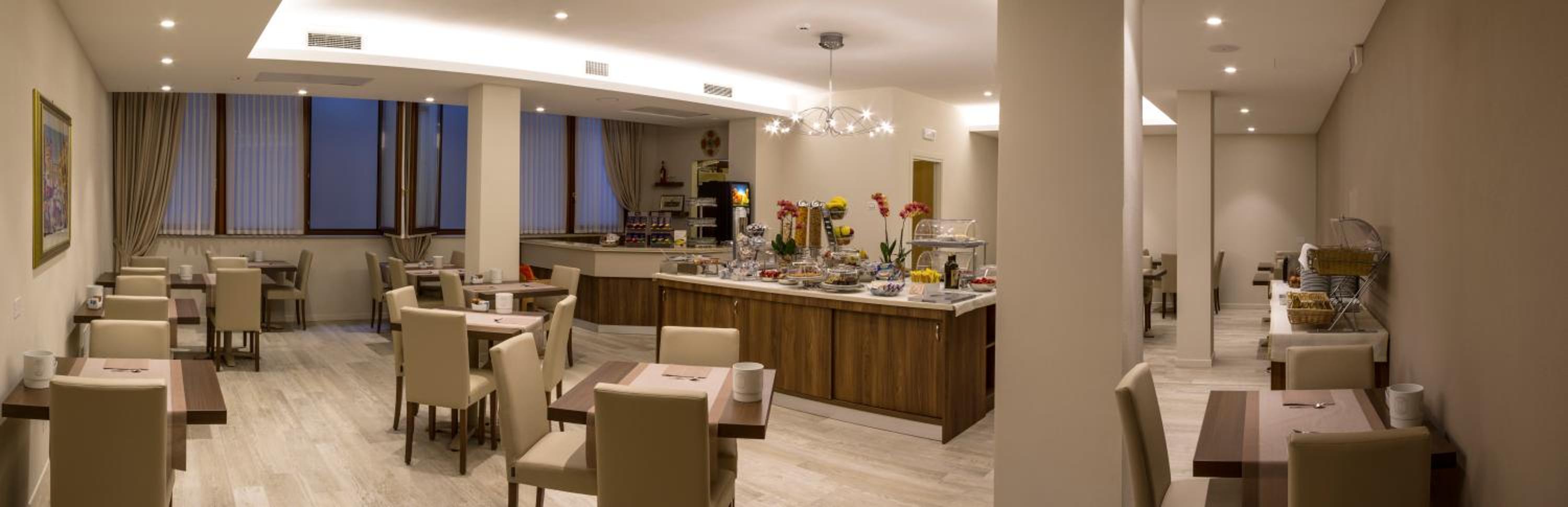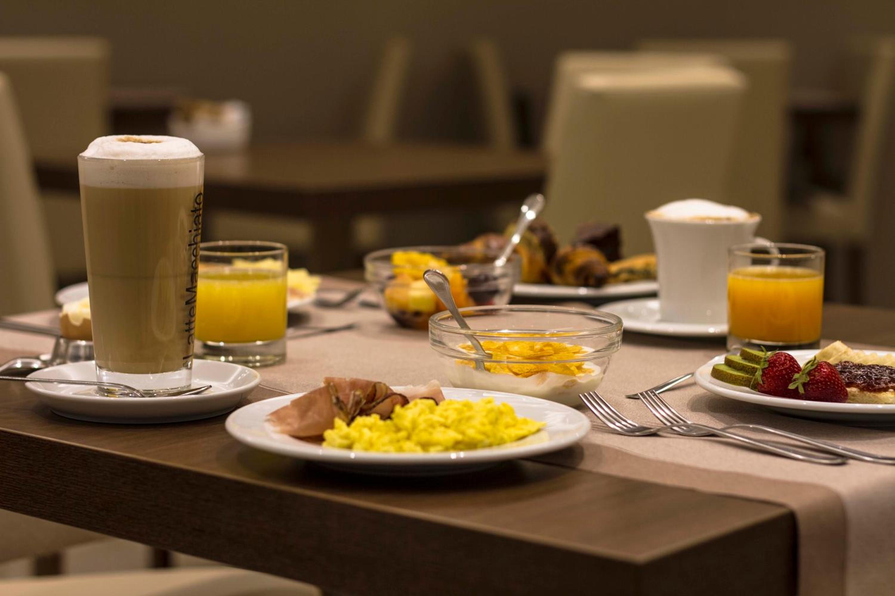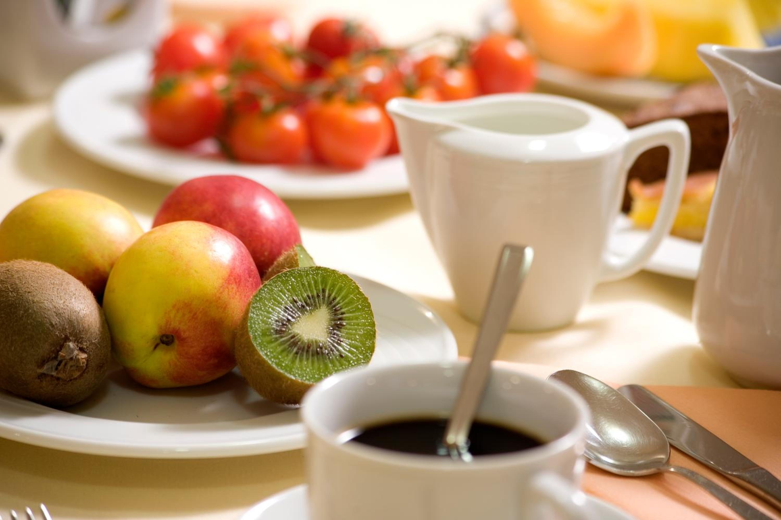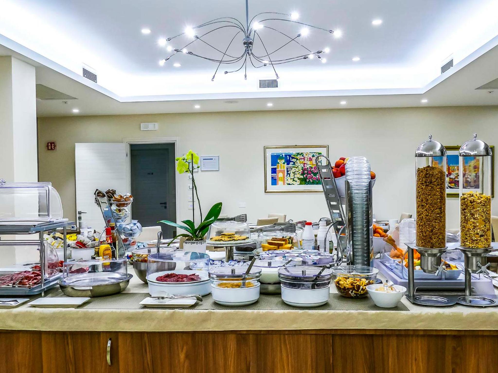 Der Frühstücksraum ist im UG mit bunten Bildern und reichlich Buffet-Auswahl. Diverse Kaffee-Spezialitäten werden von einer netten Dame serviert.