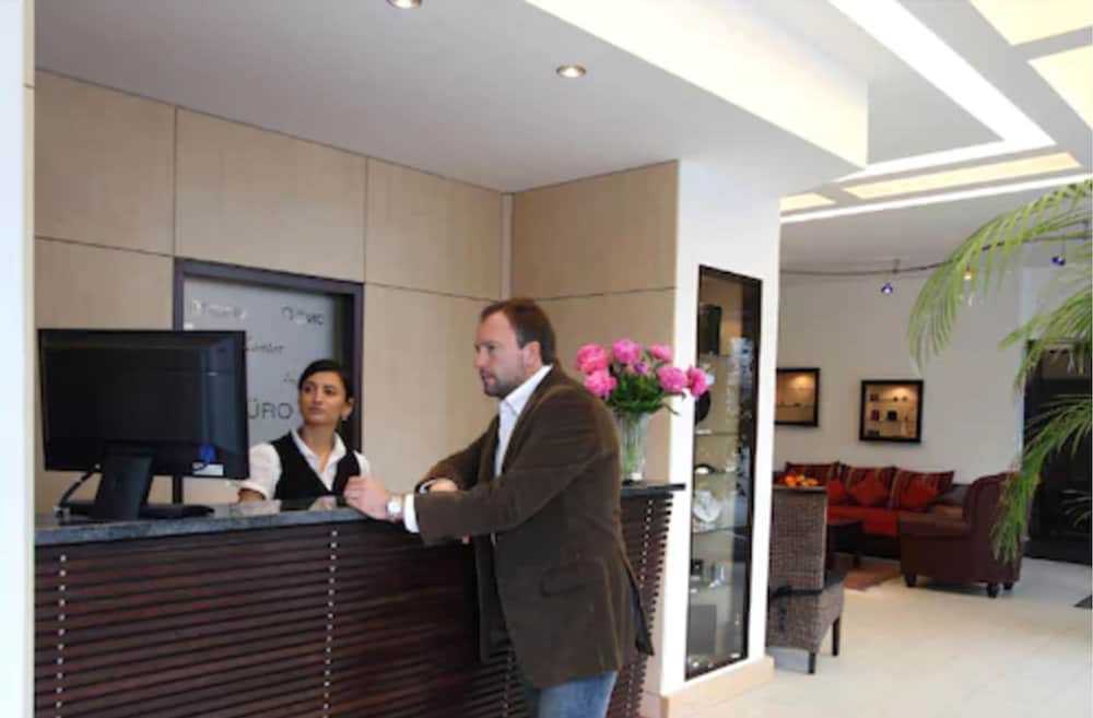 The revolving door doesn't revolve. A diligent concierge lets you in after a few minutes. Treat him well; he's a good fellow. The reception area is India having a nervous breakdown in Germany. Curry permeates your clothes while Punjabi electronic music assaults your eardrums.