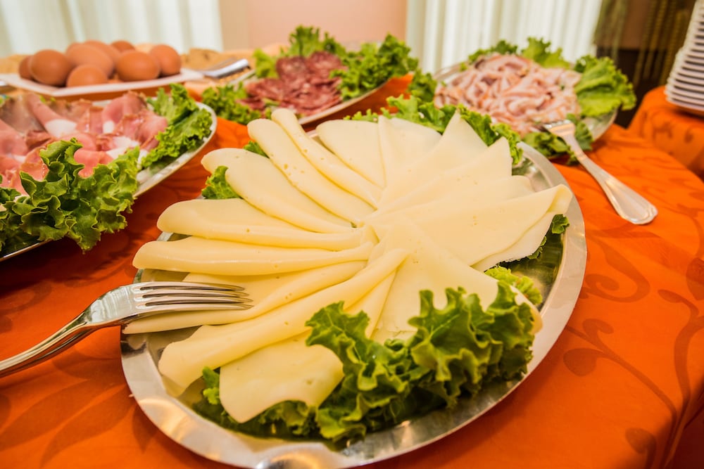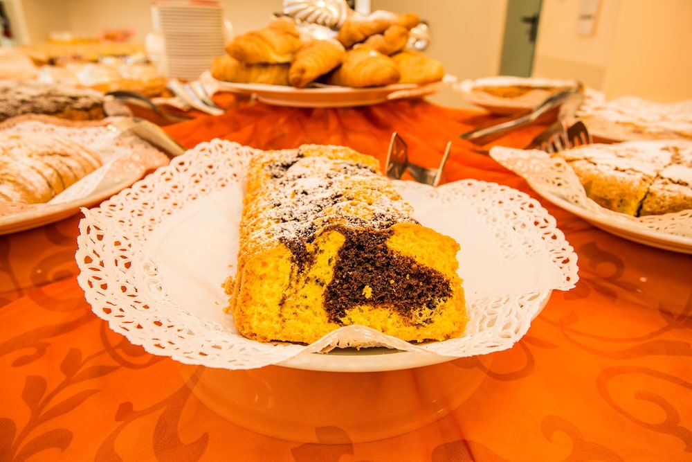 Colazione appena sufficiente: 5 crostate (cioccolata, crema e vari tipi di marmellata), un'altra torta fatta in casa e delle mini croissant vuote. Prosciutto e formaggio, yogurt, 2 tipi di succhi di frutta e bevande calde. Sarebbe utile aggiungere della frutta fresca, macedonia e un po' più di salato.