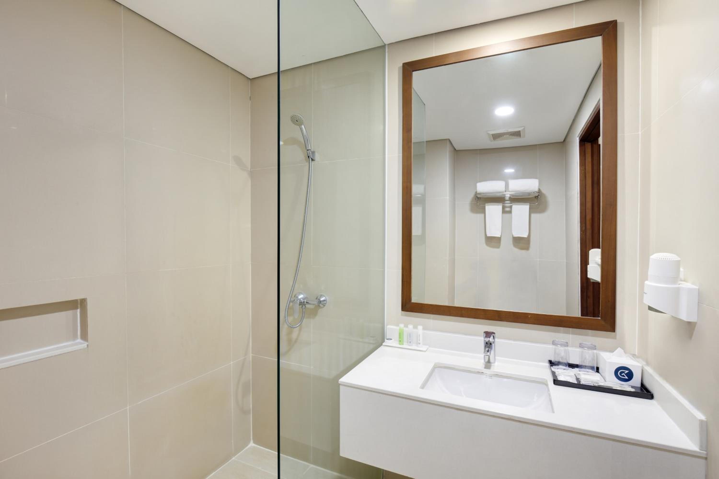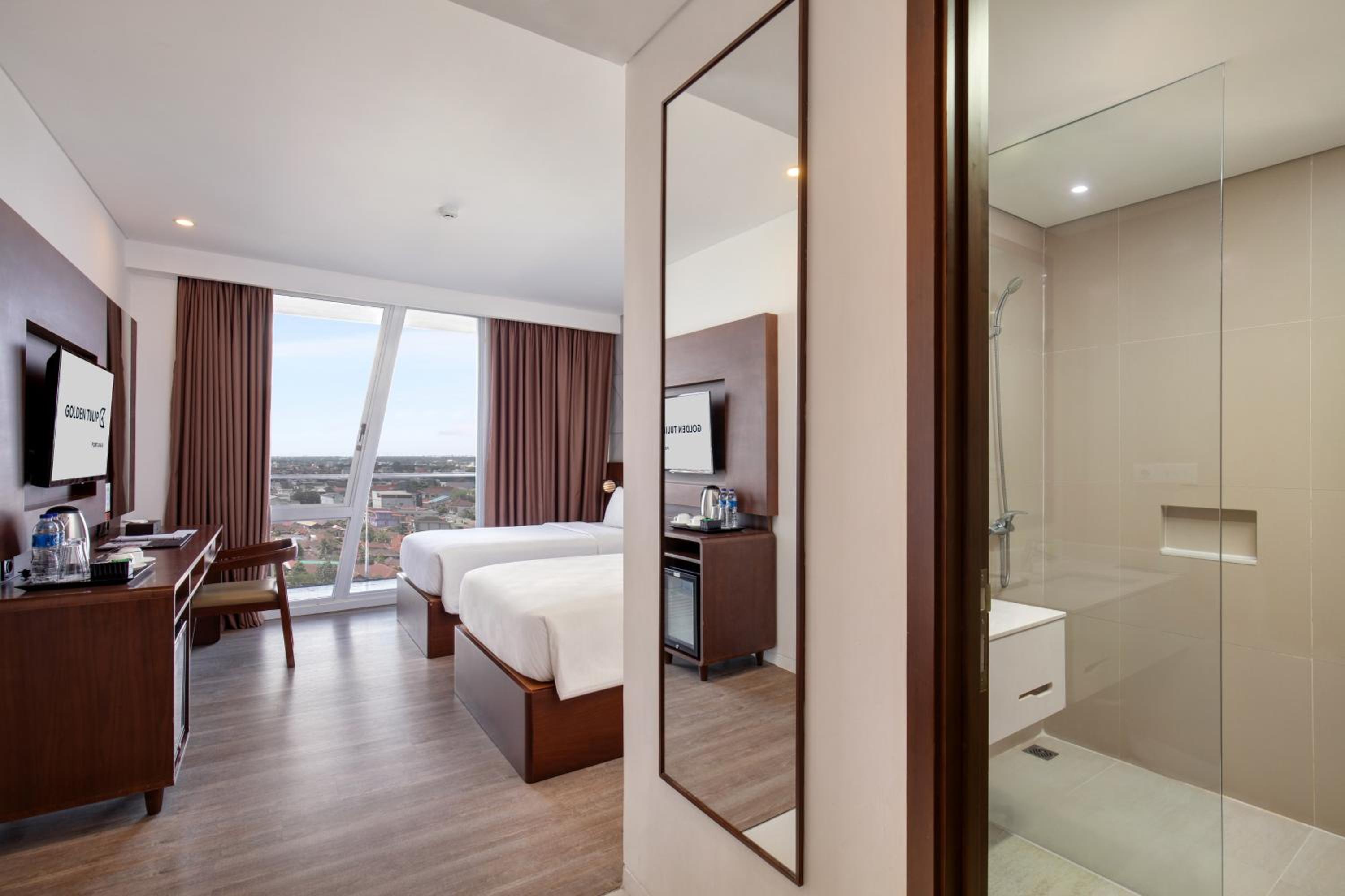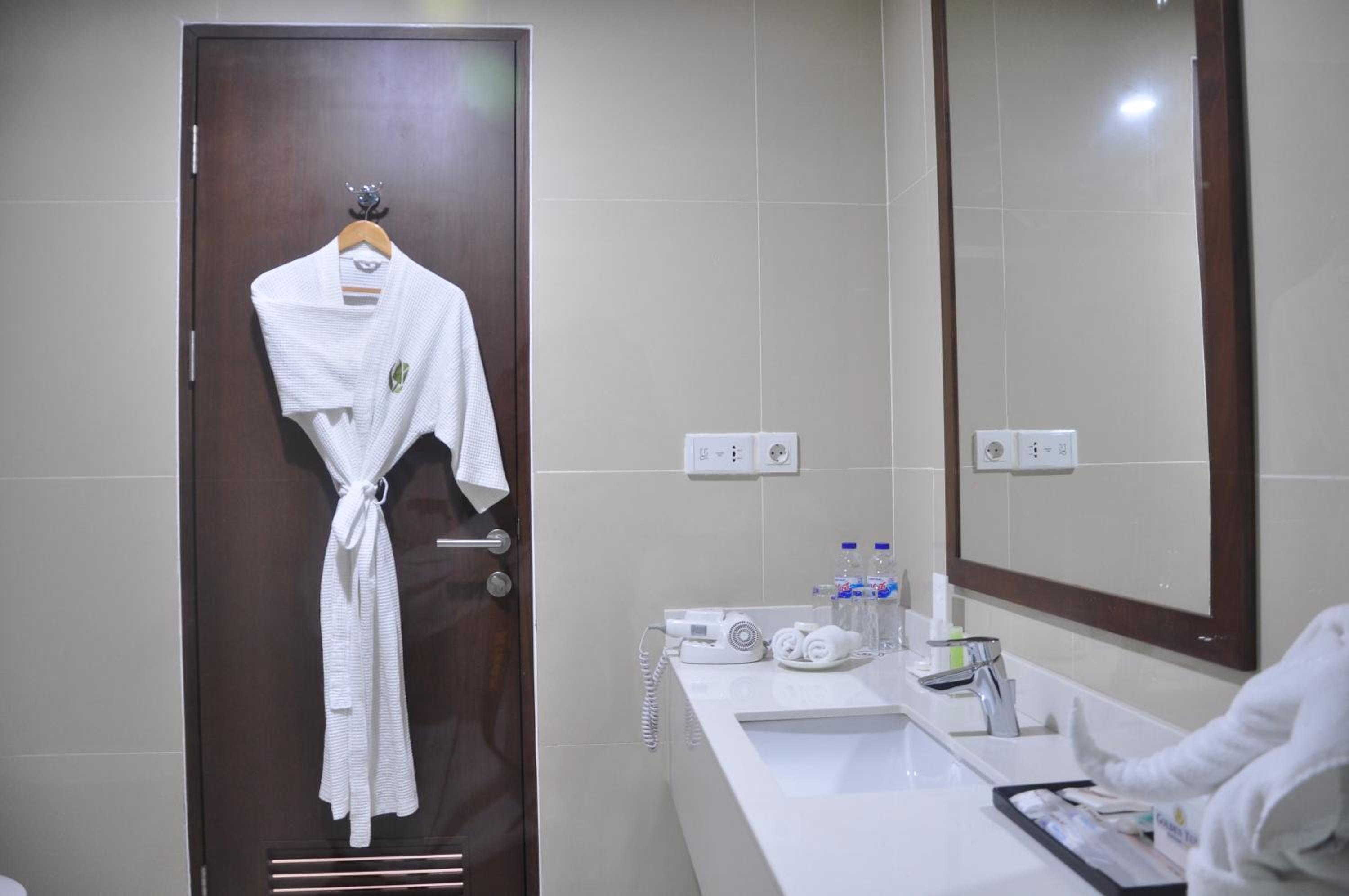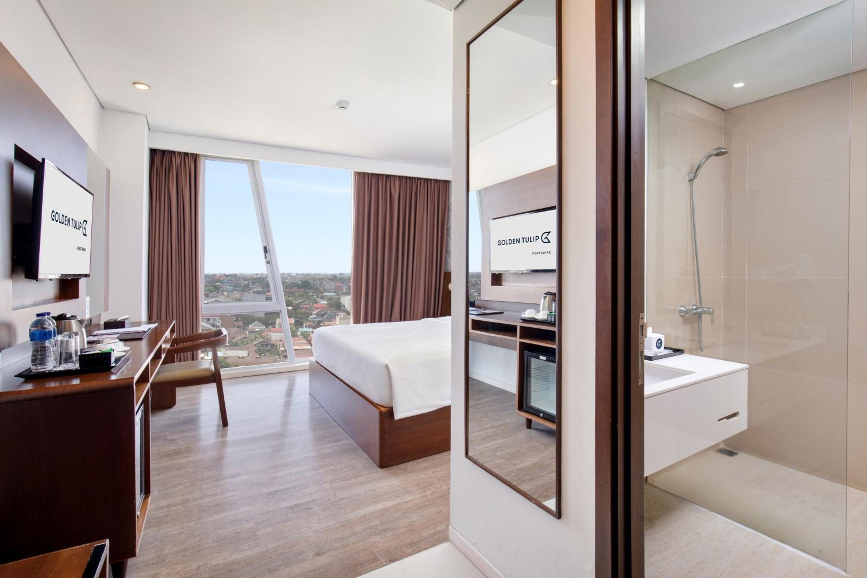 Golden Tulip Pontianak offers air-conditioned rooms with modern amenities including a flat-screen cable TV, personal safe, and a seating area. The private bathrooms feature bathrobes and free toiletries, with some rooms offering city views.