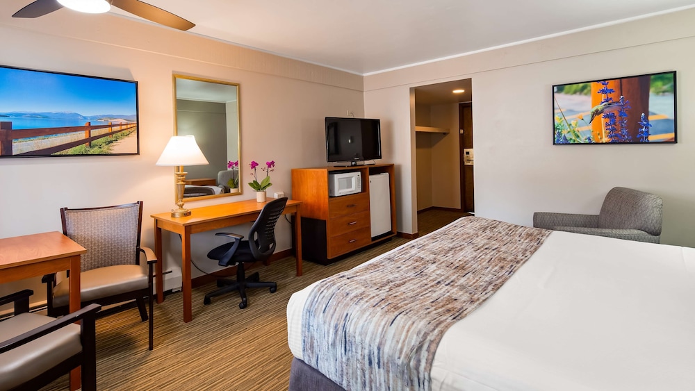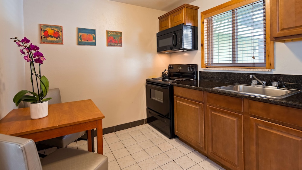 My husband and I stayed while travelling around Colorado. We had a cute room with a kitchenette which was fully equipped to make our own meals. We had a beautiful lake view and the grounds were very nicely kept with flowers everywhere and benches to sit and relax. Staff were very friendly and helpful. Breakfast was very good with lots of options for everyone. There is no air conditioning but our stay at the end of September was comfortable by just leaving a window open at night.