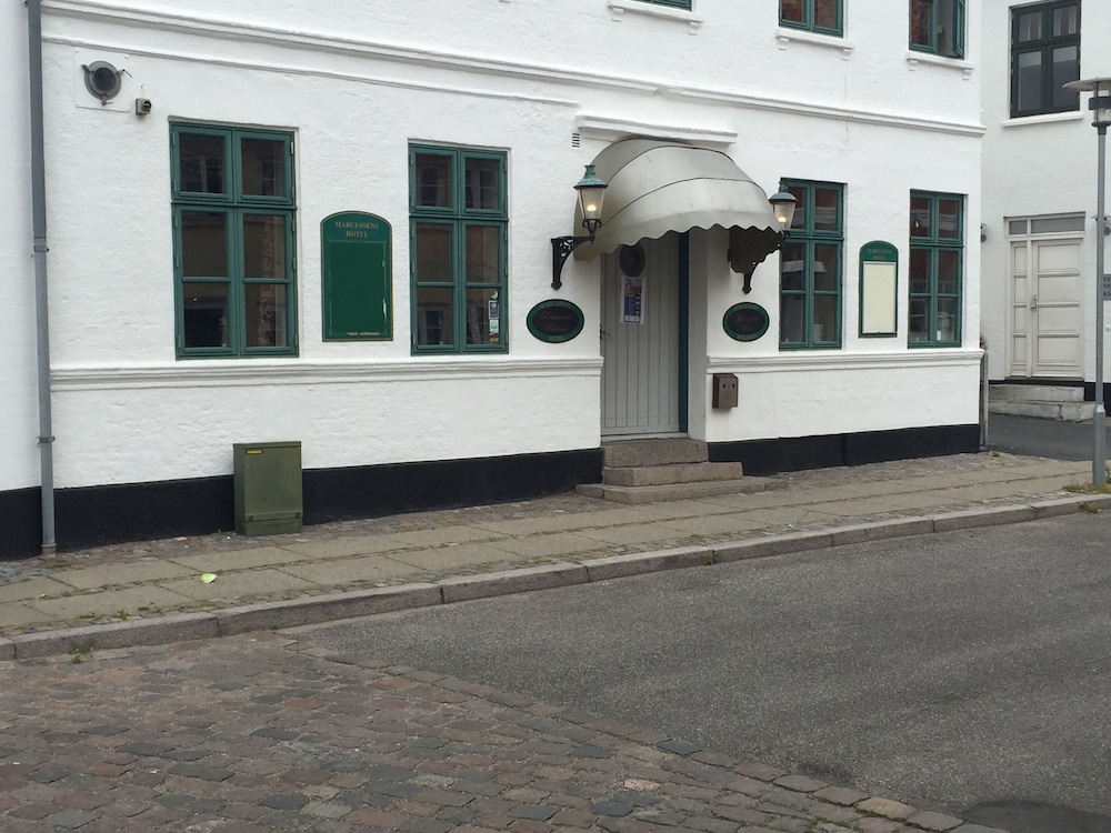 Marcussens Hotel har set bedre dage... Hotellet er slidt og minder mest af alt om et vandrehjem og vores værelse levede bestemt ikke op til vores forventninger om et dobbeltværelse til omkring 1.000 kr i provinsen. Et lille mørkt værelse, hvor sengen (ikke komfortabel og max 140 cm bred med meget tynde dynetæpper) lige akkurat kunne være i et hjørne - så vi skulle kravle over hinanden for at komme i seng. Badeværelset var slidt og uden komfort - der var (tynde) håndklæder. Sød og venlig betjening, der dog ikke vidste noget om andre seværdigheder - hun var ikke fra byen, var svaret.... På selvbetjeningsreolen fandt vi dog hurtigt et kort med angivelse af det sted, vi specifikt søgte. Jeg forventer et vist lokalkendskab af en receptionist. Restauranten - hvor vi dog kun spiste (en ok morgenmad) havde fået en gang "hattelak". Intentionerne har sikkert været gode - resultatet fremstod billigt og levede ikke op til beskrivelsen på hjemmesiden. Kaffemaskinen var en udfordring - betjeningen vidste godt, at kaffemaskinen ikke var helt i orden - og tilbød da også (venligt og promte) at komme med varm mælk. Vi vil ikke anbefale Marcussens Hotel - der er ikke "valuta" for pengene.