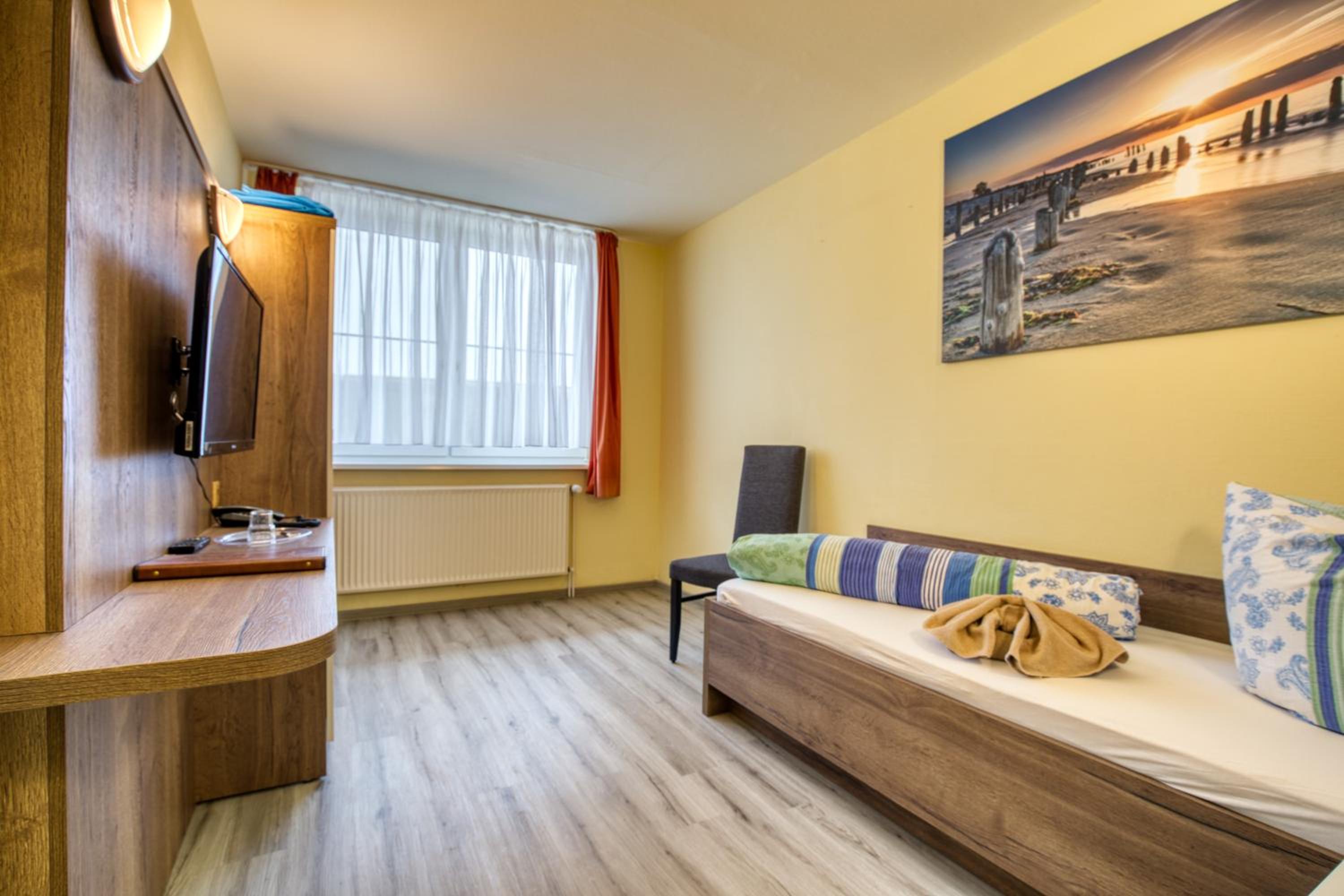 Da mein Sommeraufenthalt auch ein paar „Hitzetage“ zählte, war ich dankbar für das Insektenschutzgitter am Hotelfenster( nächtliches Lüften war problemlos) sowie dem völlig geräuschlosen kleinen Kühlschrank, der mit zur Zimmerausstattung gehört. Das Zimmer war in sauberem und gemütlichem Zustand. Die Sitzmöglichkeit am Fenster mit kleinem Tisch lädt sogar ein, Postkarten aus dem Urlaub zu schreiben.