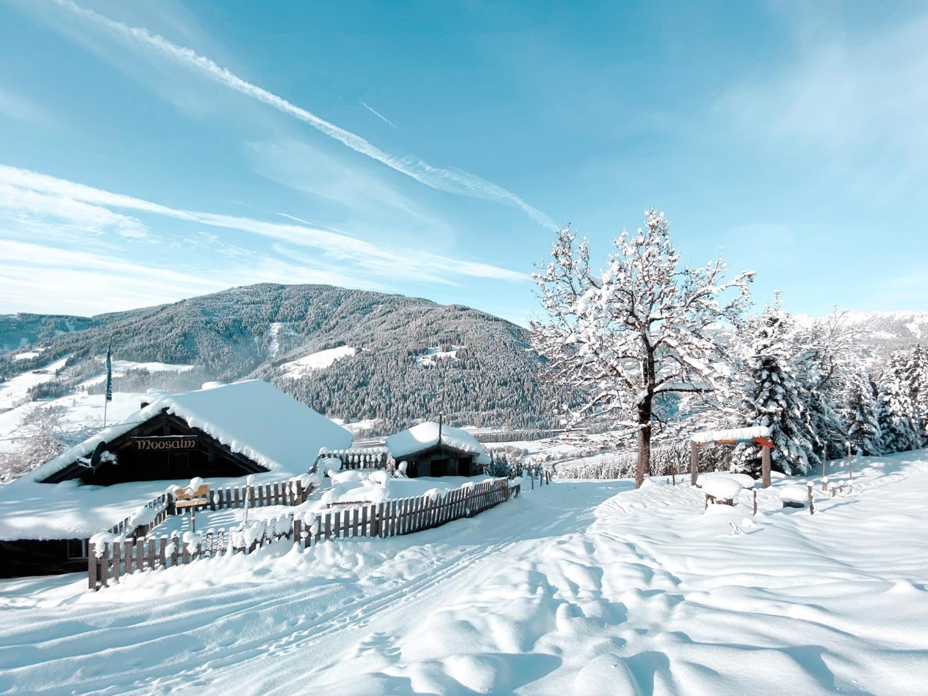 Escape to our sunny, tranquil location surrounded by lush meadows and snowy mountains, providing the perfect backdrop for a relaxing getaway.