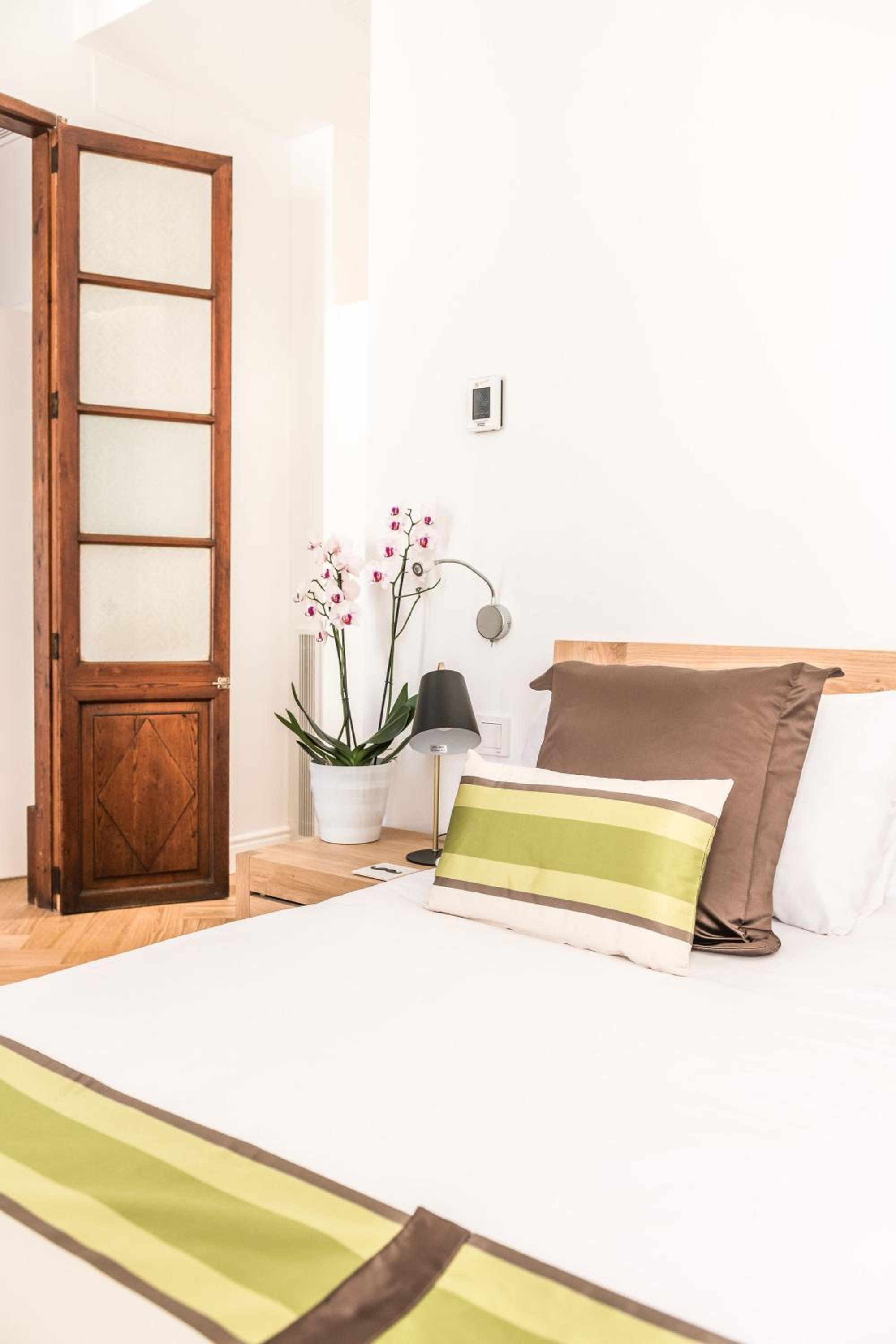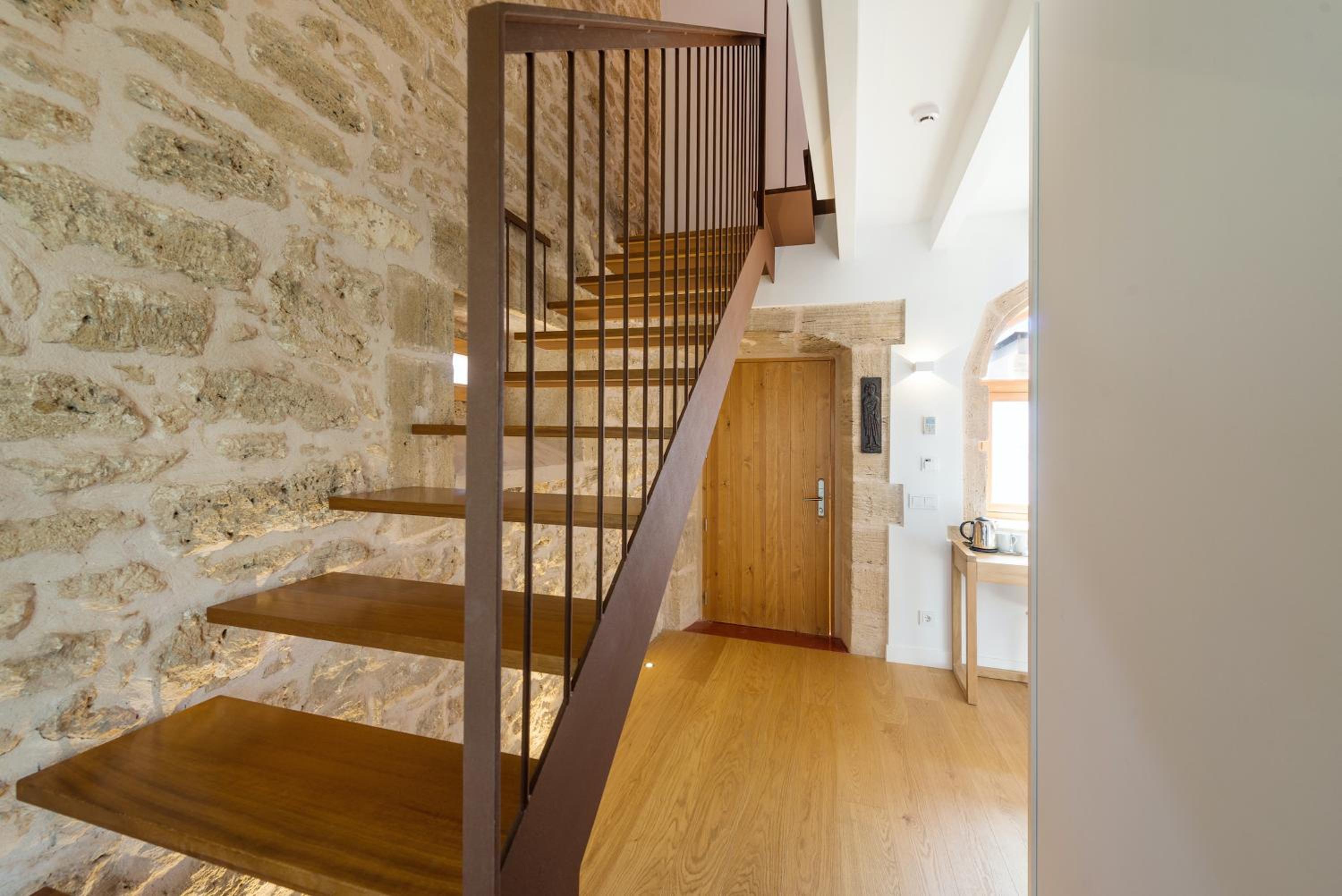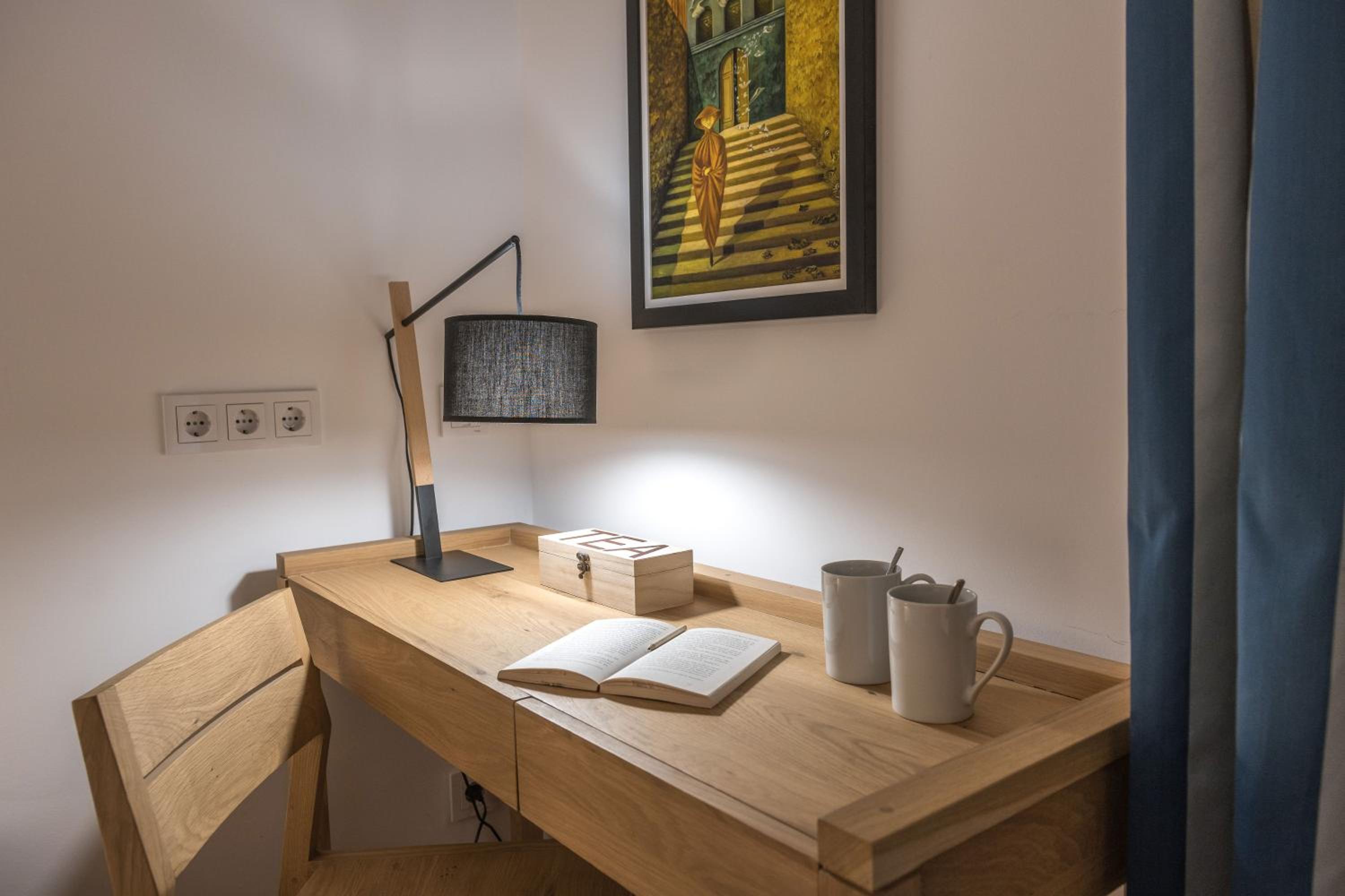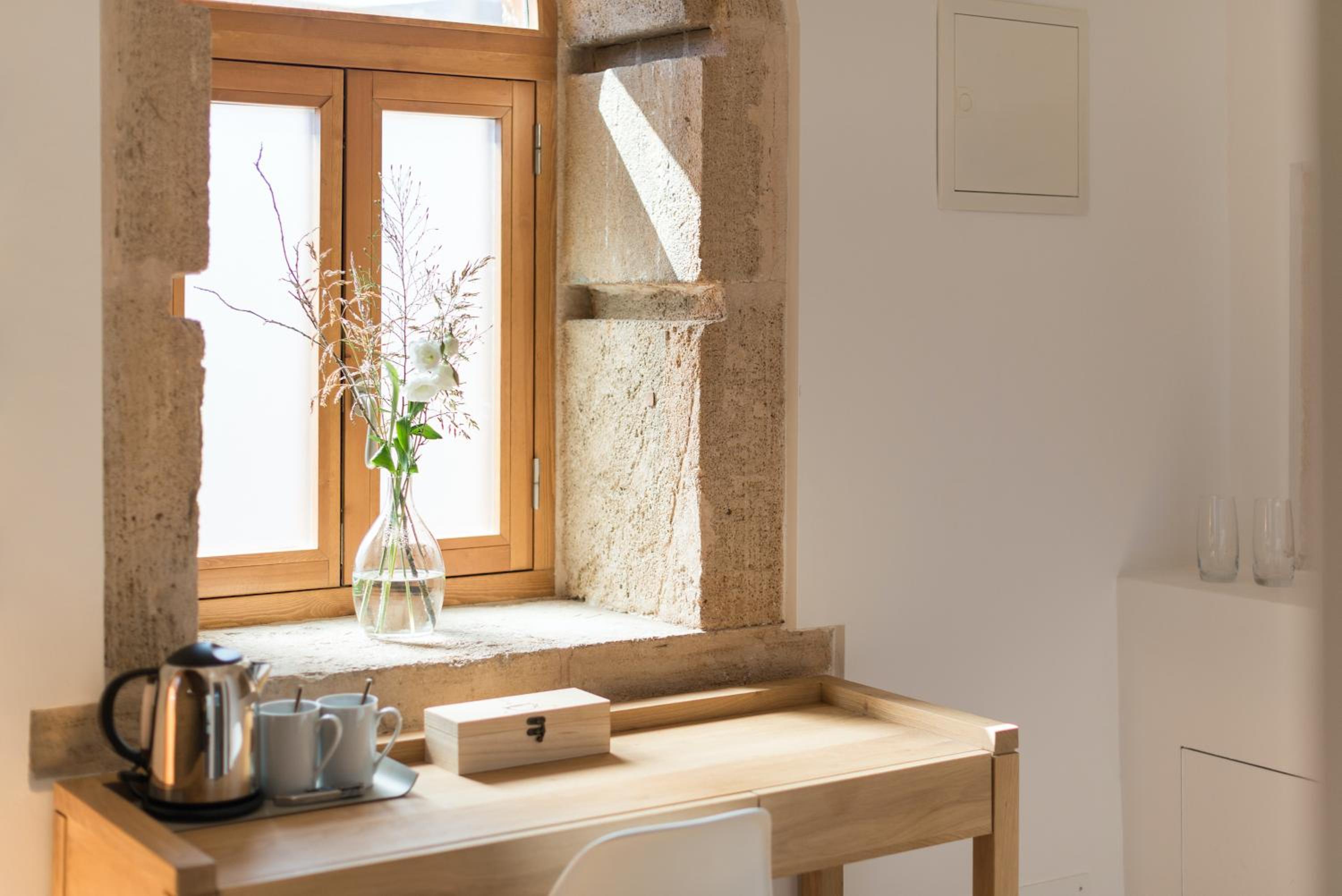 Experience the charm of high ceilings and wooden beams in our rooms, complete with modern amenities like flat-screen TVs and coffee/tea facilities. Upgrade to a room with a private terrace for stunning spa area views.