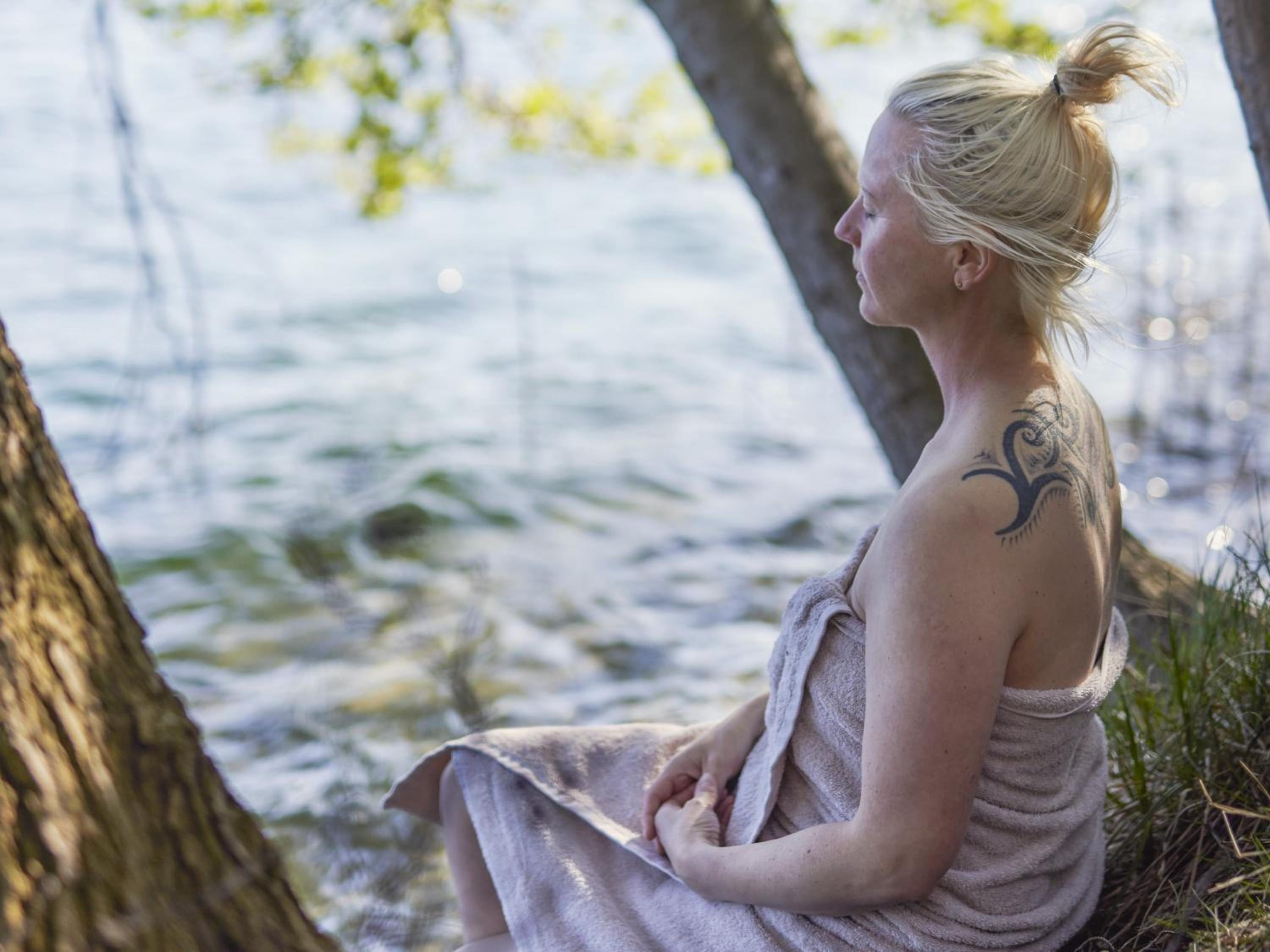 Ein Highlight ist auch die Fasssauna mit Blick auf den See.
