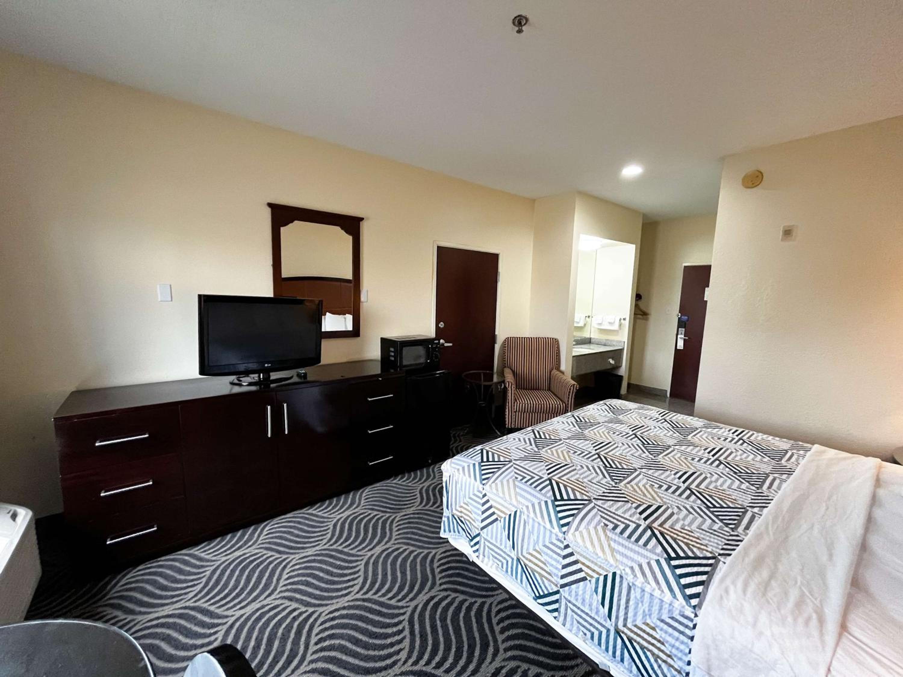 booked online for $47, supposed to be pet friendly included, asked why there was no option for jacuzzi and was told there was 1 for additional $125. Pet costed extra $10 but when charged on card it was $17, then was charged additional $17 when taking pet up stairs through inside entrance to 2nd floor room, no hot water for bathing, 1 lightbulb that I had to move 3 times to find a lamp that worked and no overhead lights turned on by any switch, hair dryer was burned up, 1 towel, 1 washcloth, no complimentary hygiene, no breakfast, no wifi. "Executive inn and suites" i thought was for business affairs, no desk no chair. No local channels no remote previous trash left behind 1 sheet and one bedspread, nothing between, heater didn't work. Empty vending machine, no ice broken ice bucket. Staff couldn't even understand English or speak it.