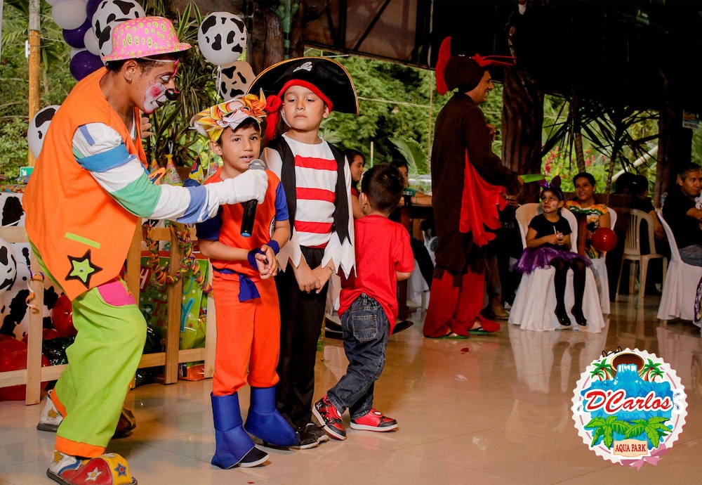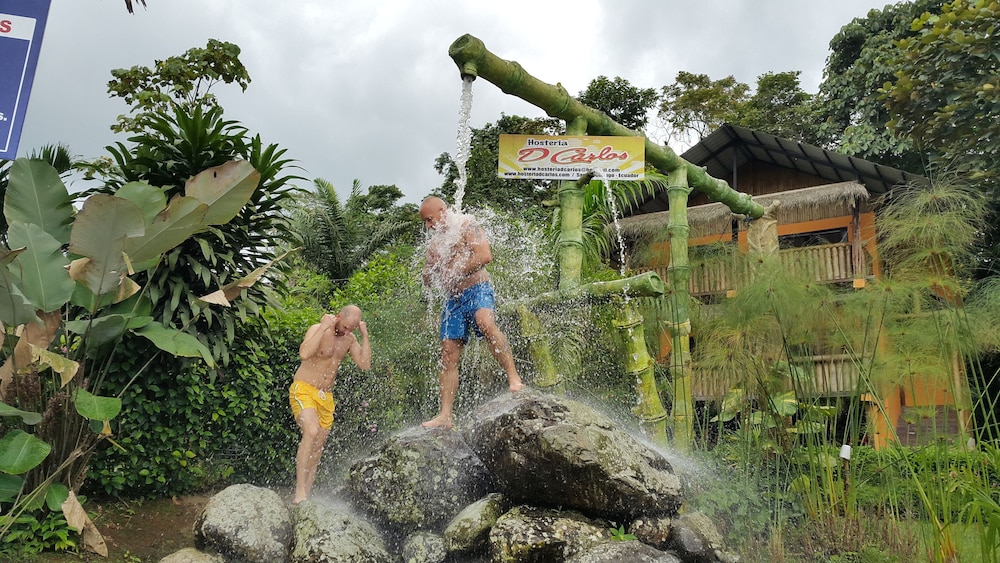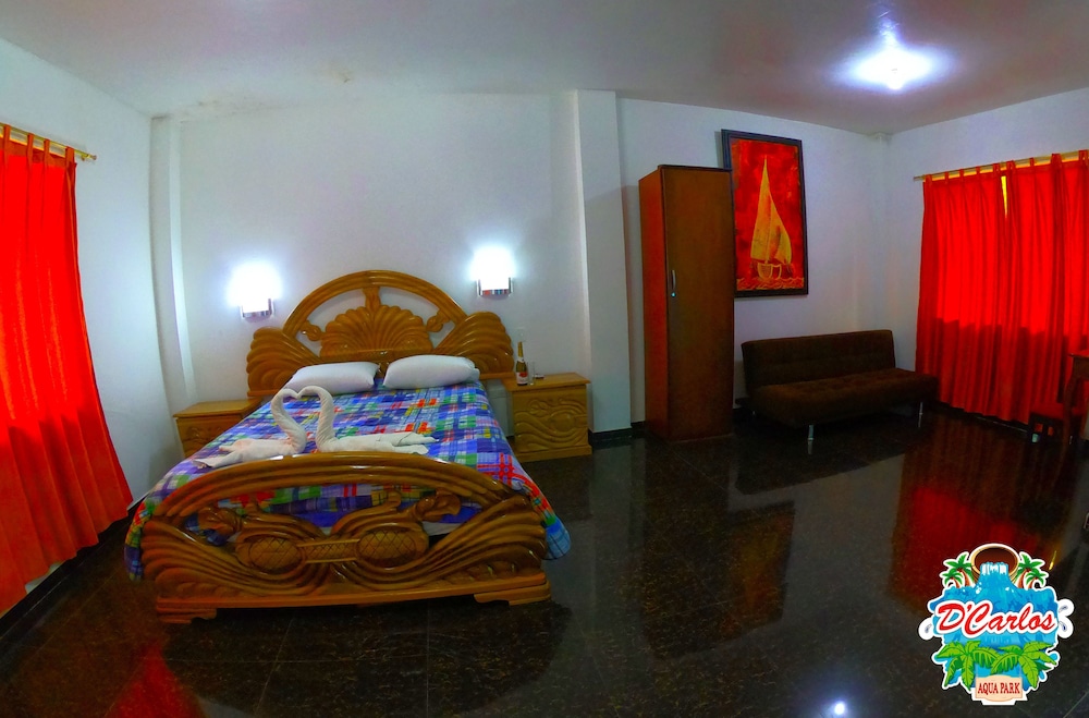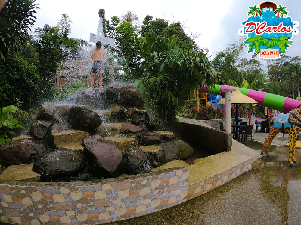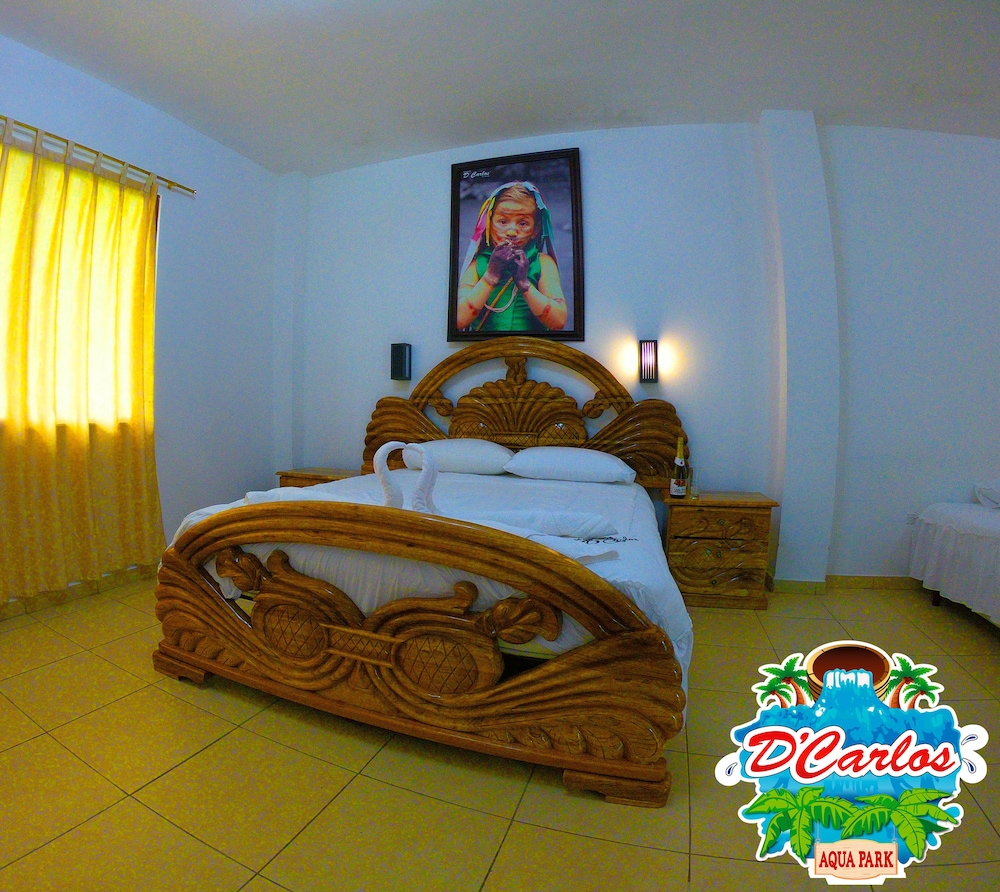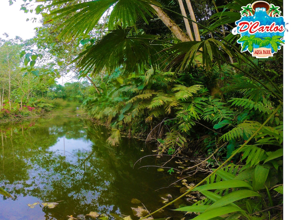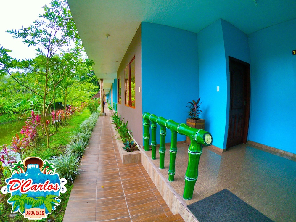 Traveling off-season, we arrived at Hosteria D'Carlos as the only guests on the property. We dined with Carlos and enjoyed shrimp and fried tilapia from their own pond. The grounds are beautiful, once you get away from the aqua park. I would have liked to have been there to see families dining, dancing and enjoying the water park, but it was a ghost town. Awakening to the sounds of the jungle birds was a delight that reminded me of my childhood growing up in Central and South America. Don't be fooled by the pin on the map, the hotel is 7.5km off the highway. I encouraged Carlos to provide more complete directions. It was memorable and enjoyable.