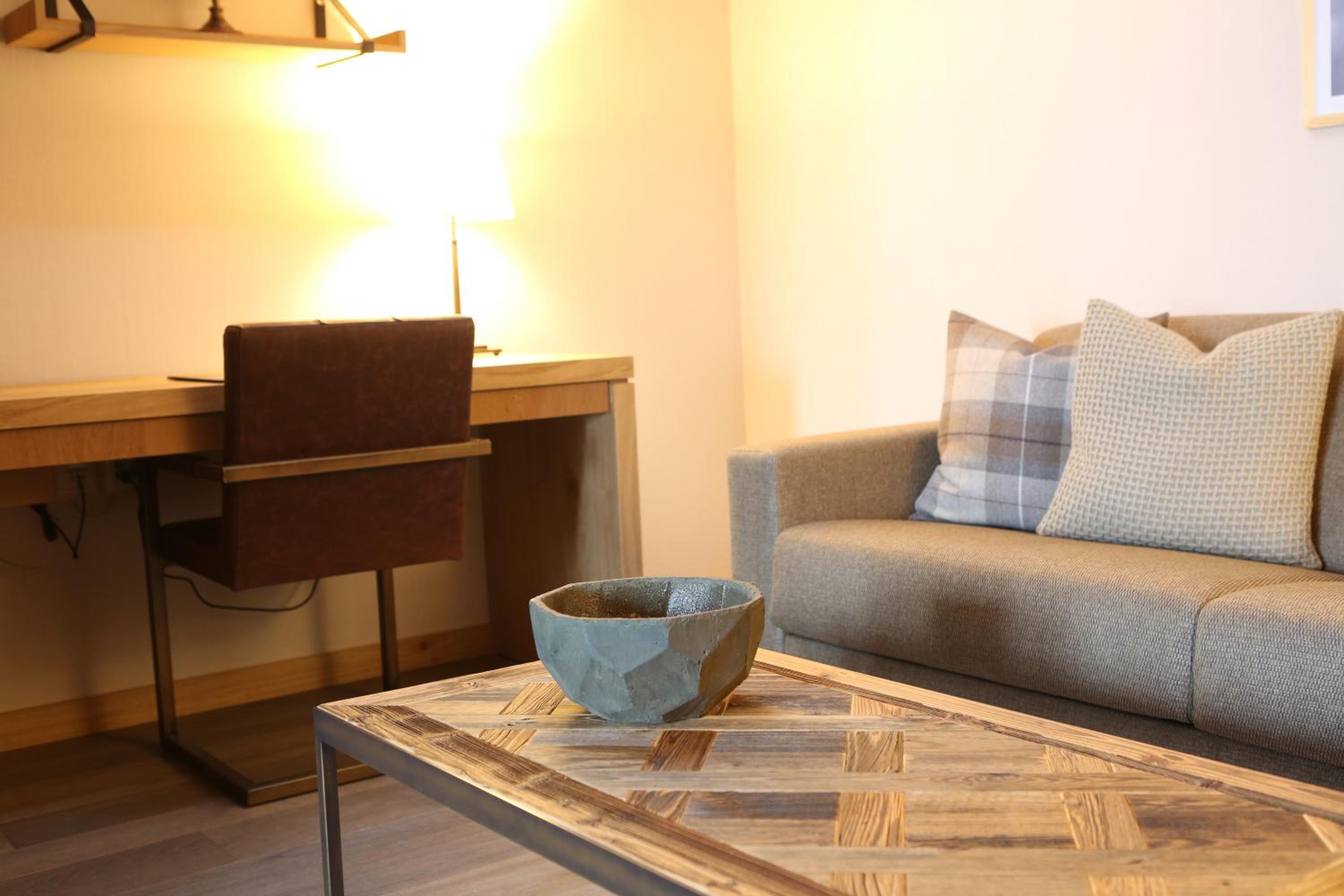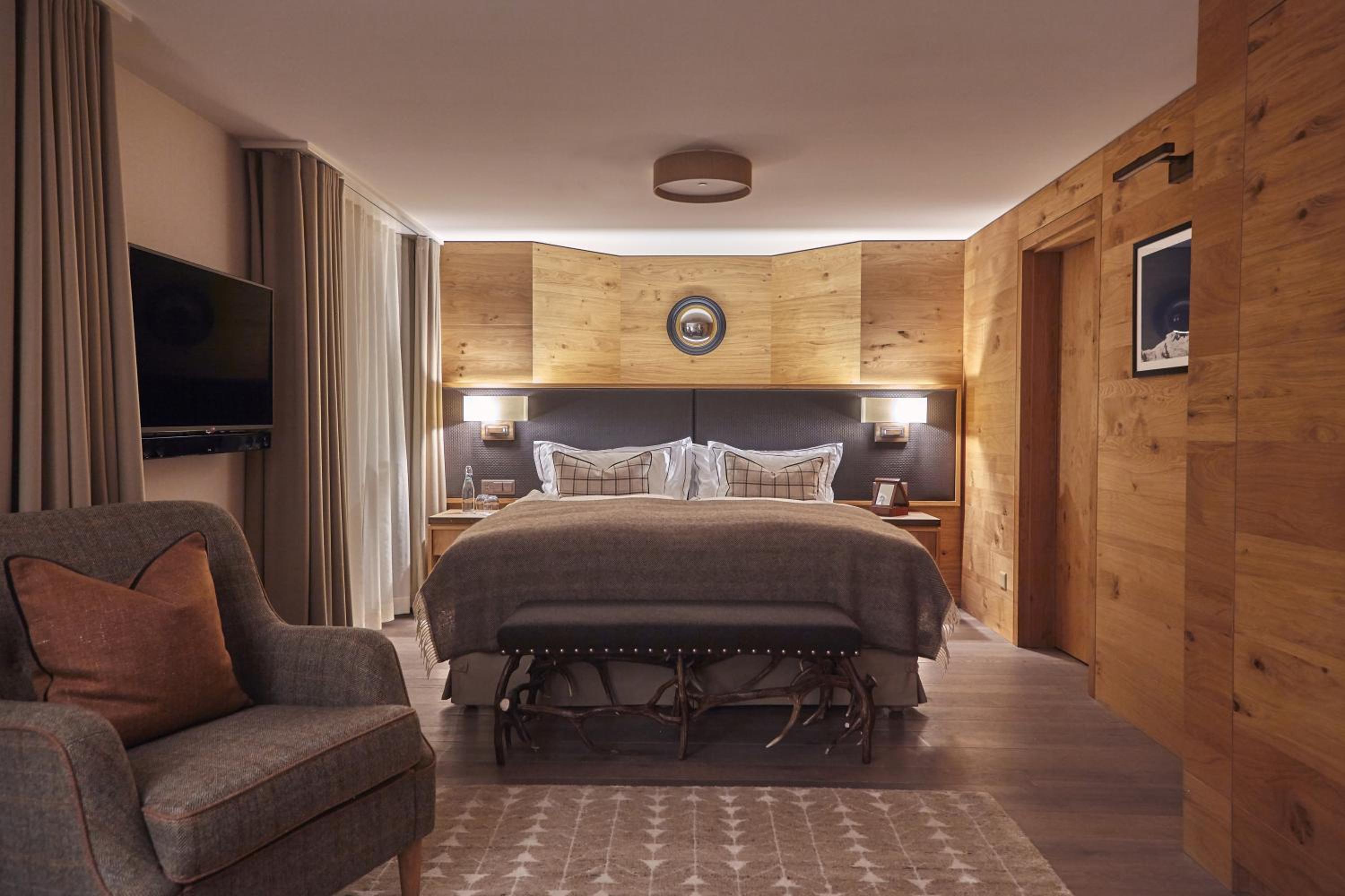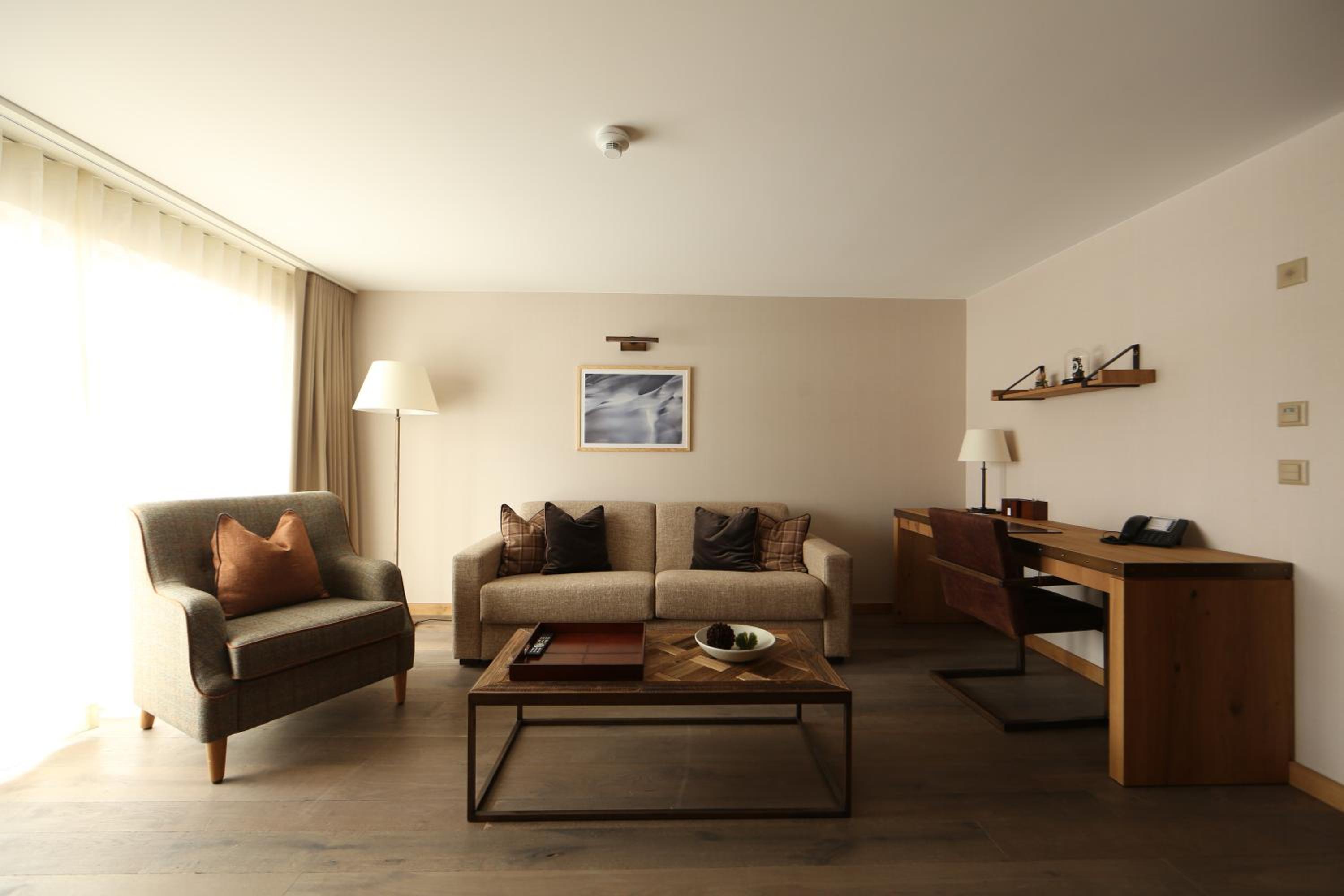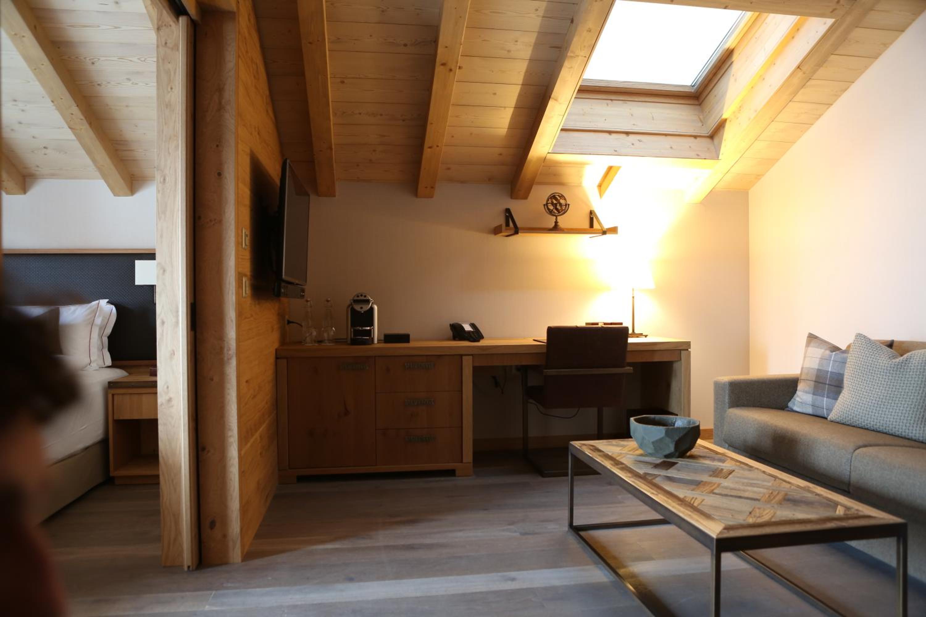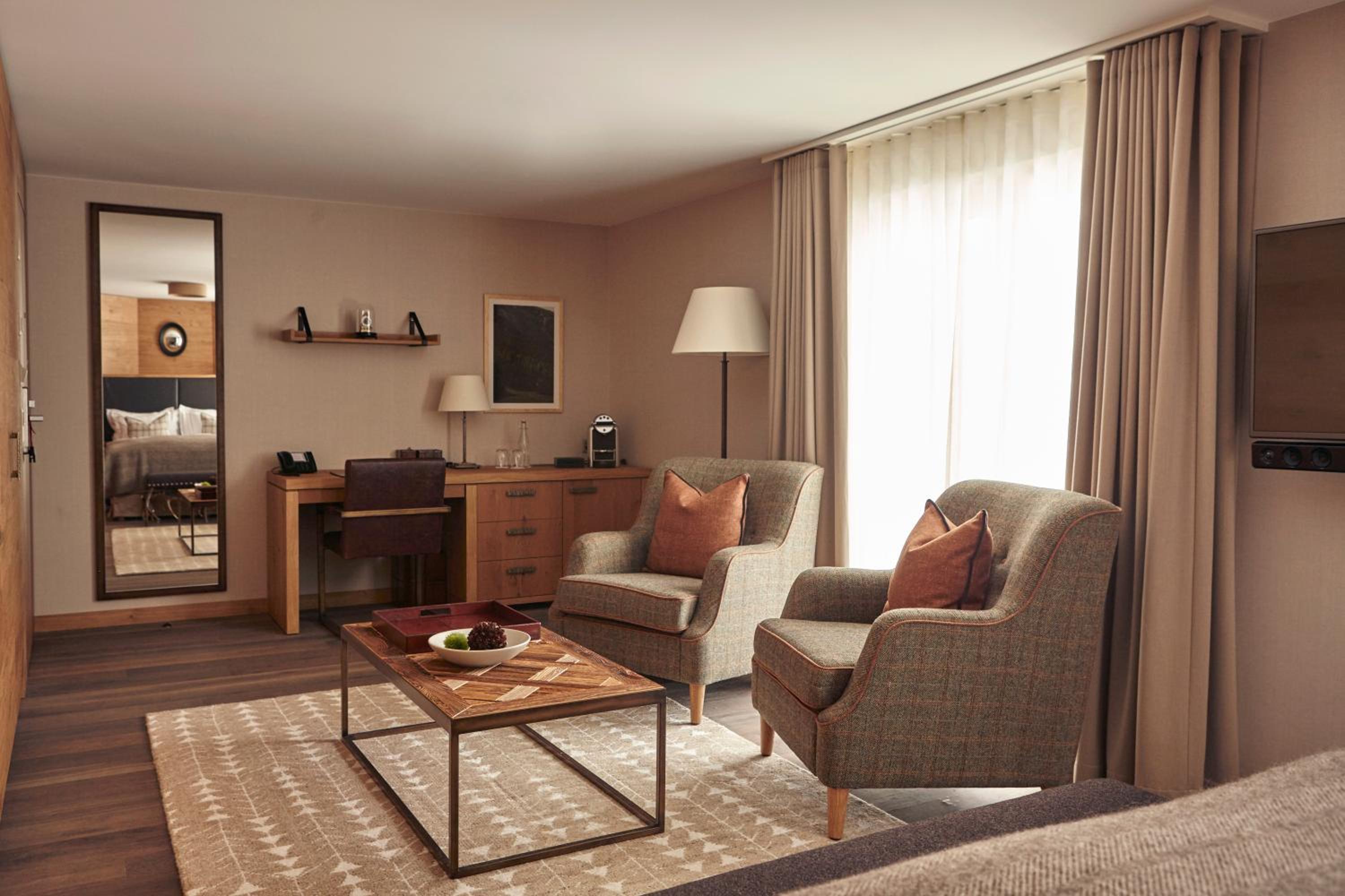 Experience the elegance of The Capra Saas-Fee with beautifully furnished suites offering breathtaking mountain views from private balconies. Enjoy the comfort of a separate living area, modern amenities, and a luxurious bathroom for a truly relaxing stay.