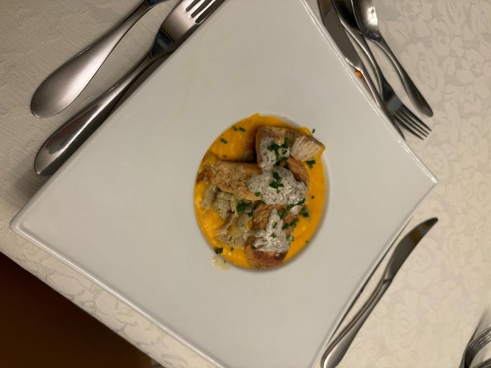 Exactly as described - David welcomed us personally, asked us to meet up with fellow guests (all travelling on business) for drinks and nibbles at 19:30. Then prepared Choucroute for us. No choice. This may not be to everyone's liking, but we found it charming and an opportunity to east home-cooked dishes not found in many restaurants. The room was fantastic, overlooking the mill stream.