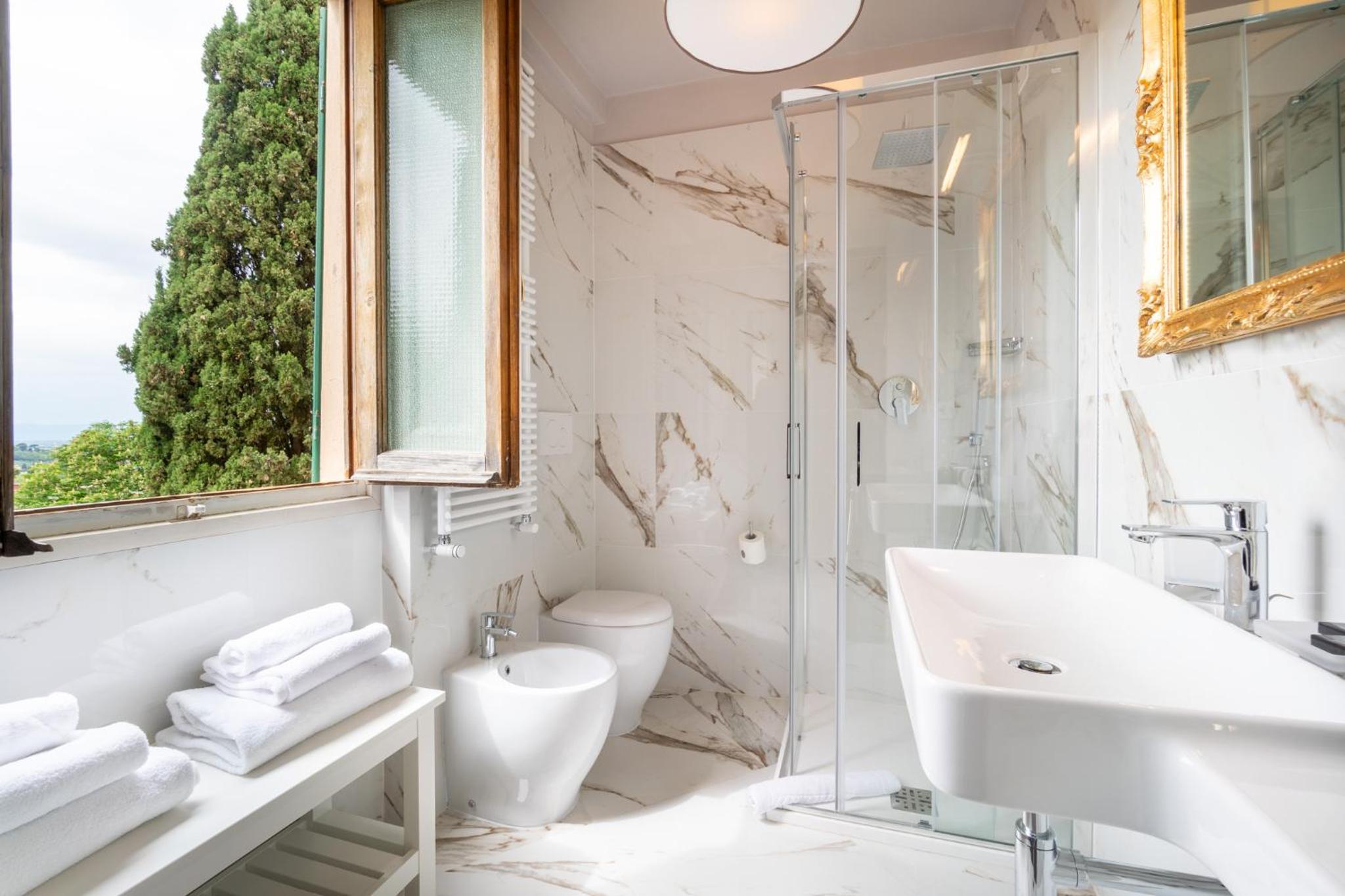 Очень атмосферная, красивая старинная вилла-отель. Красивый, необычный сад. Номер чистый, просторный, удобная кровать. В номере было тепло и тихо. Останавливались на две ночи и продлили наше прибывание еще на одну ночь. Есть трансфер до Флоренции и из Флоренции, время в пути примерно 10 минут. Мы путешествовали на машине, оставляли ее на бесплатной парковке при отеле и пользовались транфером, это очень удобно. В отеле есть ресторан, где можно поужинать. Завтрак накрывается в ресторане , а летом можно завтракать на улице, в саду, думаю это просто чудесно. Завтрак очень красиво сервирован, есть все , что нужно ,чтобы плотно позавтракать на любой вкус. Но гармонию нарушает молодая девушка официантка , восточной наружности. Она кружила между столами , гремела посудой, как будто хотела, чтобы мы побыстрее ушли, хотя постояльцев на завтраке было немного. А нам так хотелось насладиться камерностью . Остальной персонал был приветливый и дружелюбный, нам провели экскурсию по вилле, показали все нюансы. На вилле есть рабочий старинный лифт, это удобно, если вы путешествуете с детьми или у вас много вещей. А также есть винный бар-автомат, ну и конечно прекрасный бар с обслуживанием. Великолепное место , приятная атмосфера покая царит на вилле. Я бы хотела вернуться сюда летом.
