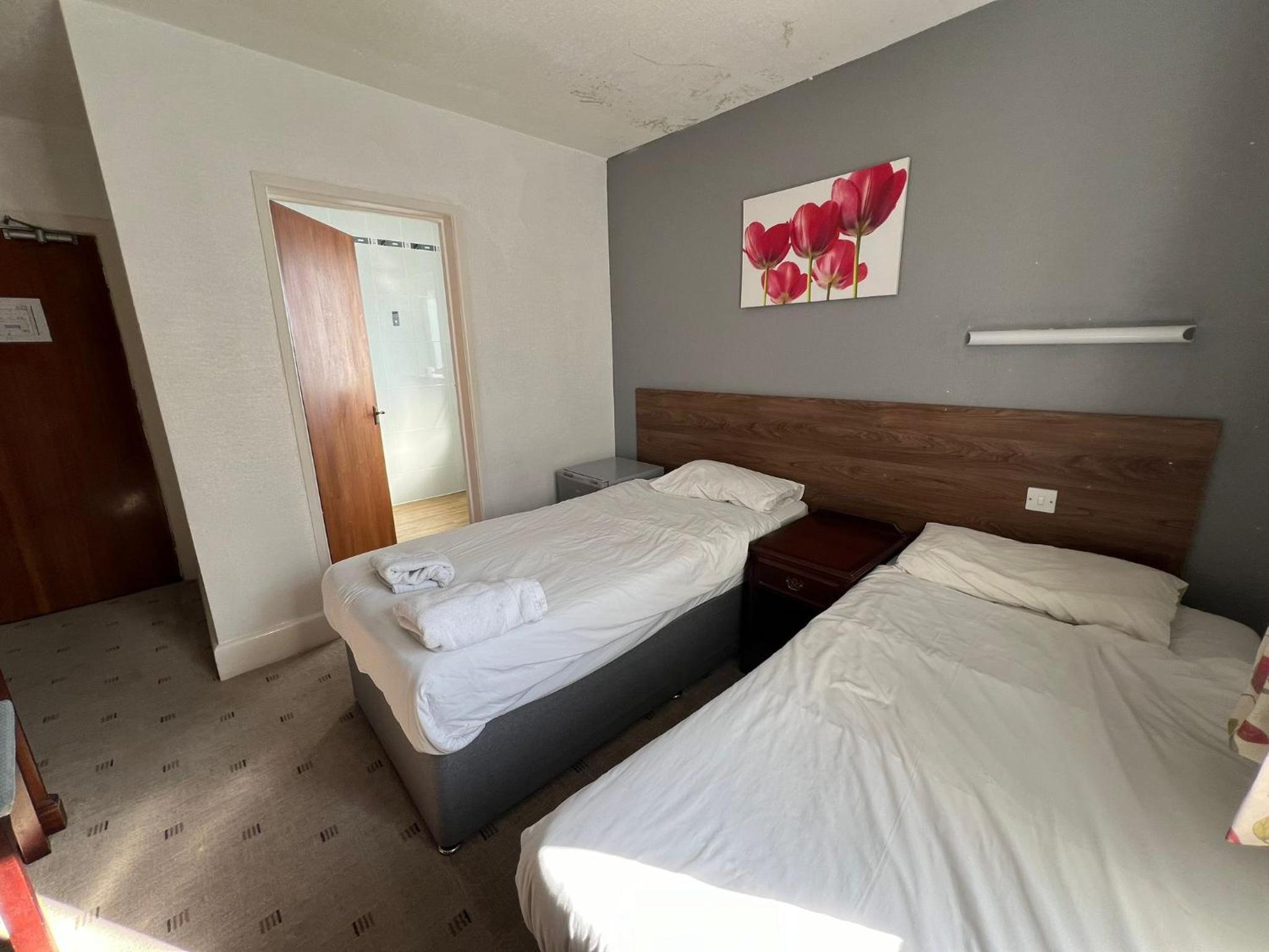 En-suite bedrooms with flat-screen TVs, tea/coffee facilities, and free WiFi throughout the hotel. Pet-friendly rooms available.
