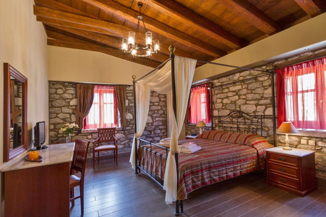 Hotel im griech. Steinhausstil gebaut und direkt am Strand, Hotelzimmer mit dunklen Holzmöbeln ausgestattet, großes Doppelbett und Balkon mit seitlichem Meerblick.