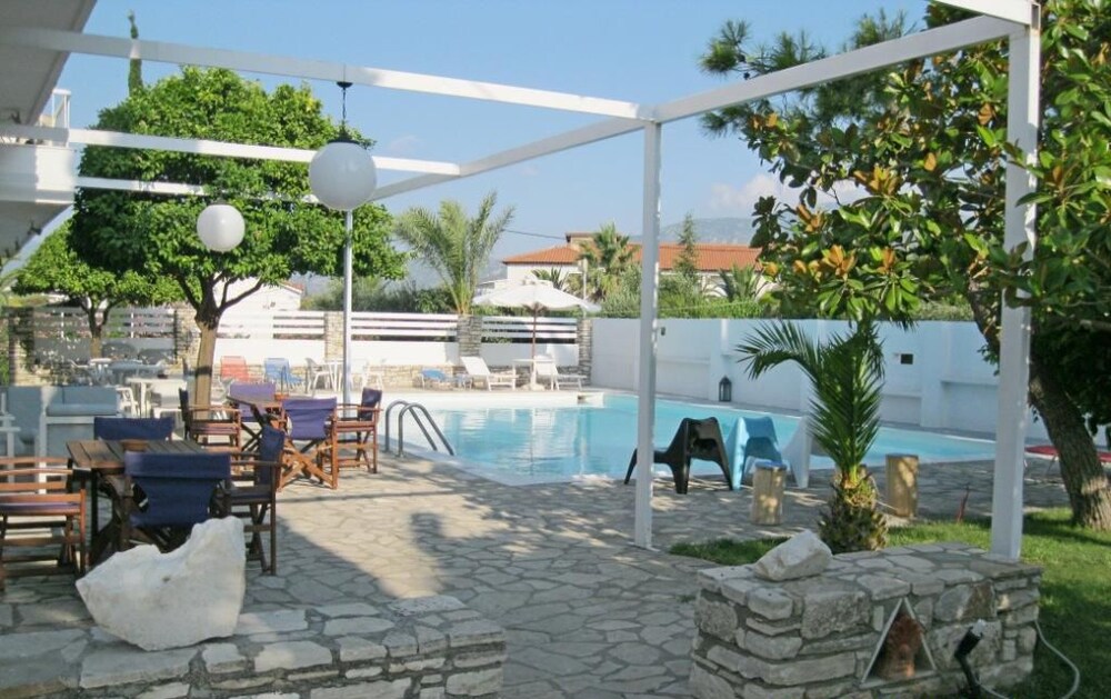 Hotel Apollon features an outdoor pool and an outdoor tennis court for guests to enjoy under the sun.