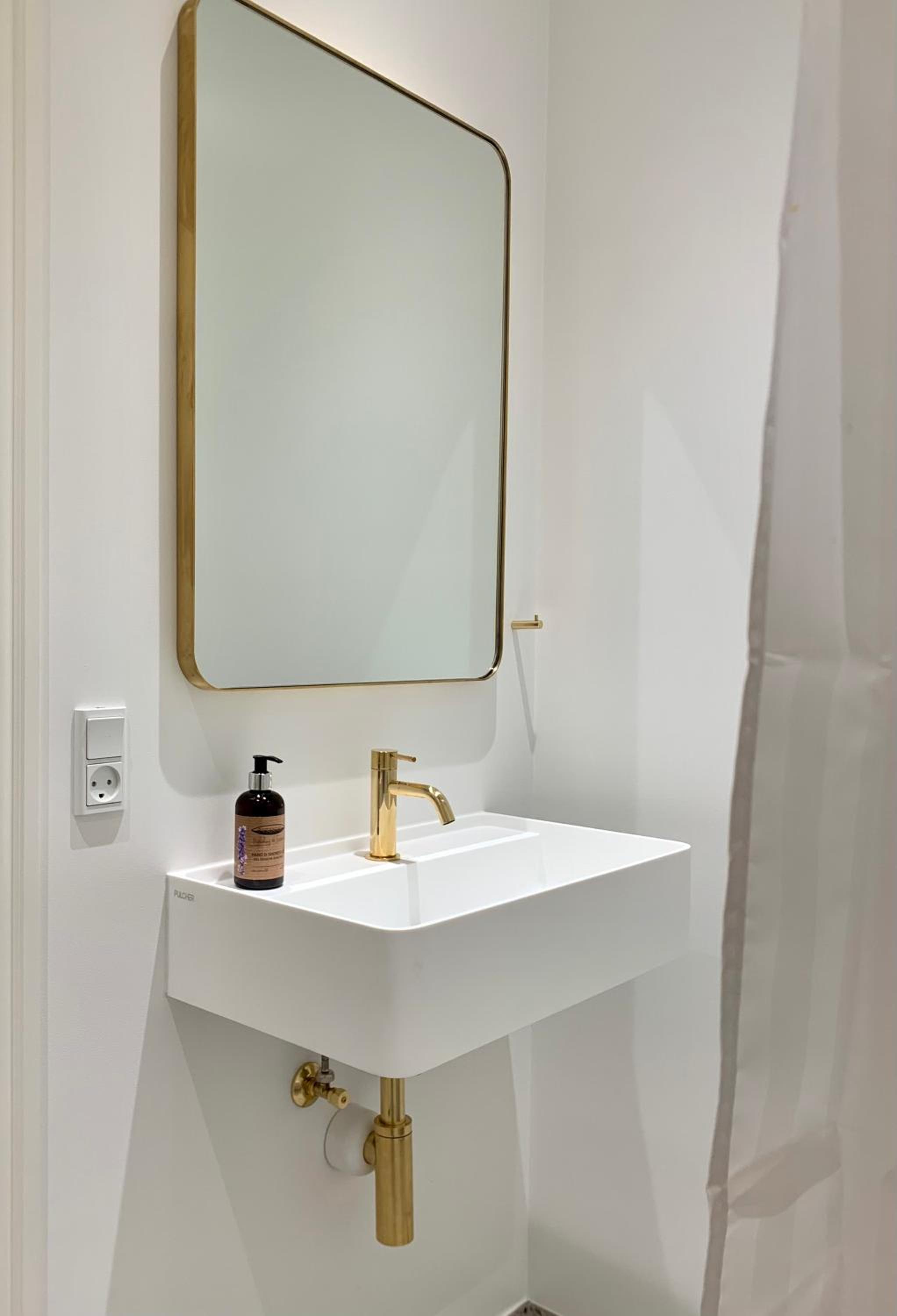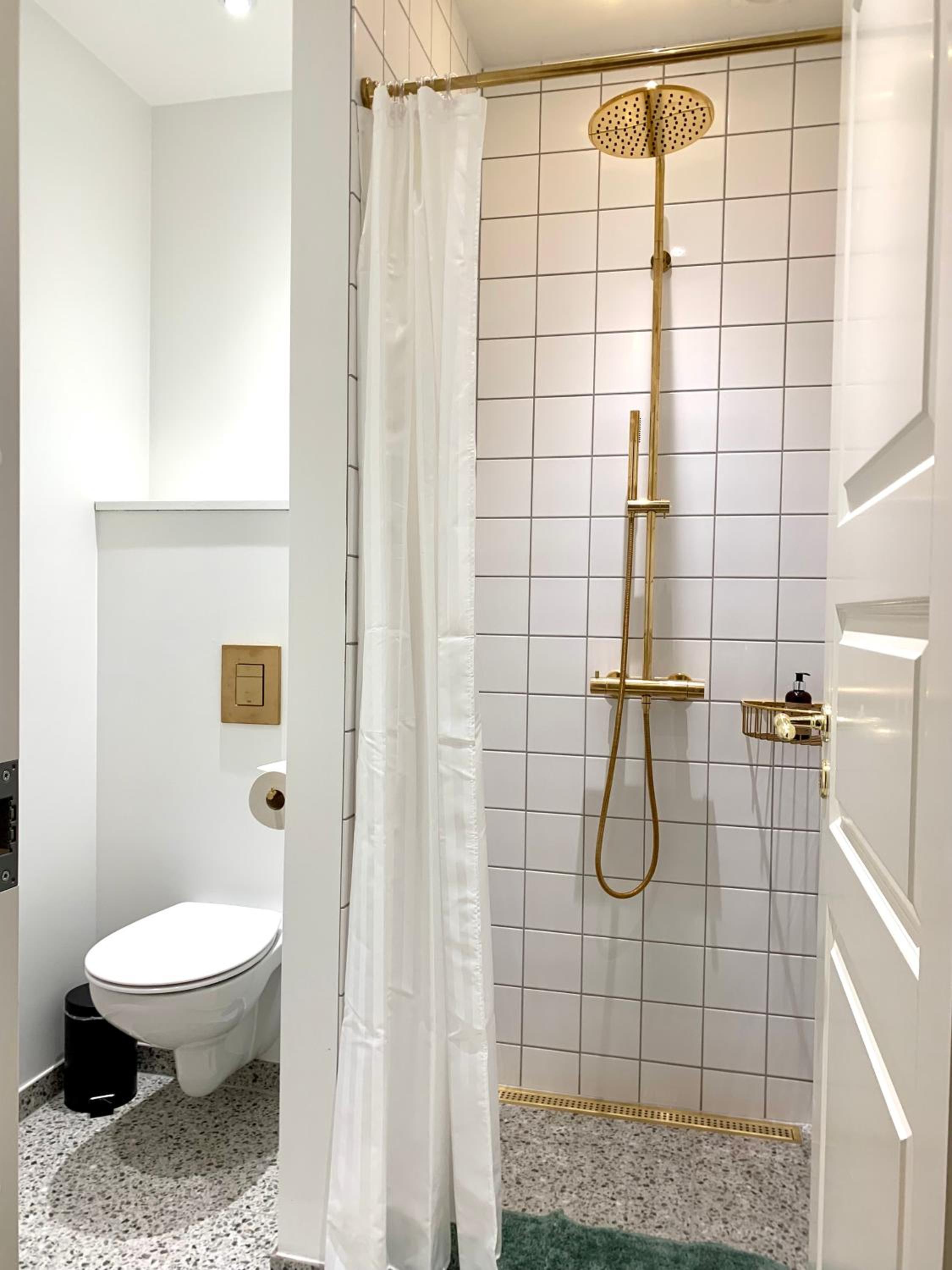 Badeværelse: her savnede jeg mulighed for ophængning af våde håndklæder og aflægningsplads til toiletsager, når man står ved spejlet.