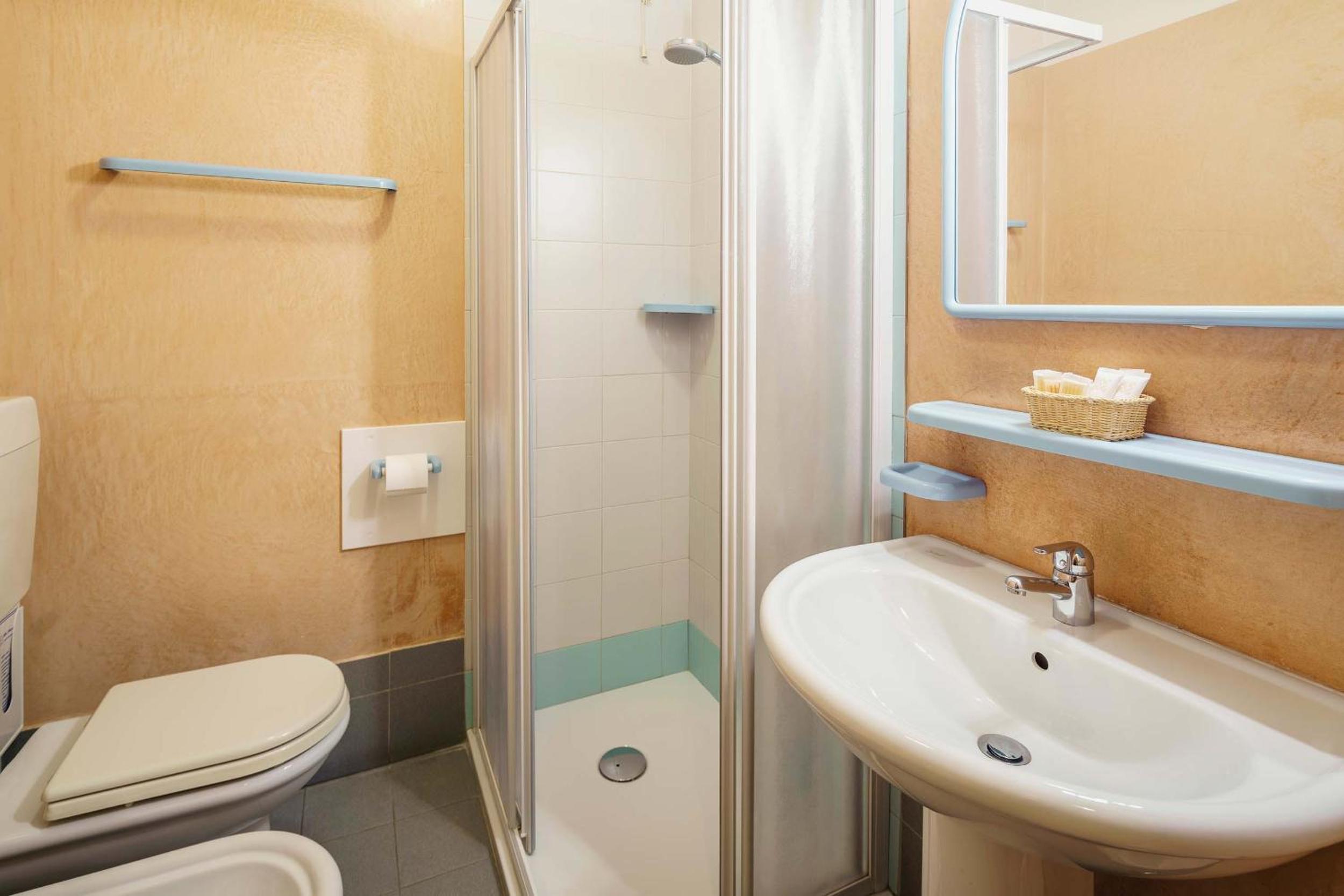 Bagno un pochino stretto, con poco spazio davanti ai sanitari.