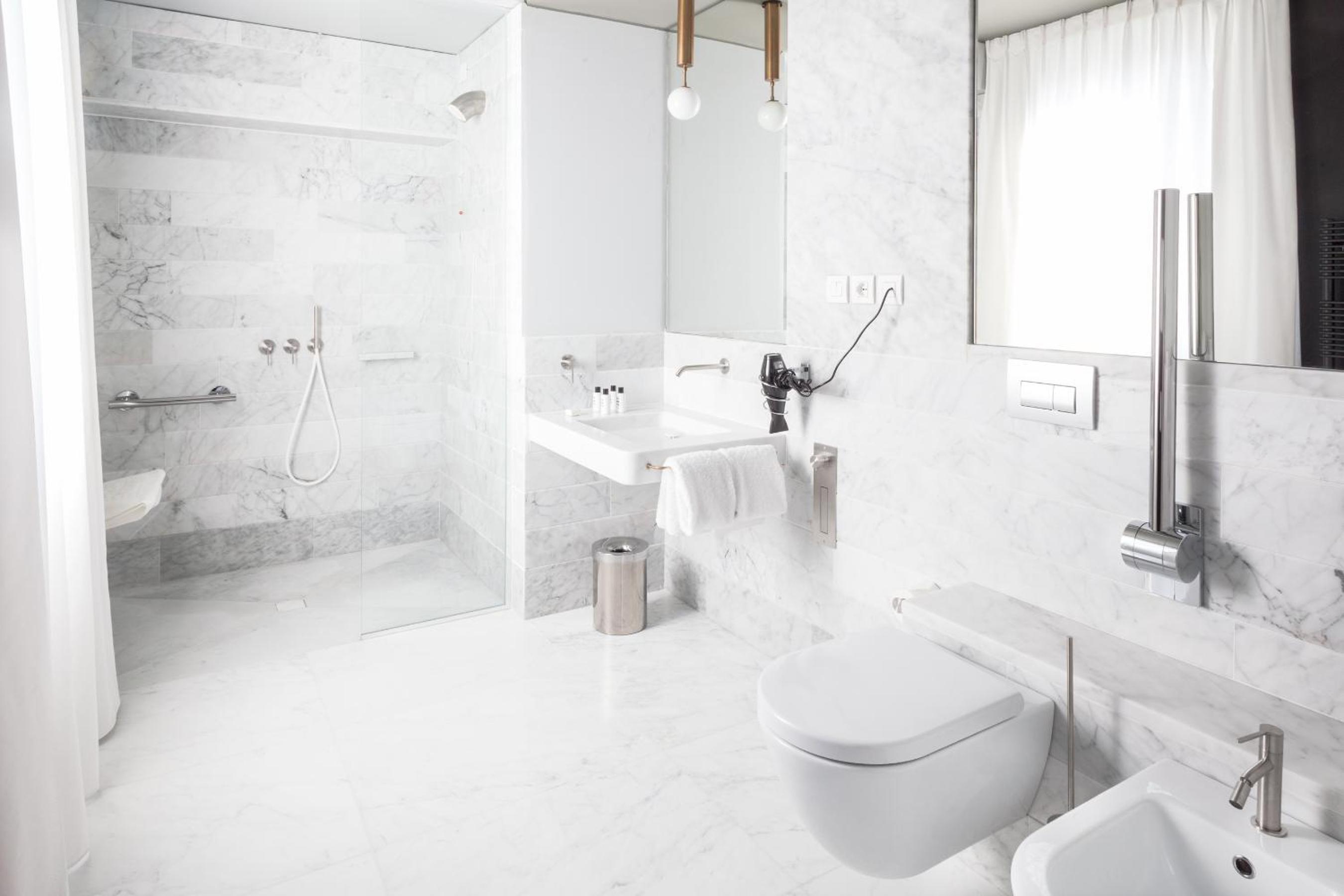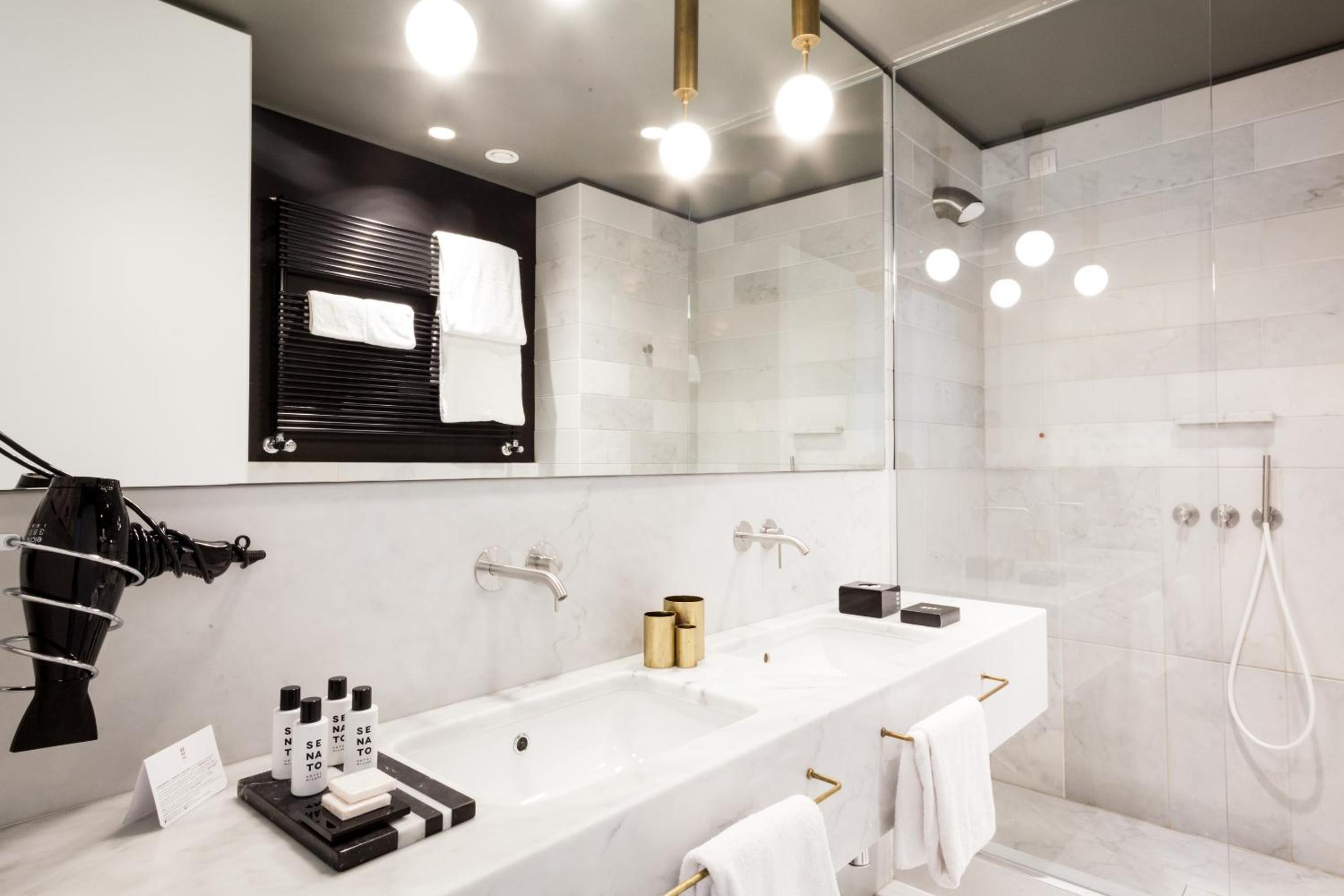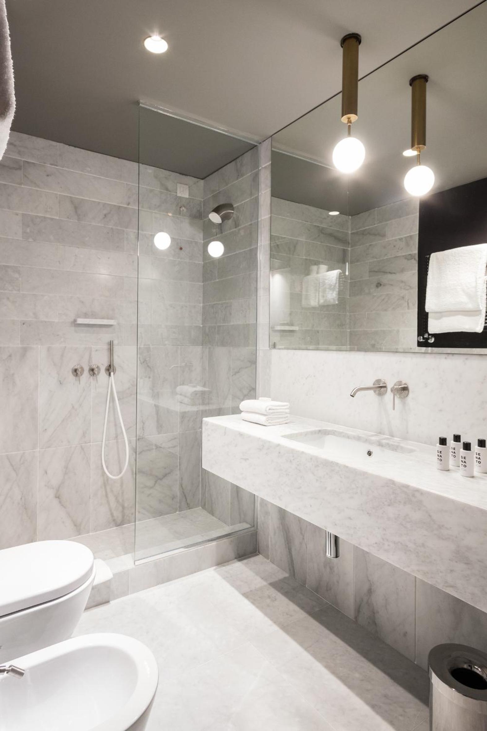 Luxurious Amenities: Senato Hotel Milano offers air-conditioned rooms with high-speed WiFi, flat-screen TVs, and Carrara marble bathrooms. The perfect blend of comfort and sophistication.