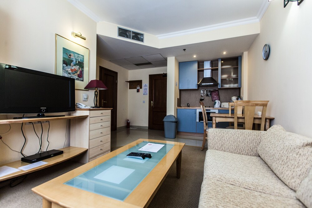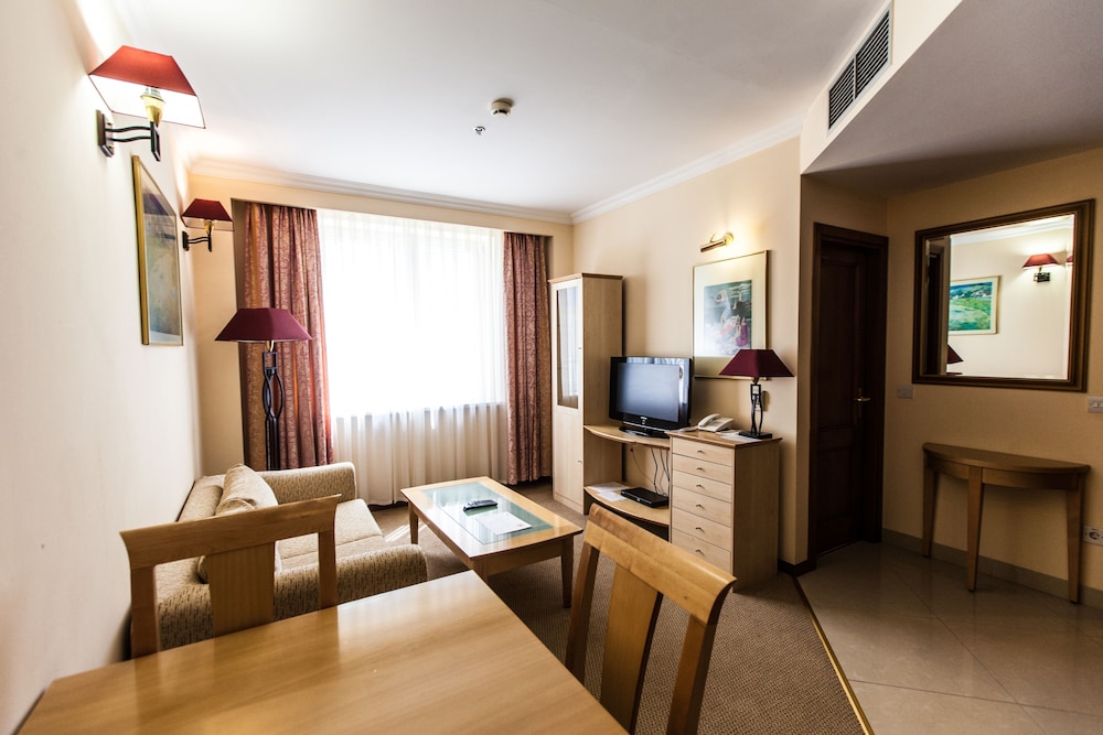We currently live and work in Atyrau. My husband and I wanted a few nights away from the house. We loved the inside of the lobby, room and dining area. Service was good. We were on the third floor (no elevator) and it was quiet. The lobby is separated from the rooms, so you have to walk outside to get to your room. It was secure as you had to have a fob to even get into the building. The room set up was a plus. We had a 2 bedroom, both with full baths, with a living room and kitchen between. Was great as a home away from home. We especially liked the location for the closeness to restaurants. O'Niels', an Irish pub, is a stone throw away, and other restaurants are in easy walking distance. The hotel is located on the river, and there is a river path which can take you even further into town easily. Breakfast was included and was a nice selection! The downside, for my husband, who loves to exercise, was the gym. Equiptment was old and not in working order. As with other buildings in town, you shouldn't judge the inside, by the outside. The inside is great and we would recommend it to others!
