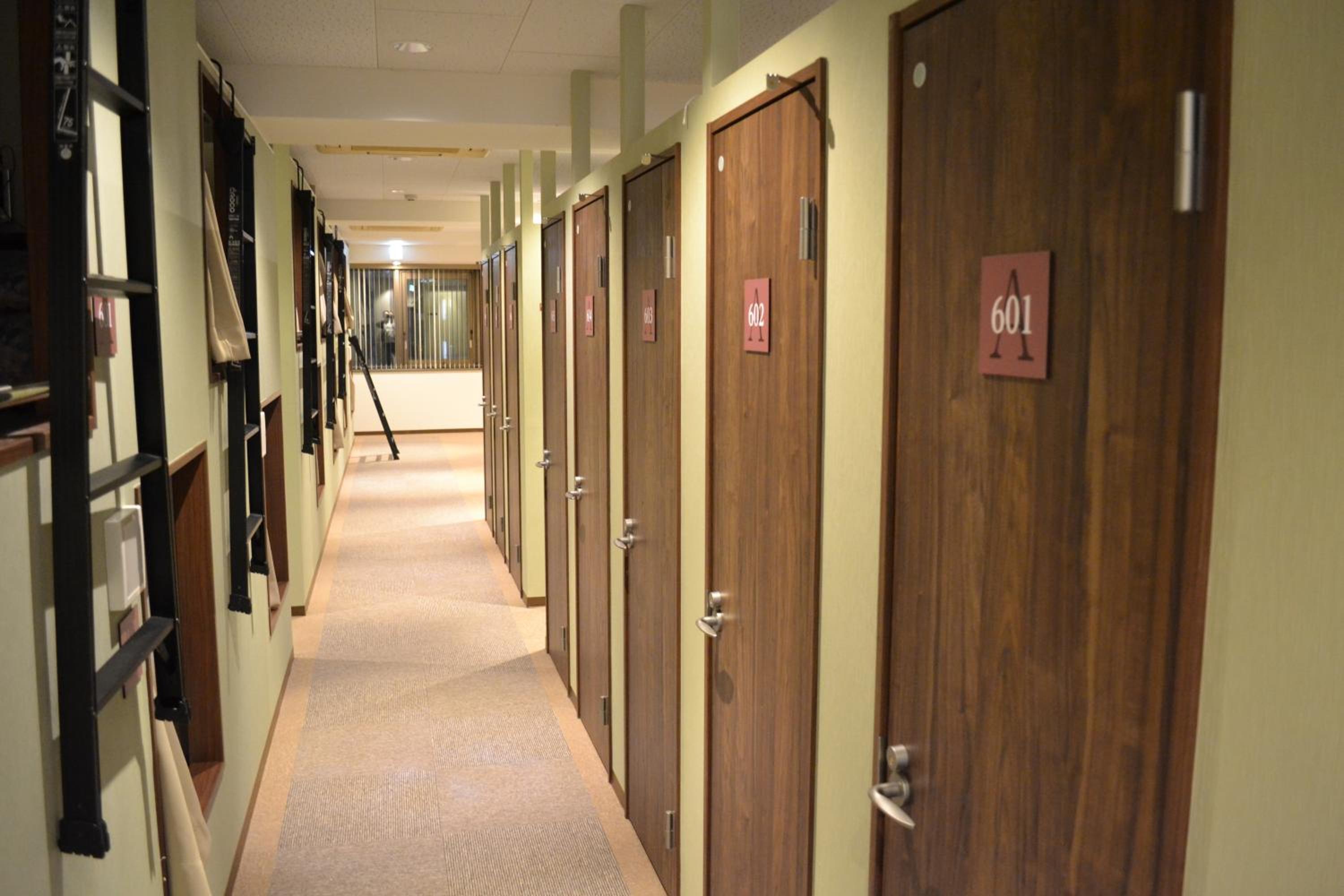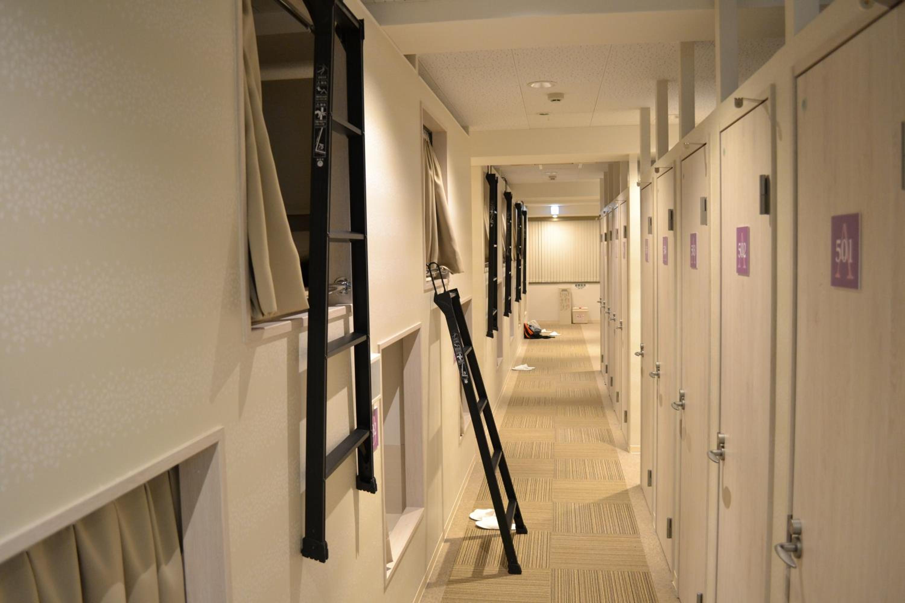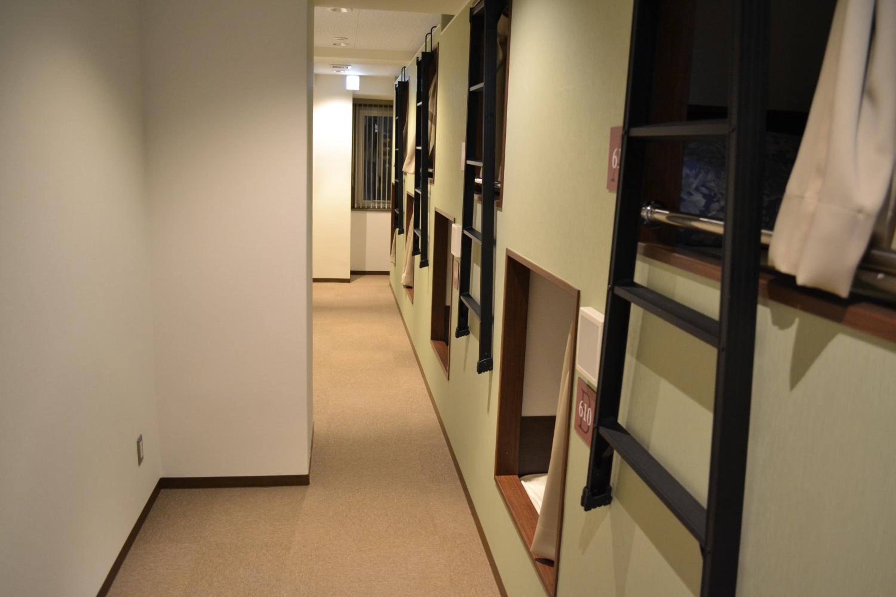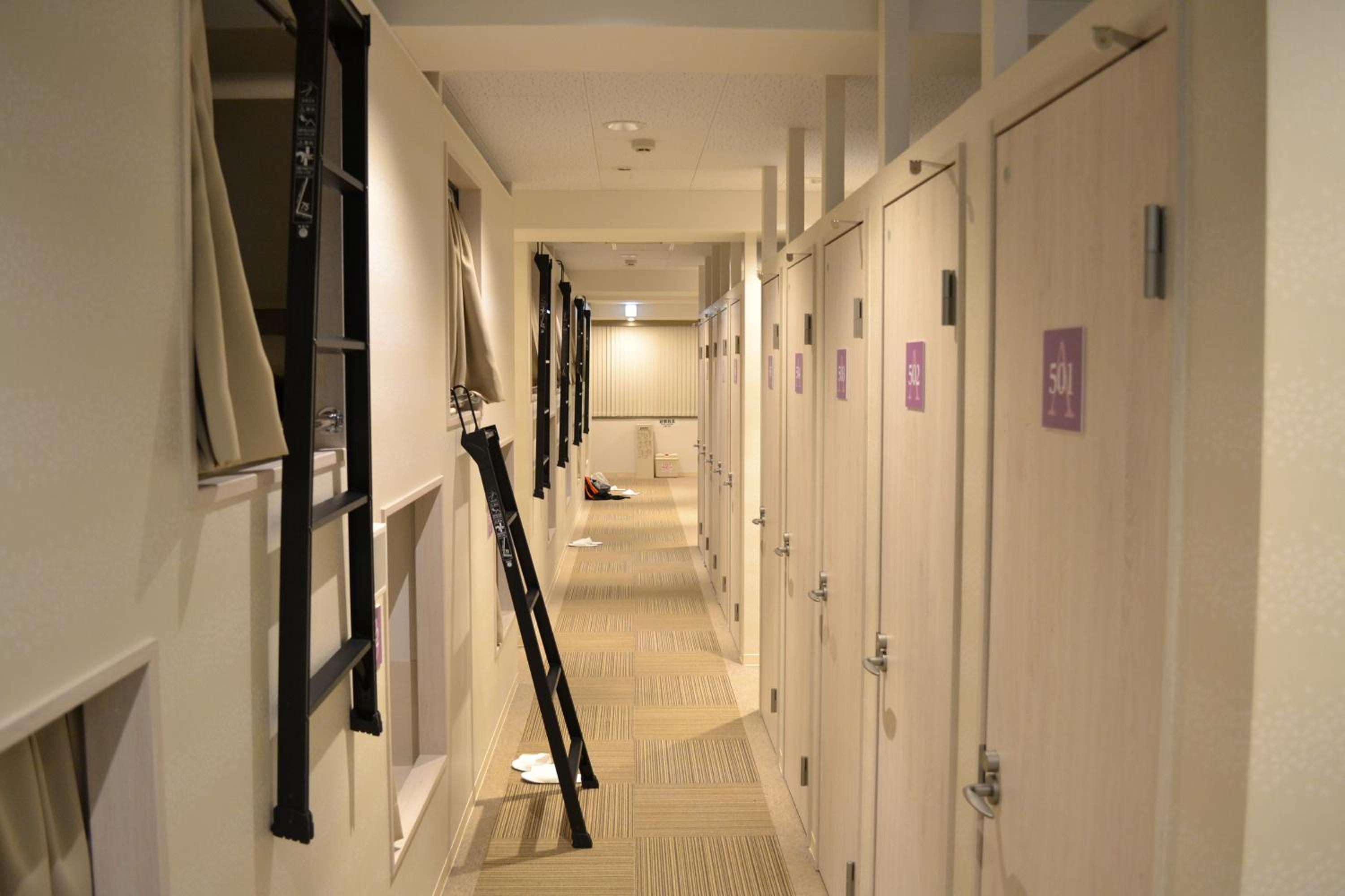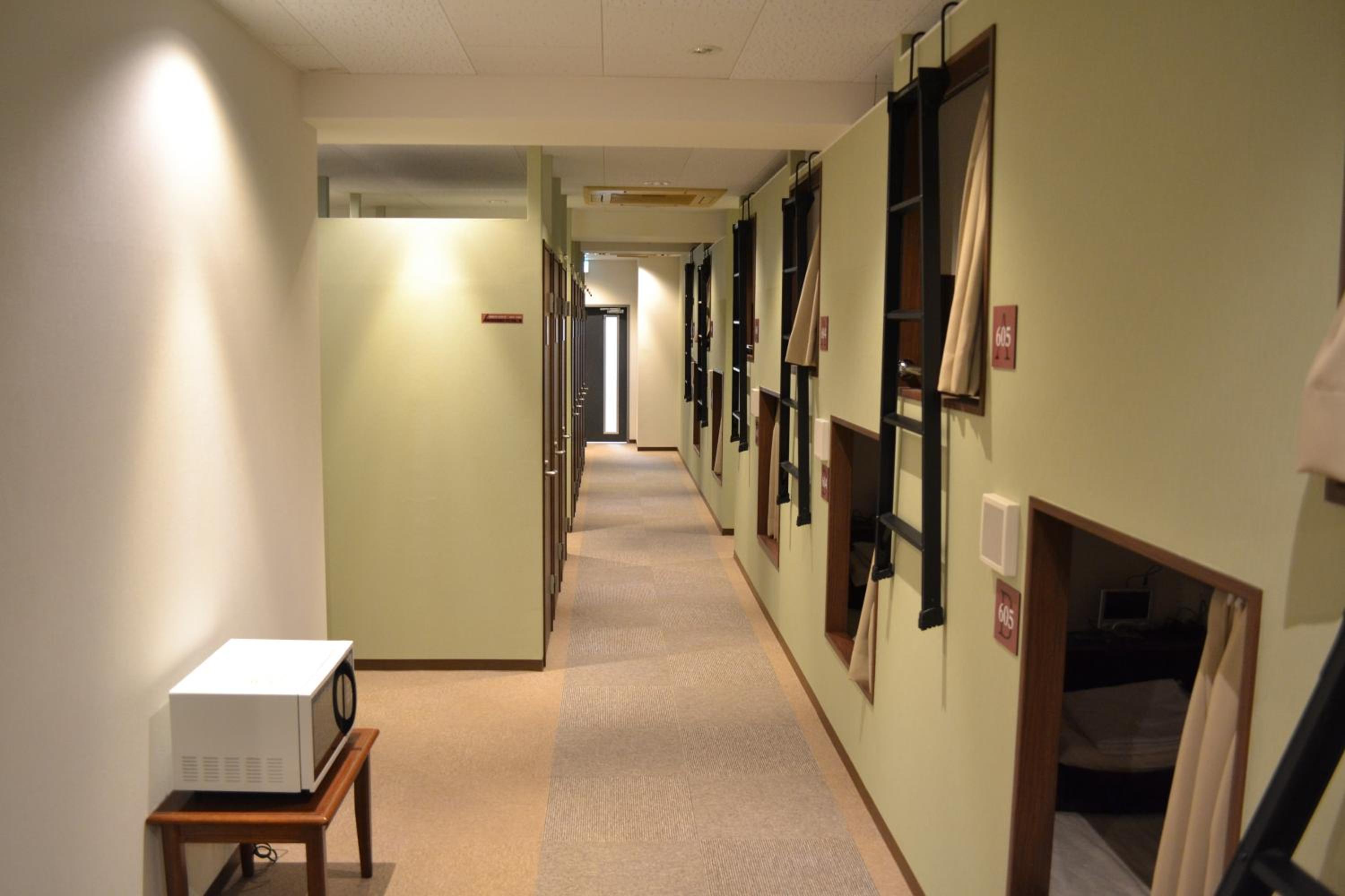 Experience a unique stay in compact sleeping capsules at the hostel. Each guest enjoys a personal locker and access to shared bathrooms equipped with essential amenities. The non-smoking capsule rooms provide a comfortable and private space for a good night's rest.