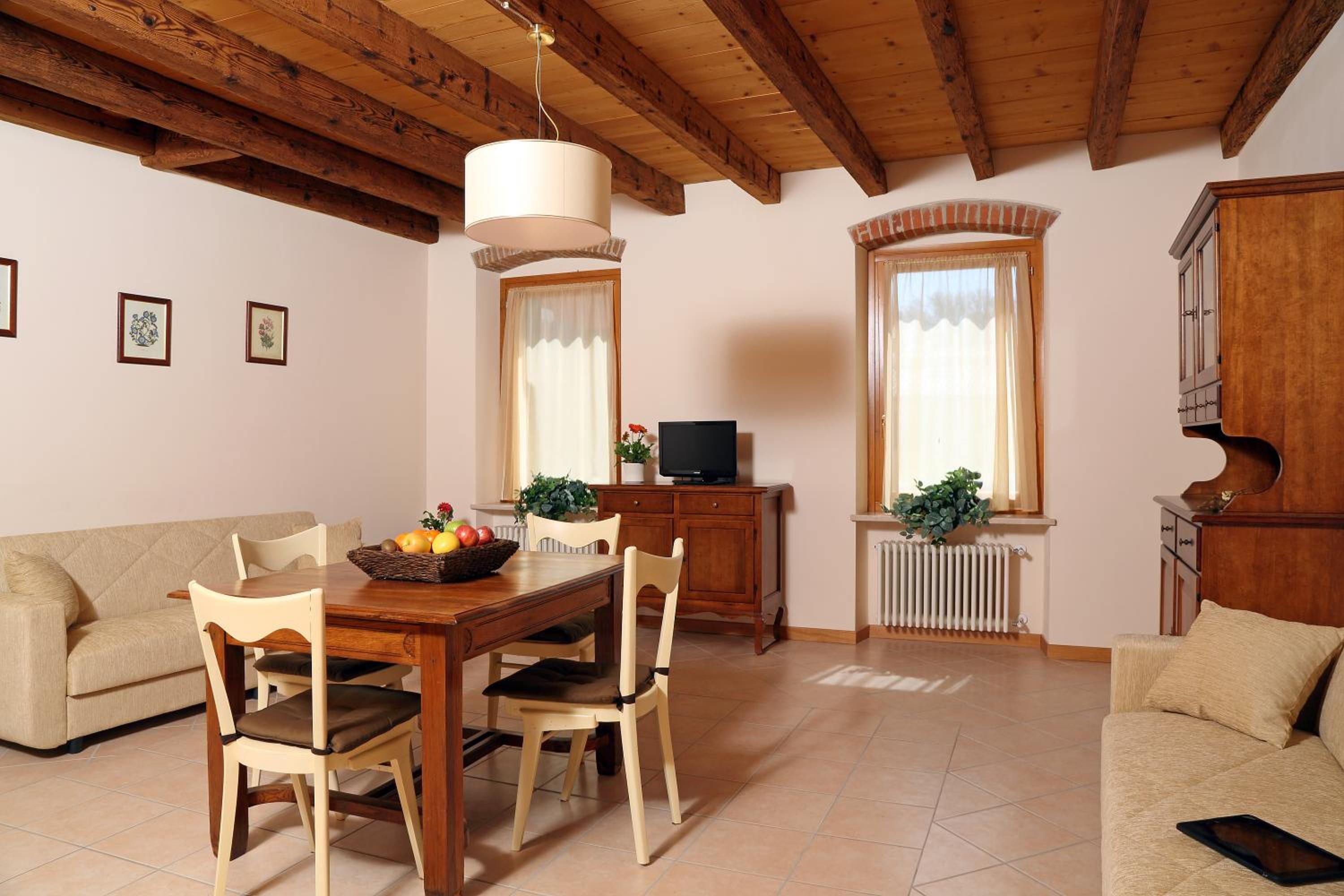 Unwind in country-style apartments featuring exposed-beam ceilings and wrought-iron beds. Each apartment is equipped with a fully fitted kitchenette and a cozy living area.