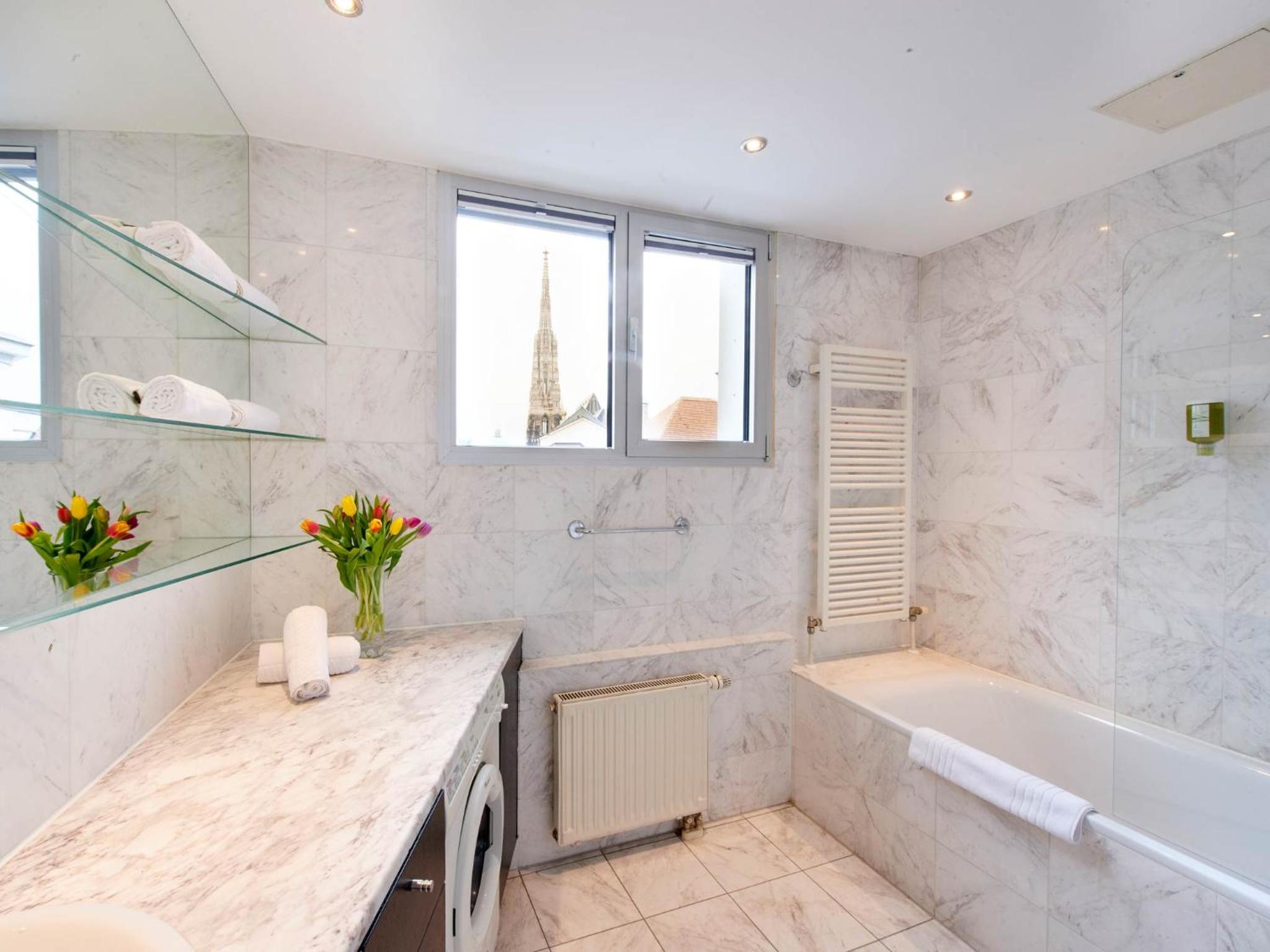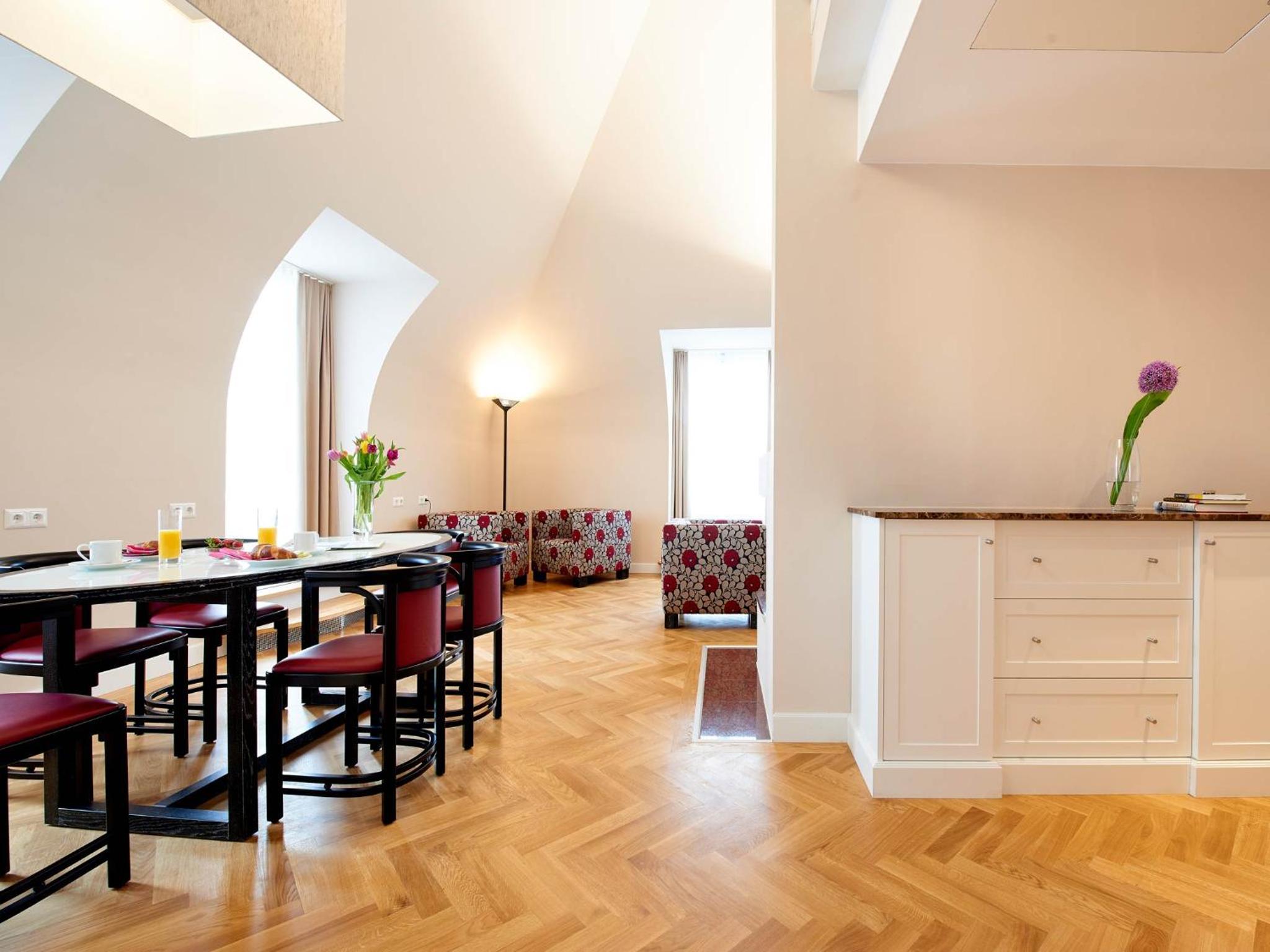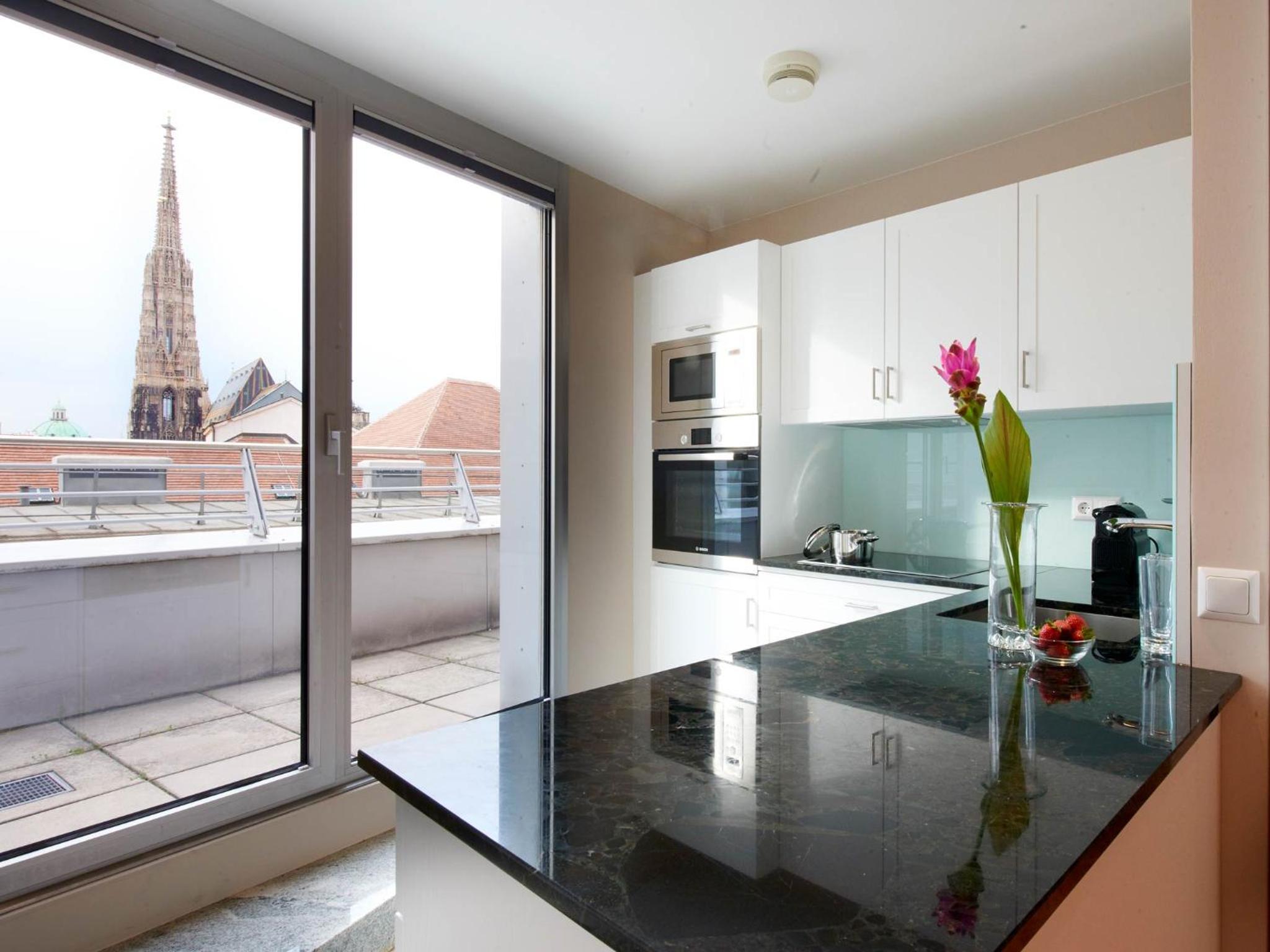 清潔で広い室内。比較的静かな部屋。個別空調。最低限の調理器具が備わっている。シュテファン広場、国立歌劇場等まで徒歩圏内。地下鉄駅から比較的近い。レストランや商店が豊富にある。チェックイン時間より早めに到着したが少し待って部屋に入れてもらえた。
