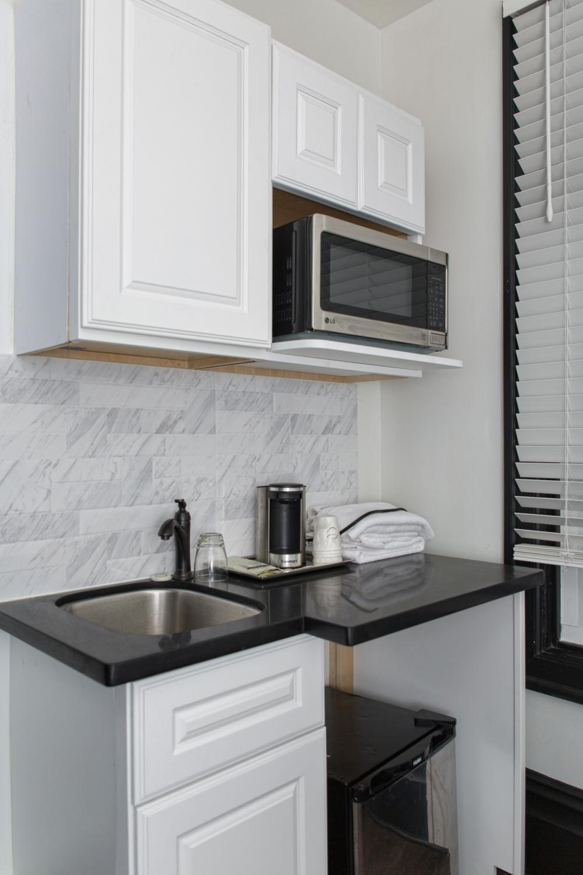 Pros: relatively inexpensive; with a microwave and a minifridge