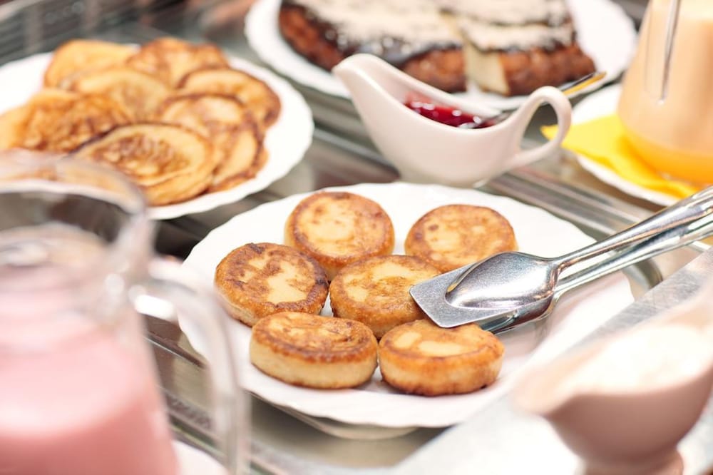 Колбаса, сосиски - дешевые, с неприятным привкусом. Оладьи резиновые. Выпечка - нарезанные подсохшие магазинные кексы.