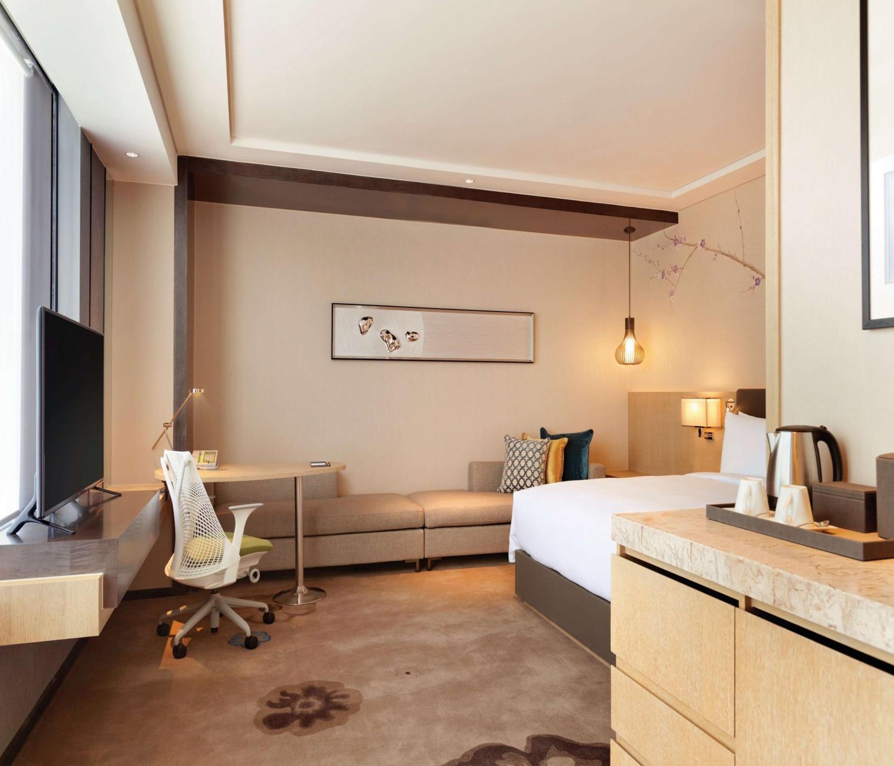 Each room at Hilton Garden Inn Dandong is equipped with modern amenities including a flat-screen TV, private bathroom with complimentary toiletries, and cozy slippers, ensuring a comfortable stay for every guest.