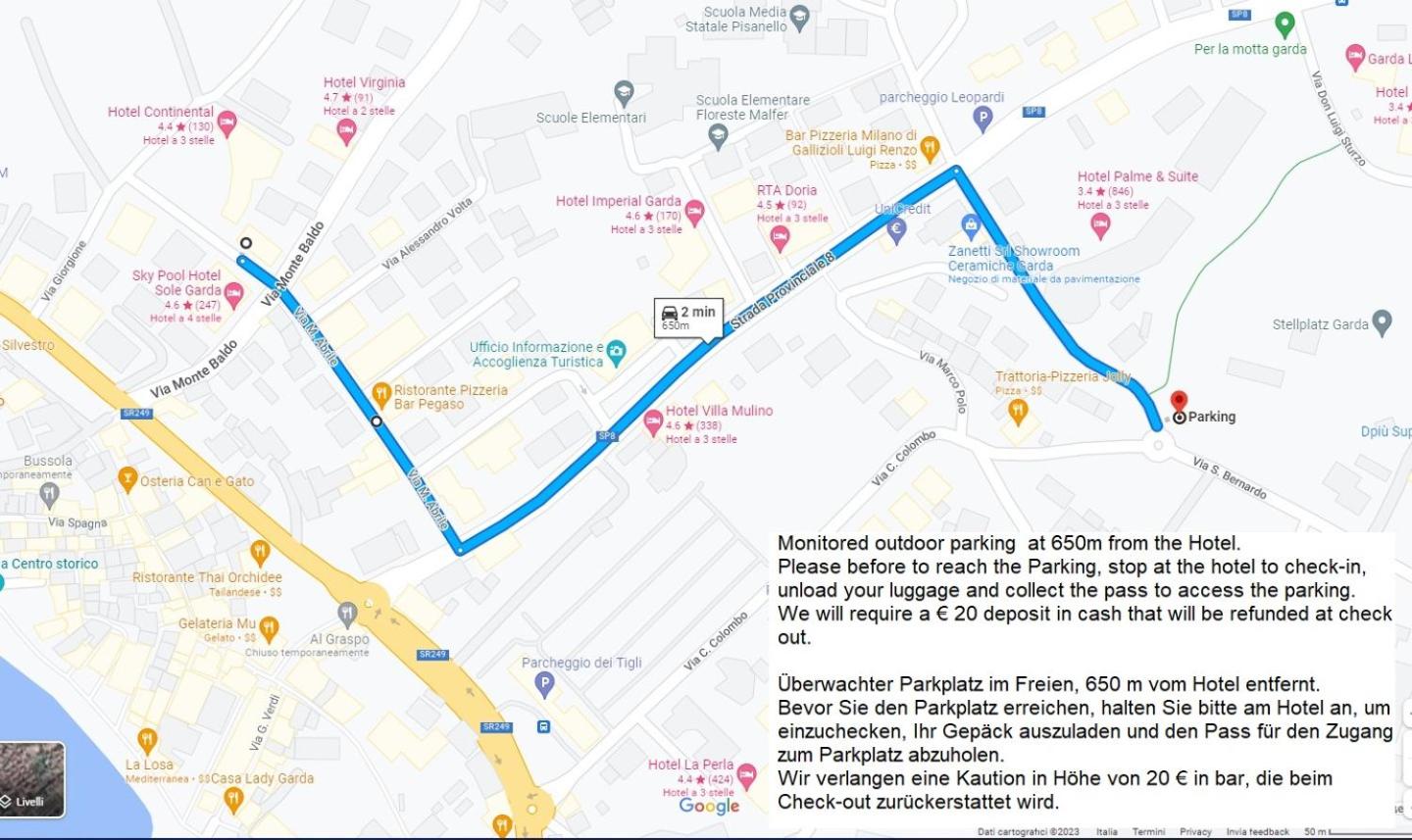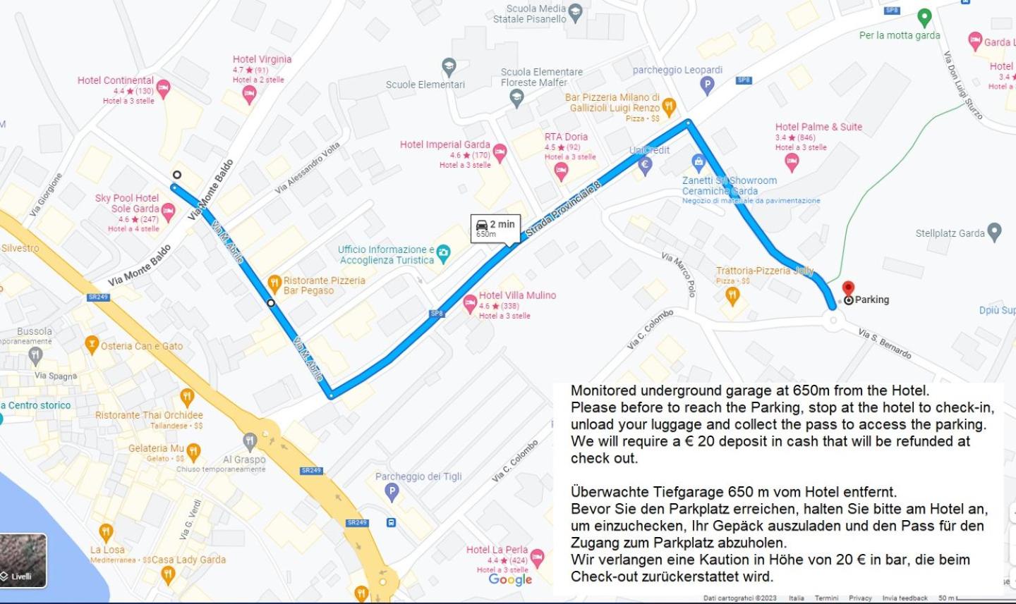 Wenig Parkplätze am Hotel, aber das Parken an einem öffentlichen Parkplatz in Garda funktioniert genauso gut, das Auto ist vom Hotel registriert und kostet nix.