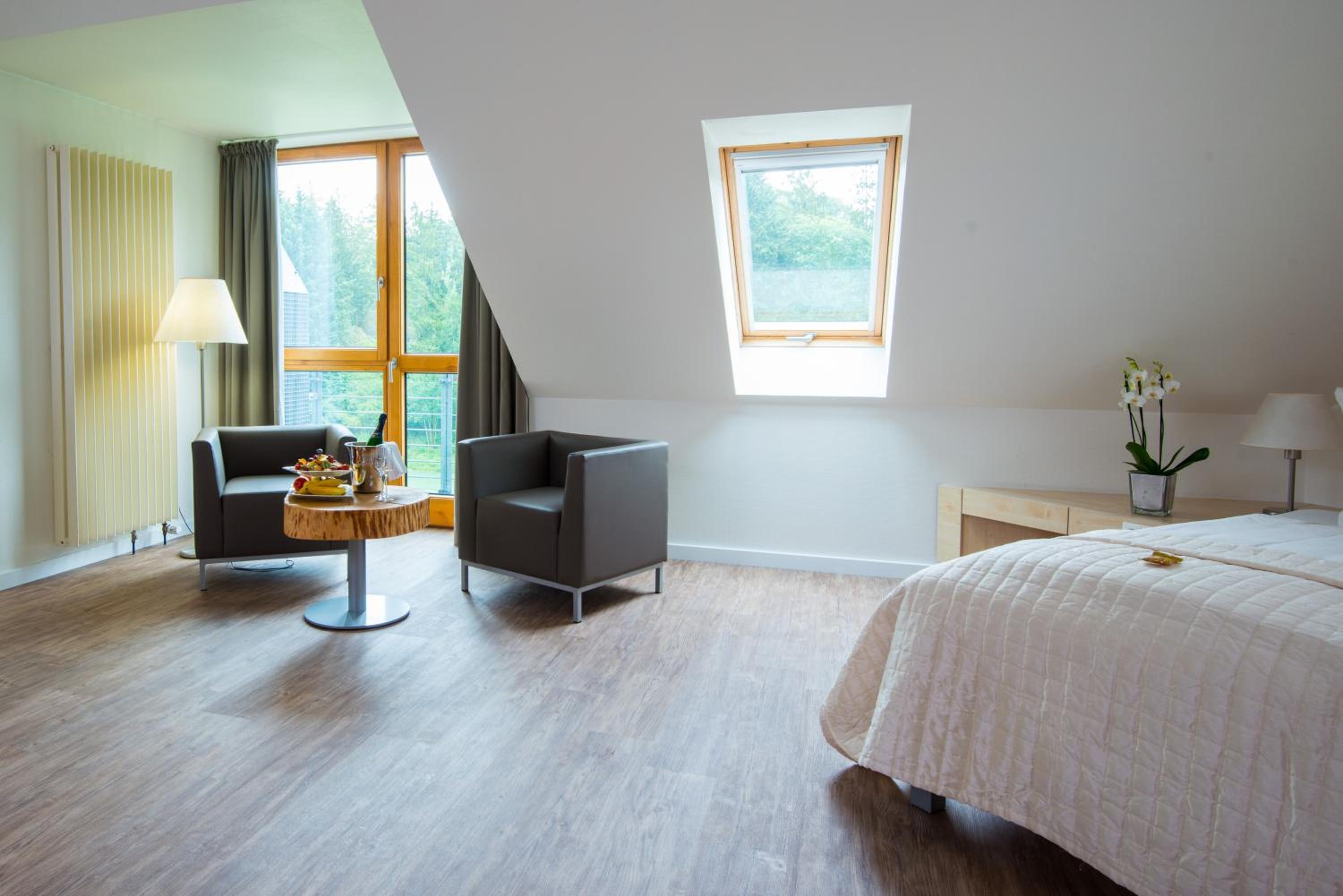 Sehr geräumiges Zimmer. Ausstattung schlicht und funktional aber geschmackvoll. Zimmer und Umfeld (Hotelflure, Lobby, Restaurantbereich, Parkplatz, ...) sehr sauber. Parkplatz TOP!!! - geräumig, zahlreiche Stellplätze und auch mehrere Ladesäu-len für E-Autos. Personal ausgesprochen freundlich und unaufdringlich präsent. Frühstück reichhaltig mit differenziertem Angebot zu einem sehr günstigen Preis. Hotel ruhig am Waldrand gelegen mit (nach unserm Eindruck) zahlreichen Möglich-keiten zum "Füße vertreten". Nachts absolut ruhig ohne Straßen- oder Fluglärm, ohne Gebimmel oder sonstige Schallquel-len (das Hotel ist nach unserem Eindruck auch nicht "hellhörig"), die einen erholsamen Schlaf stören könnten.