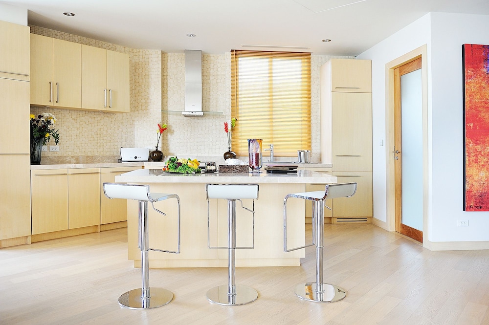 Fantastic hotel on the beginning of a 6 km long golden sandy beach. The "rooms" are spacious apartments with 1 or 2 bedrooms and 1 or 2 bathrooms. The complex was built in 2010 and consists of 9 apartments that are maintained by a staff serving you breakfast, cleaning your apartment, running the lobby and a pool bar between 4-6 pm. It's perfect for couples or families that want to get away from the crowds. The location is at the begnning of the beach and you need to walk a couple of hundred meters before you get onto the "real" beach. That stretch is good to walk on the beach at low tide but an adventure at high tide, since the tide can differ 2-3 meters depending on the time of the month. 50 meters from the beach is a small local road that is better suited for high tide.... Bang tao village is 500 meters away where you have small scale shopping, bars and restaurants in a friendly setting.