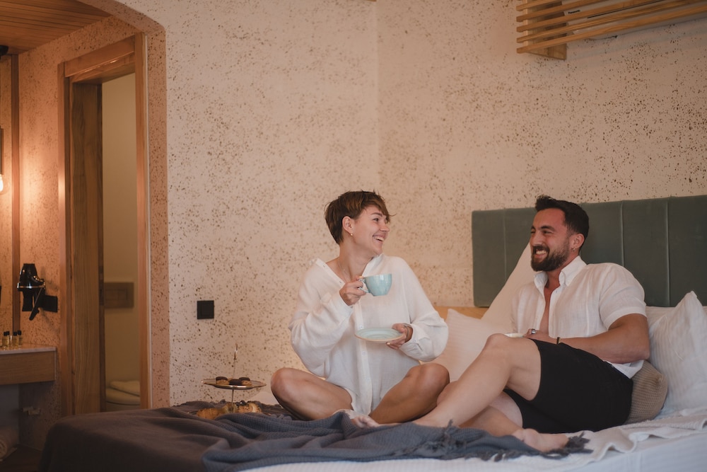 Gerçekten mekanın enerjisi çok huzurluydu. Mimarisi özenle düşünülmüş, çalışanlar güler yüzlü ve sıcak kanlı. Konumu çok ideal. Bizim kendi aracımız vardı ama aracımız olmasaydı da ideal bir konumdaydı. Aracı bazen otelin kendi otoparkına bazen de yol kenarına park ettik. Park sıkıntısı yaşamadık, sanırım çok yoğun sezonda gitmediğimiz içindi. Temizliği gayet iyiydi ufak tefek eksikler vardı sadece. Kahvaltısı yeterli. Yemekler çok lezzetli diyemem ama çok uygun fiyatlıydı. Bizim odamız en üst kattaydı. Balkonda jakuzi bulunduğu için diğer odalara göre daha mahremdi.