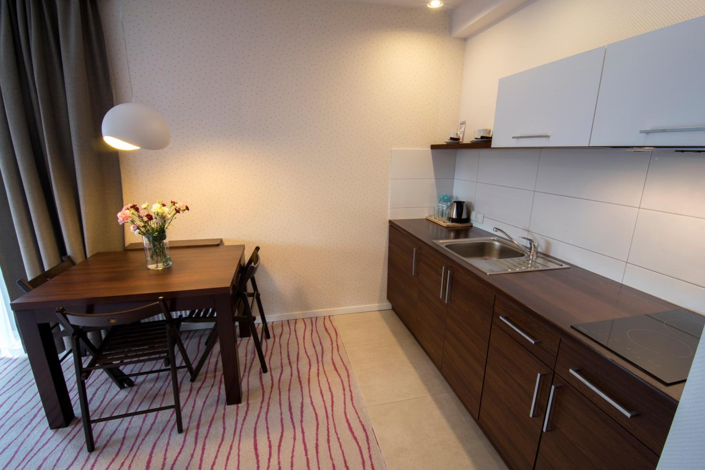 Przestronne pokoje z małym ale wystarczającym aneksem kuchennym.