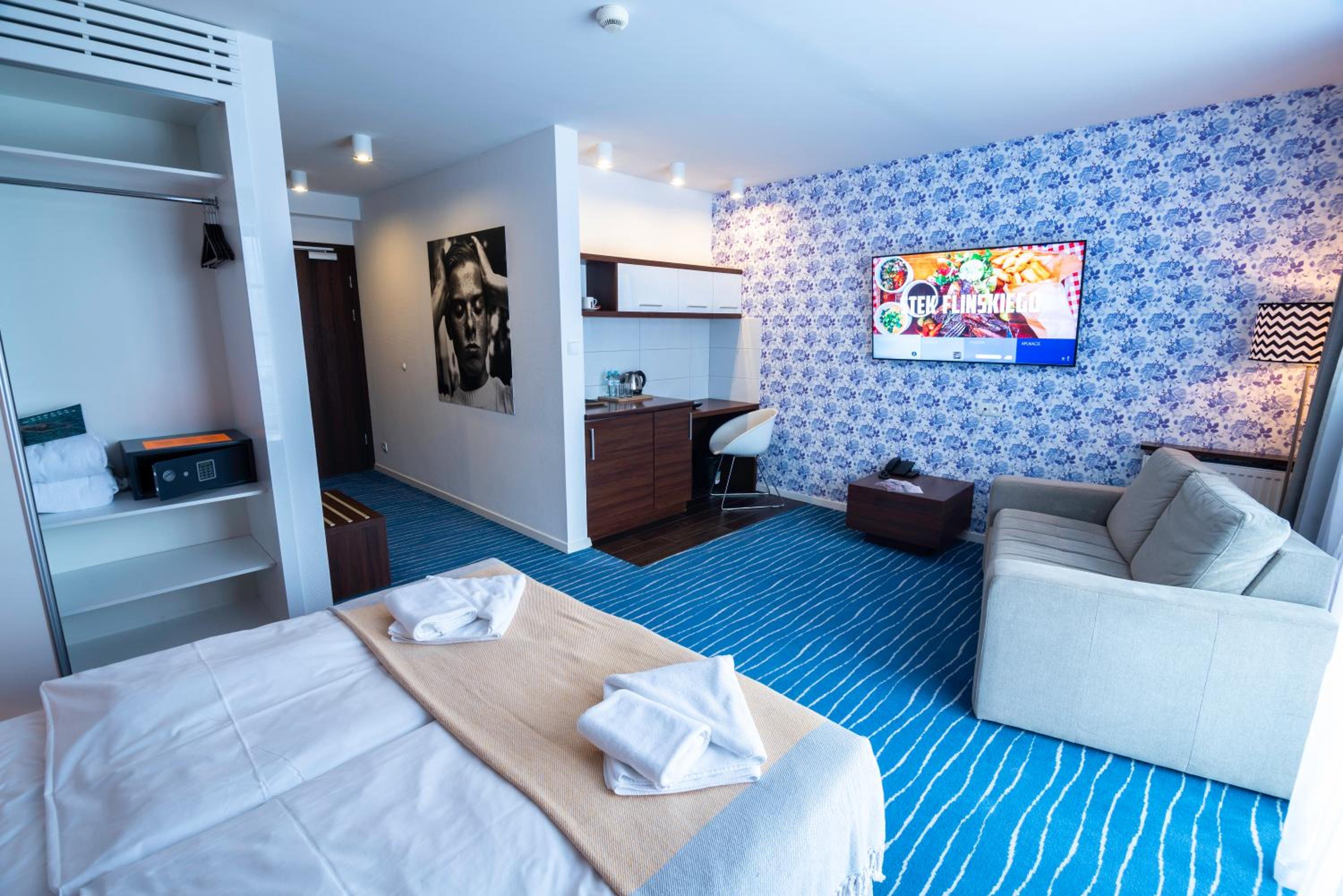 Jedynie trochę zaskakujące a wręcz niegustowne grafiki nad łóżkiem🤔 no I szalona tapeta