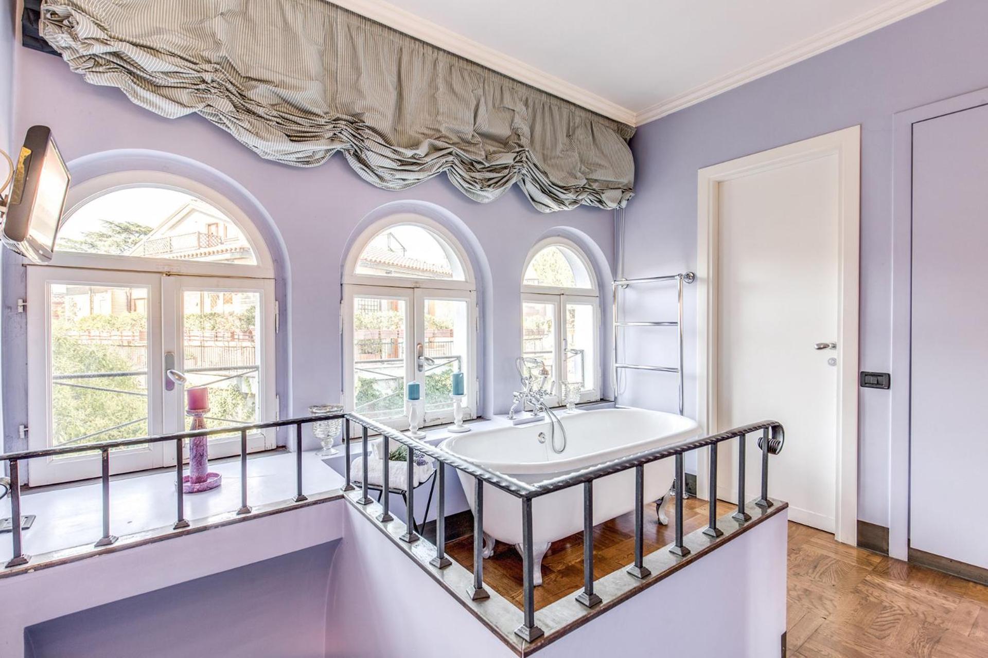 Surrounded by a charming garden featuring tables, chairs, and sun loungers, Villa Linneo provides a serene escape in the bustling city of Rome. Guests can unwind amidst nature's beauty, perfect for relaxation after a day of exploring the historic center and nearby attractions.